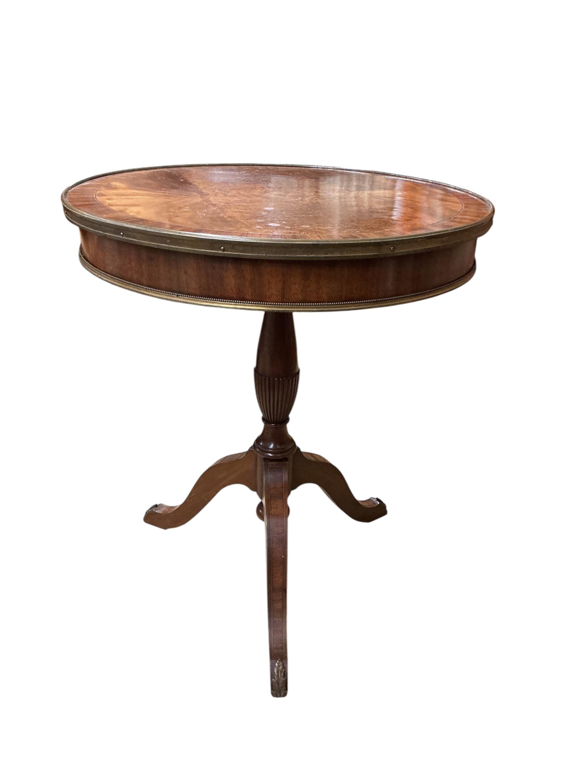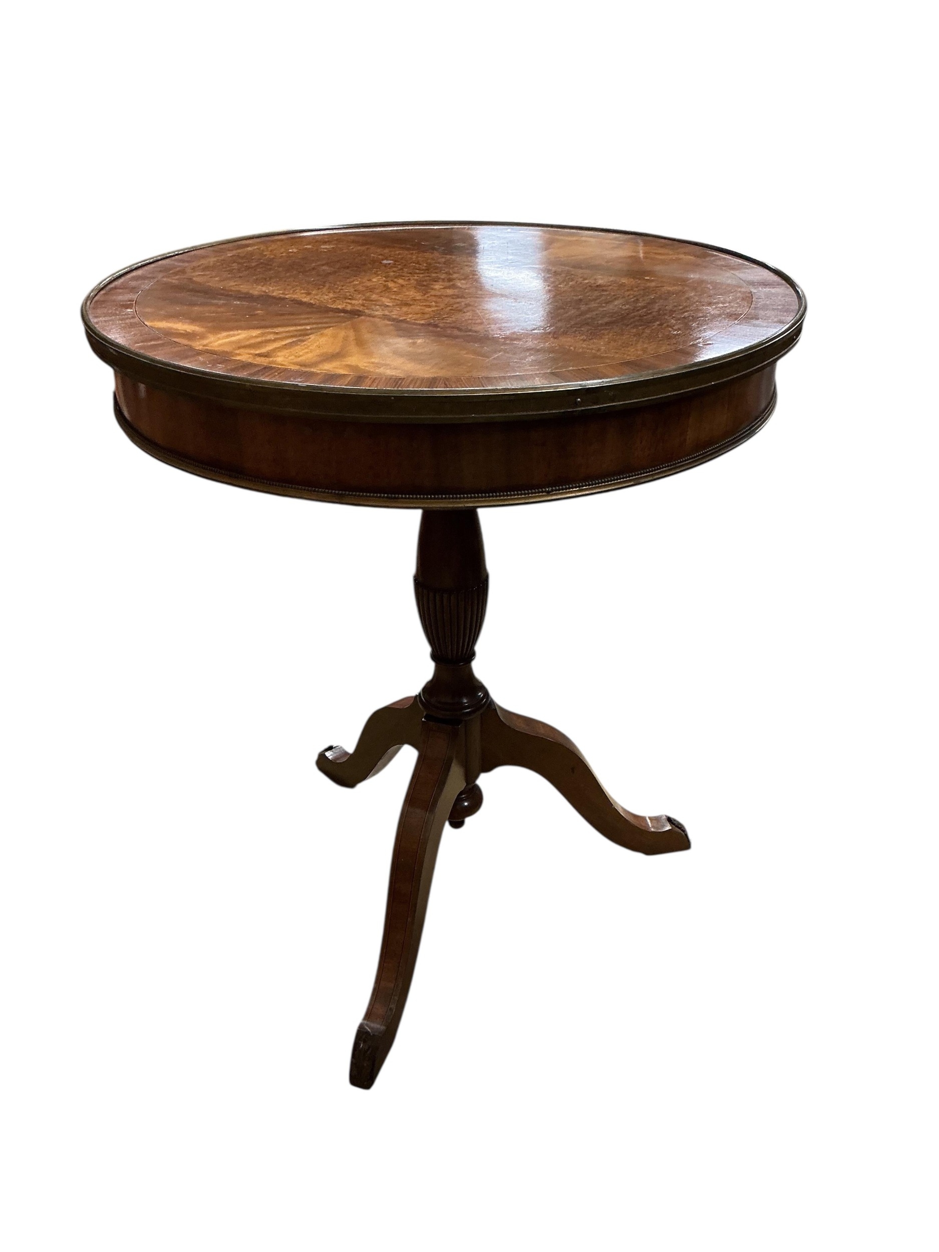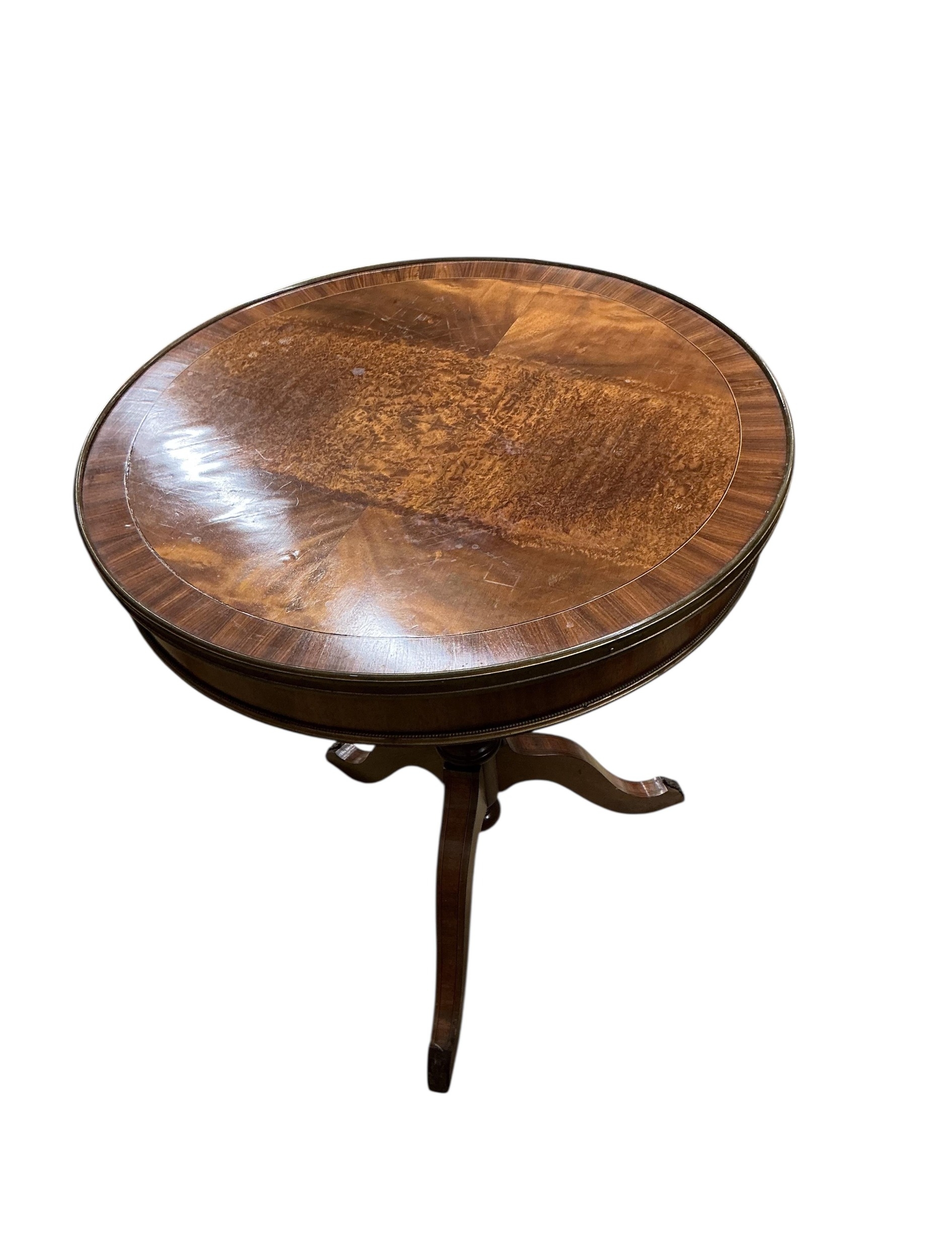 A George III style circular banded mahogany centre table, diameter 60cm, height 70cm
