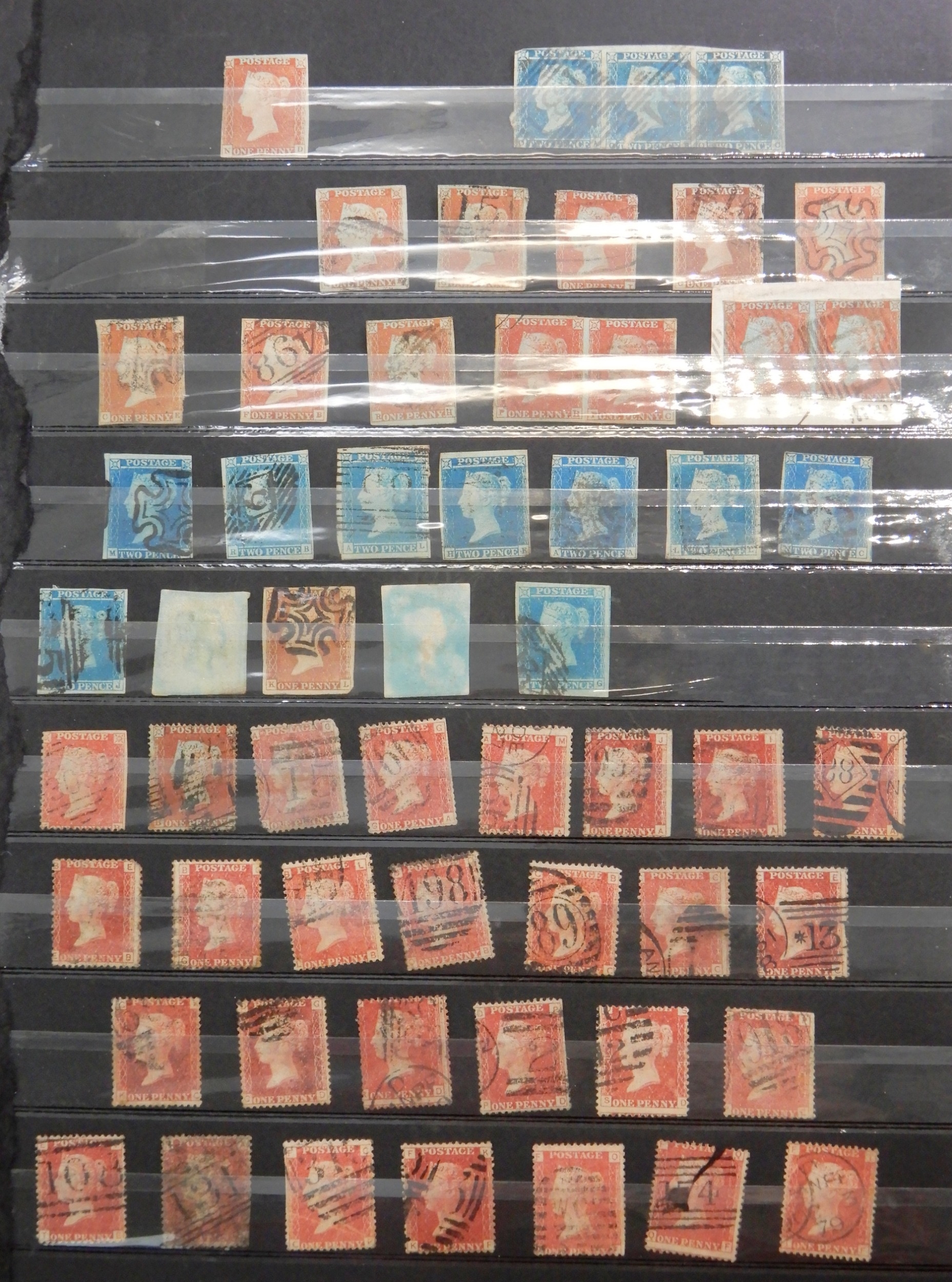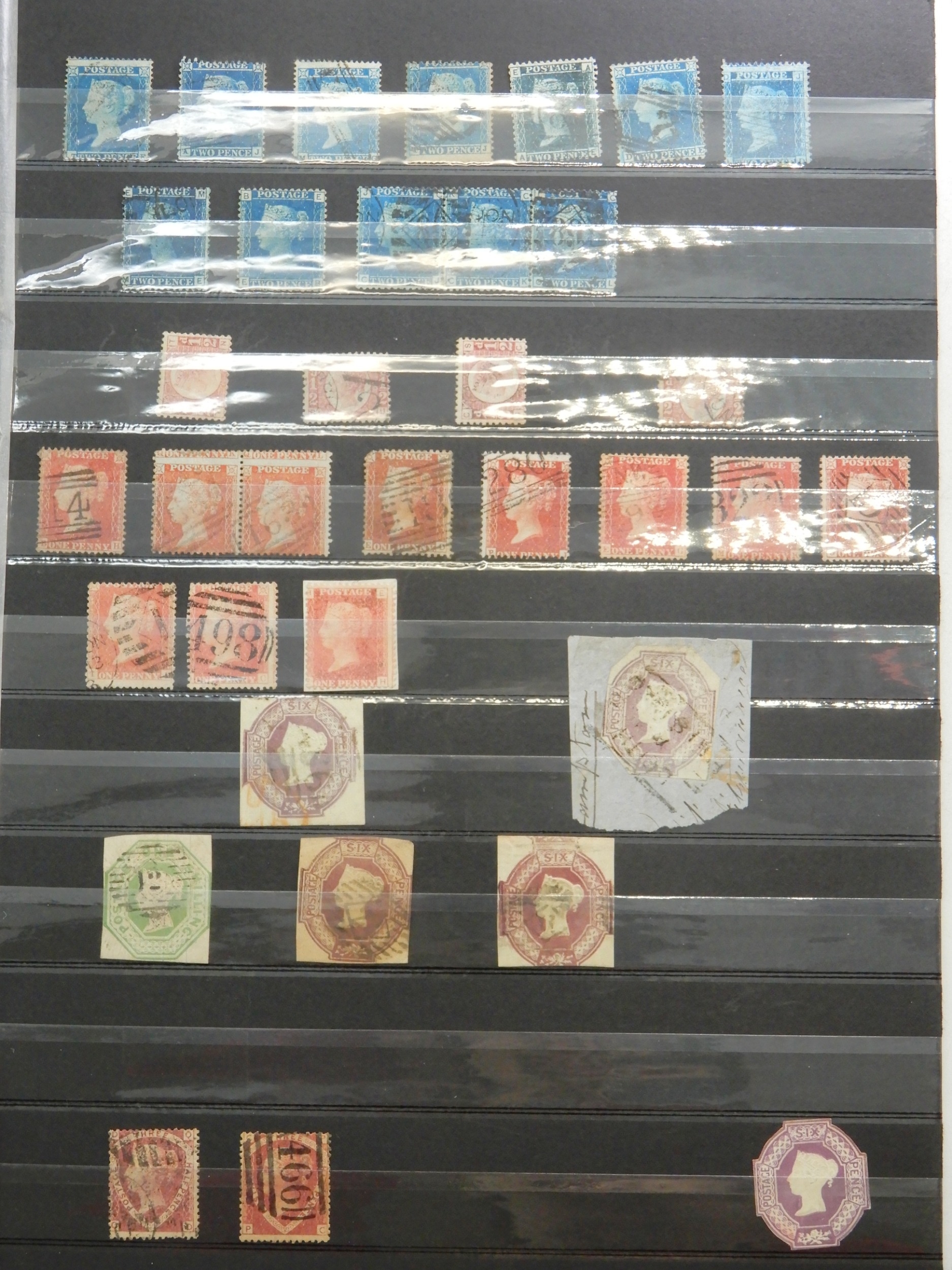 Great Britain Collection of Line engraved and Embossed Stamps on 2 and a half Stock Book Pages inc. 1841 1d red imperfs includind some 4 margin, and 1 unysed with 3 margins {no Gum), a few 1841 2d blue inc a strip of 3, mixed condition, various 1d reds perforated , Various 2d blue inc a strip of 3 plate 14, both plates of 1 1/2 d , 4 times 6d embossed, and 1 1/- embossed. and 2 1/2 d unused but with some gum, Plate 11 and 13. well worth looking at. With High Cat Value