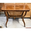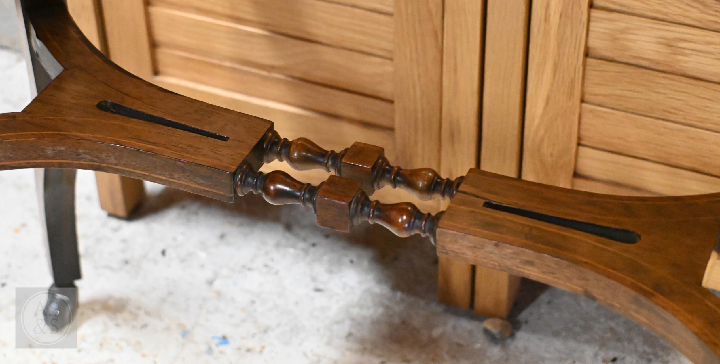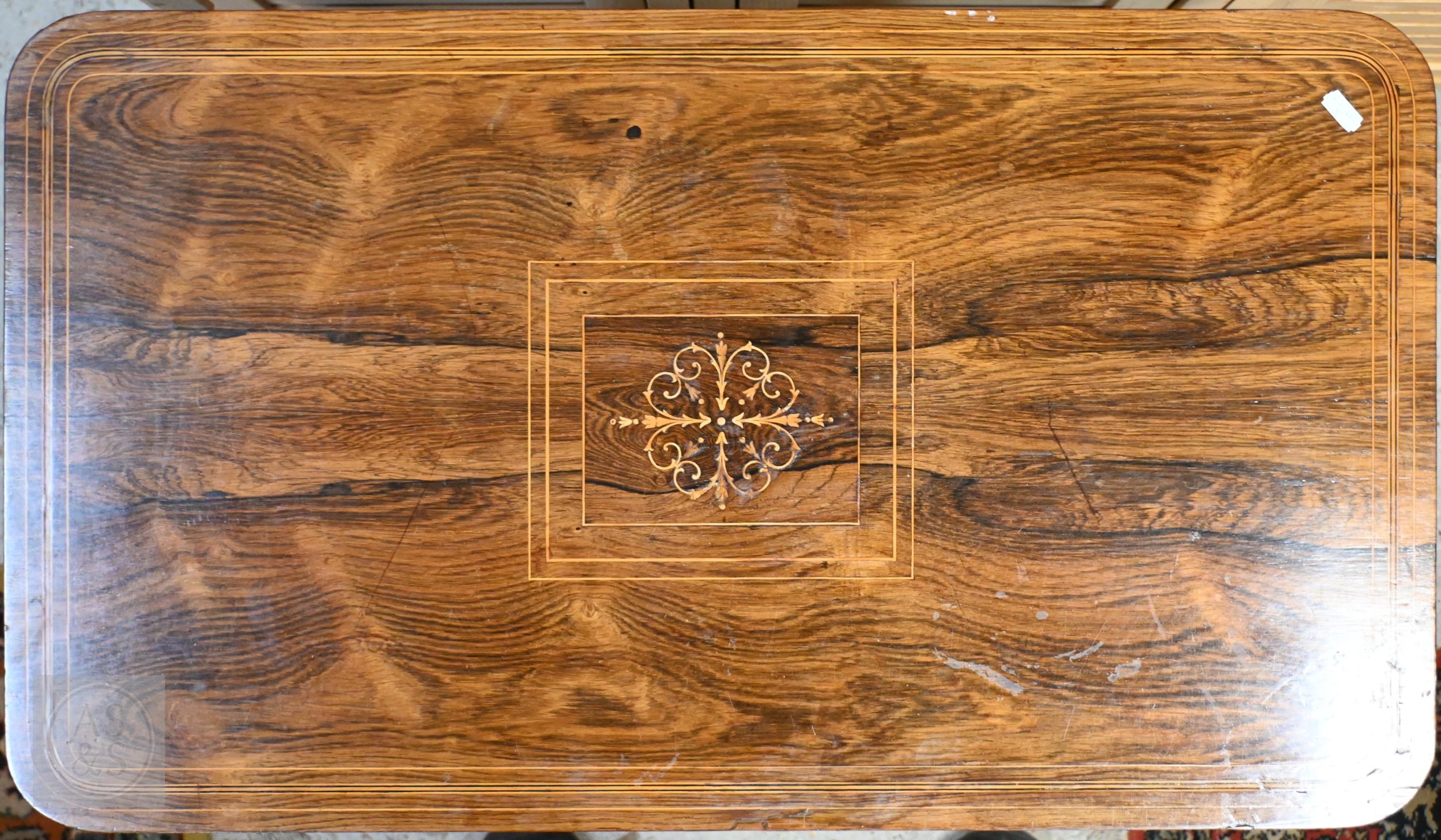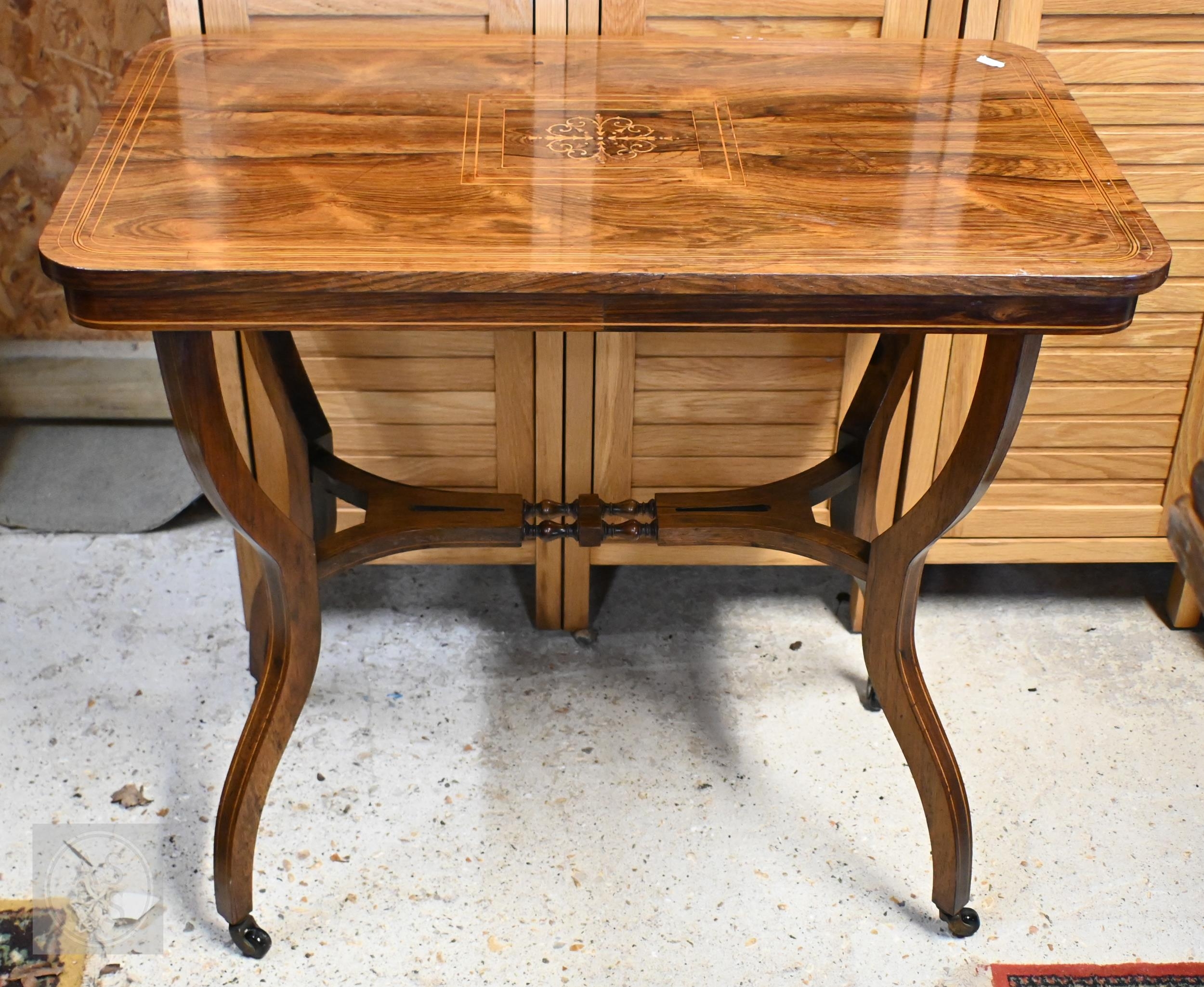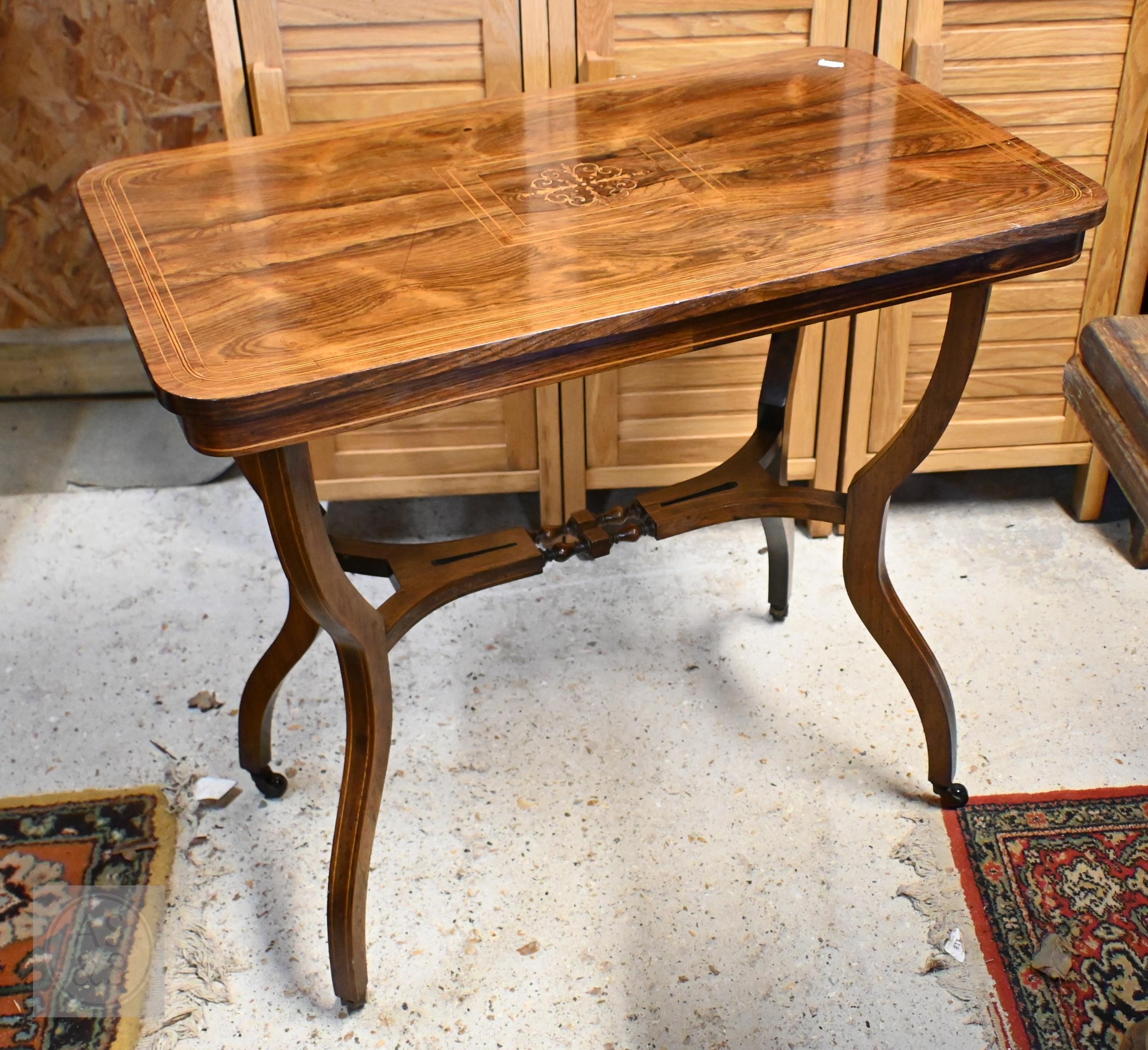 A late Victorian inlaid rosewood side table on shaped supports united by mid-height stretcher, 74 x 44 x 70 cm high