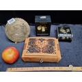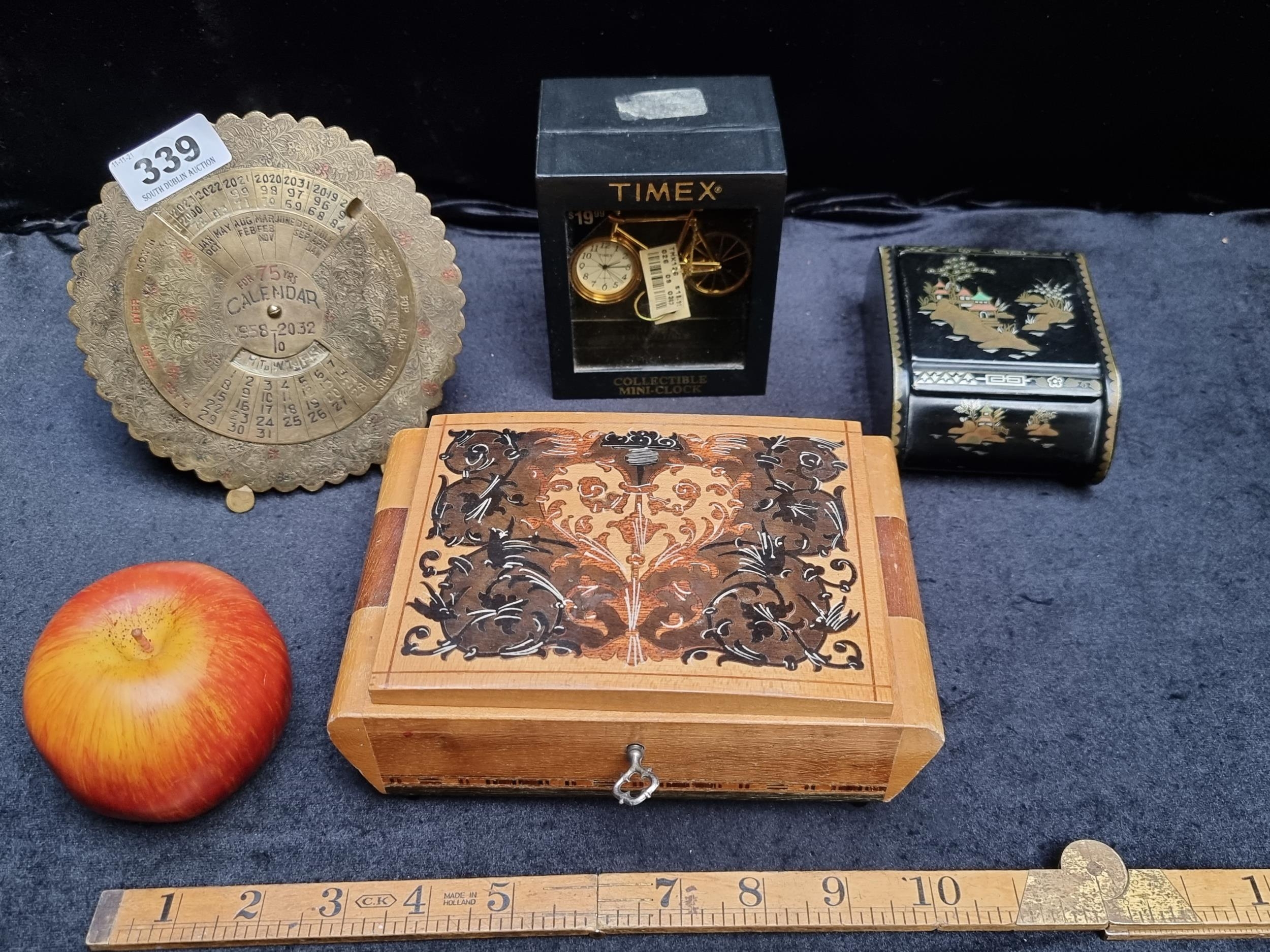 Four items, including two neat sized, decorative boxes, a TIMEX collectible mini clock and a brass 75 year perpetual calendar, dating from 1958-2032.