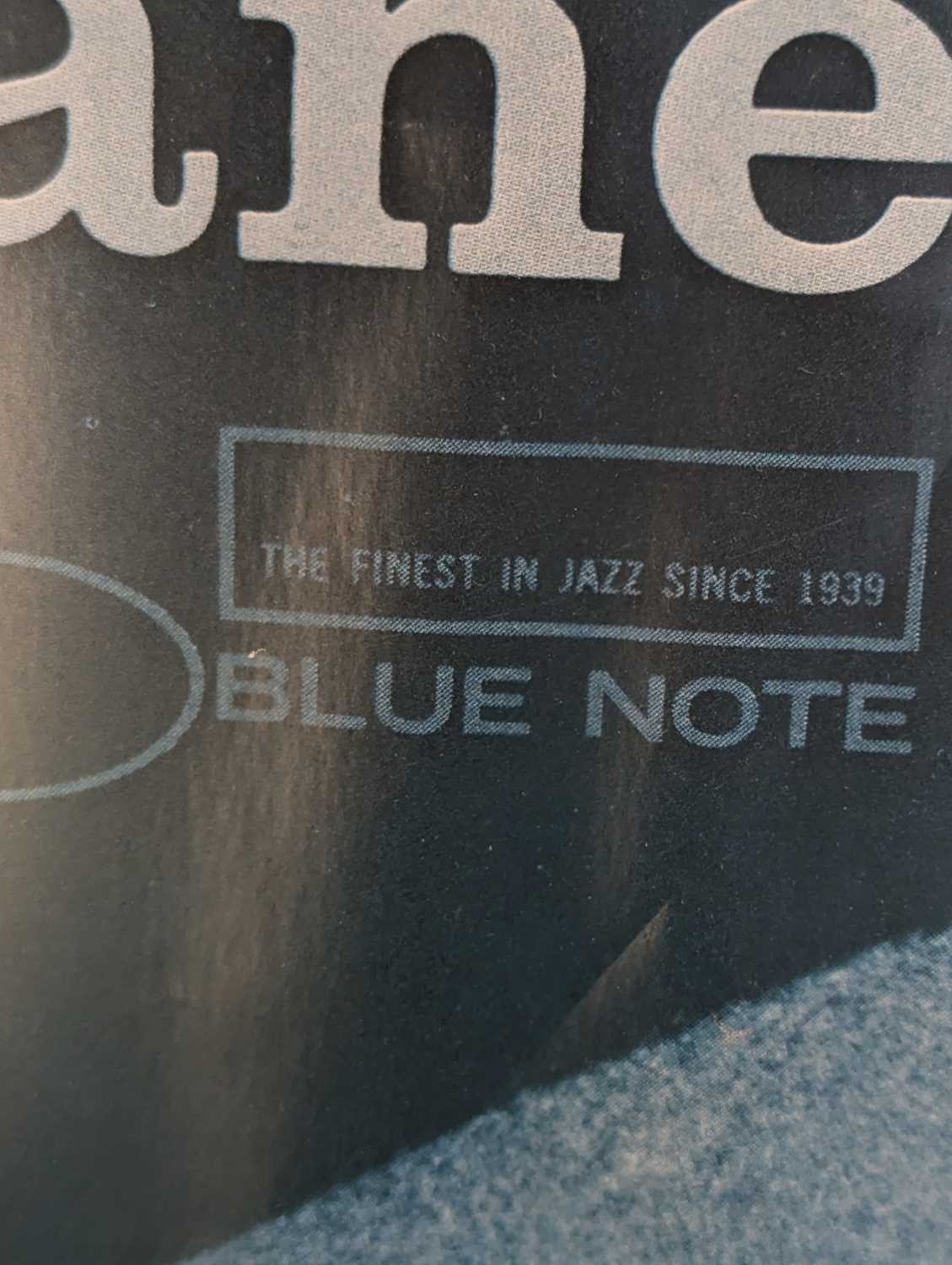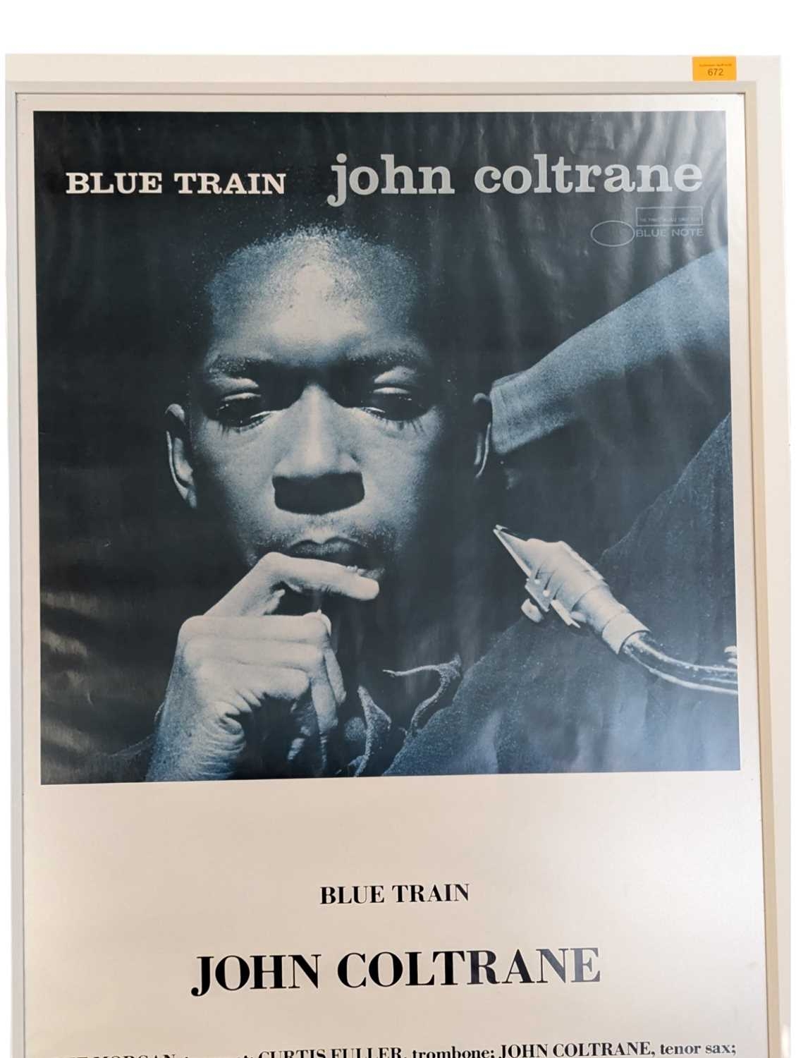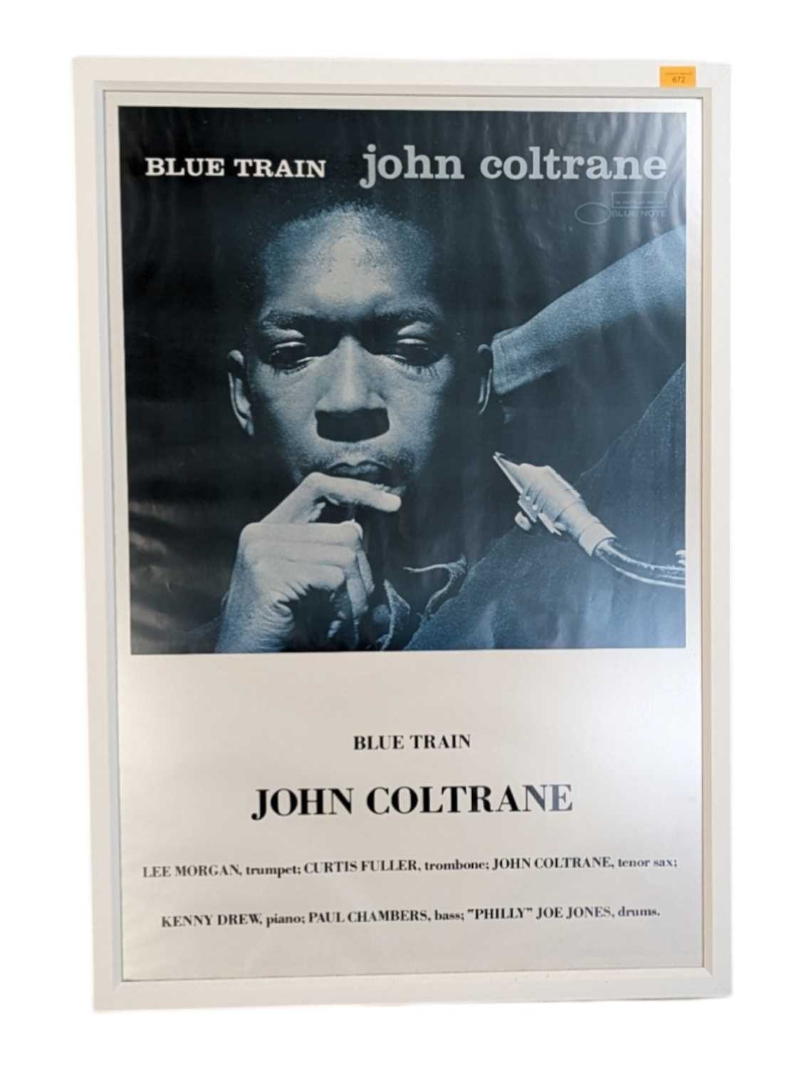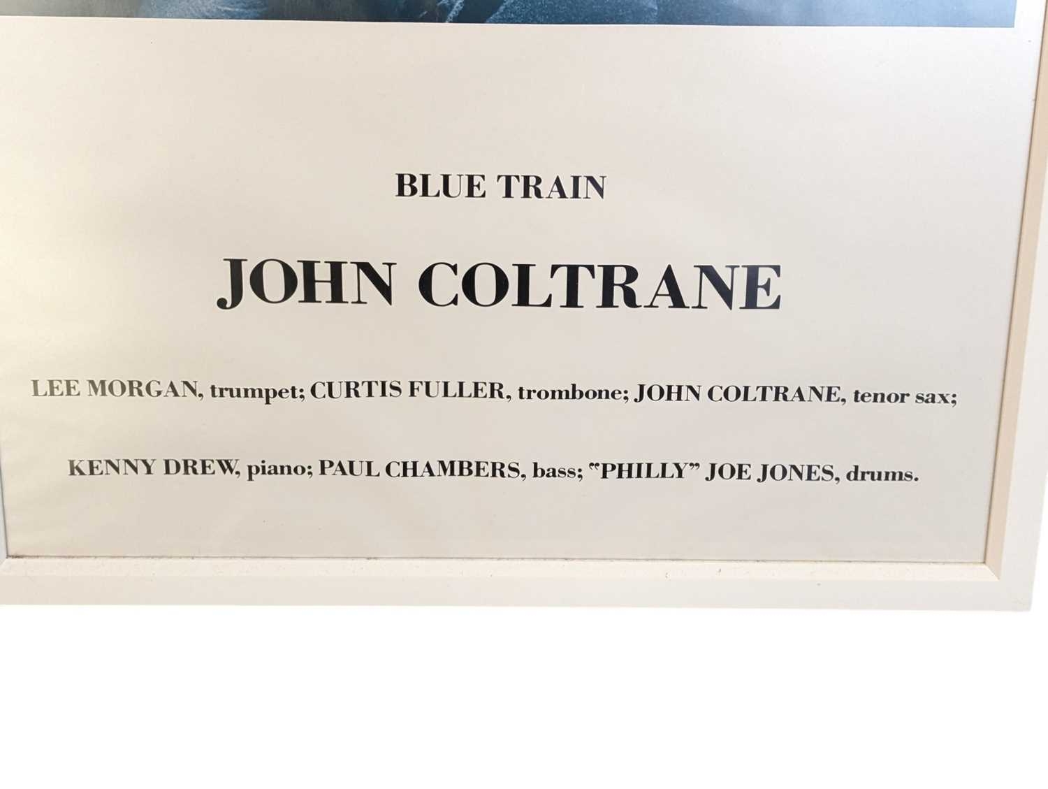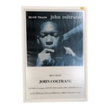 A vintage 20th century John Coltrane Blue Train poster. Featuring an image of Coltrane holding microphone. Framed and glazed. Measures approx: 100x69cm