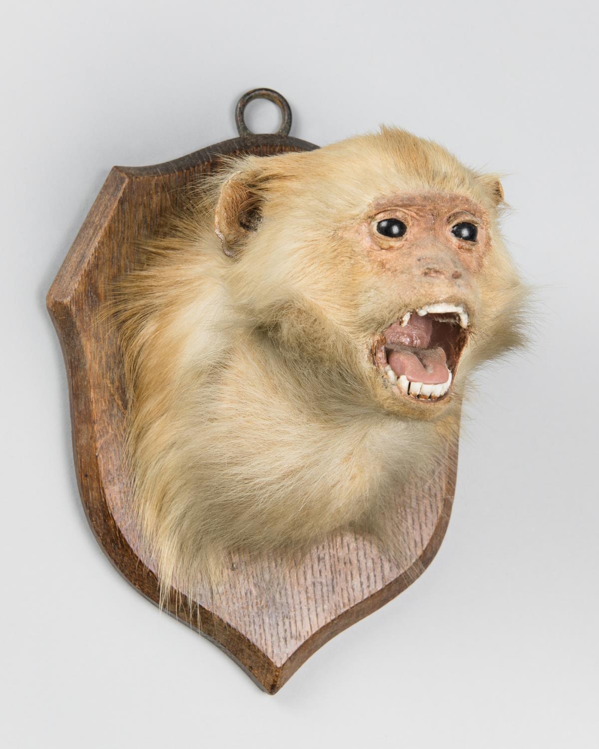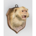 A 20TH CENTURY TAXIDERMY RHESUS MACAQUE HEAD ON OAK SHIELD