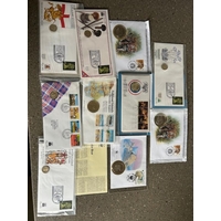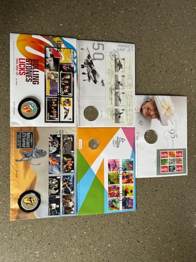 First Day Covers - 2019 Harrier with Medallion, 2021 Birthday with £5, Rolling Stones (2) with Silver Medallions & Birmingham 2022 with 50p. (E)