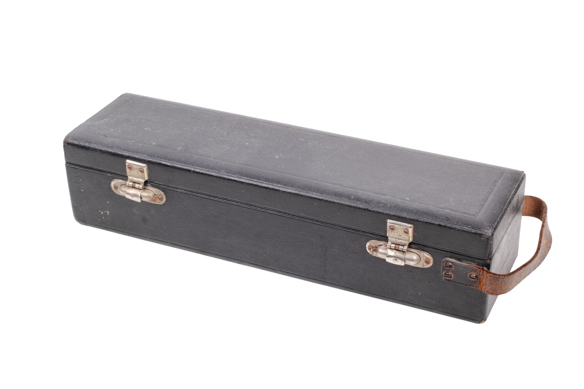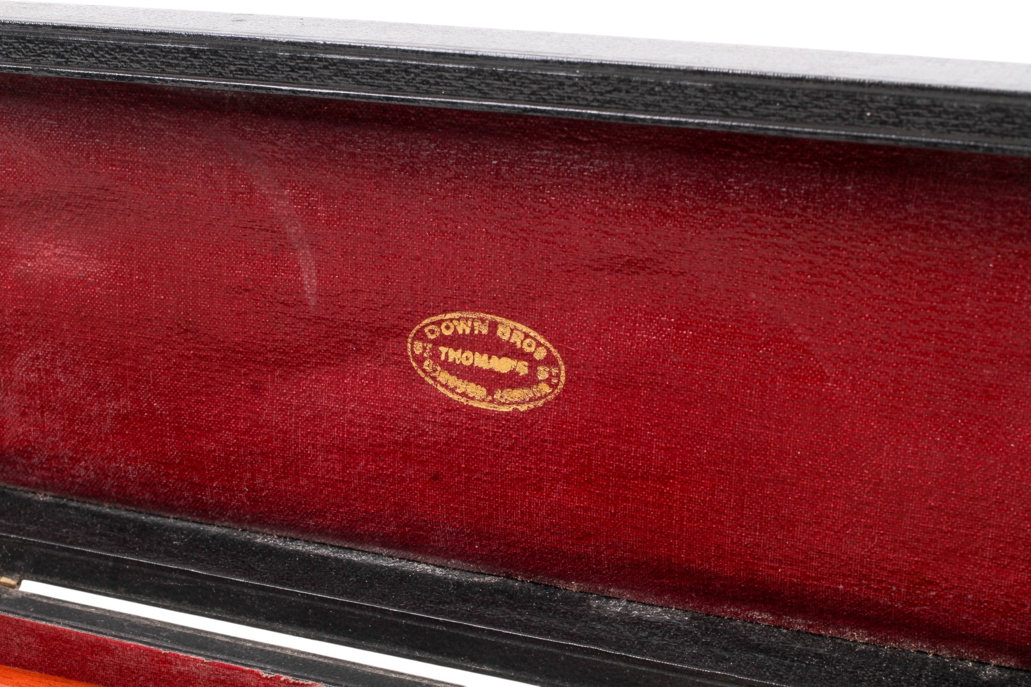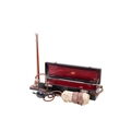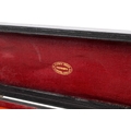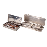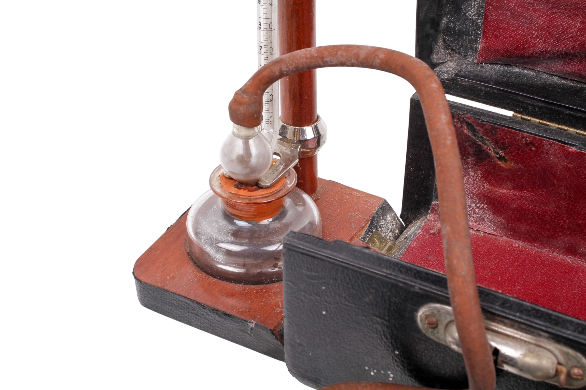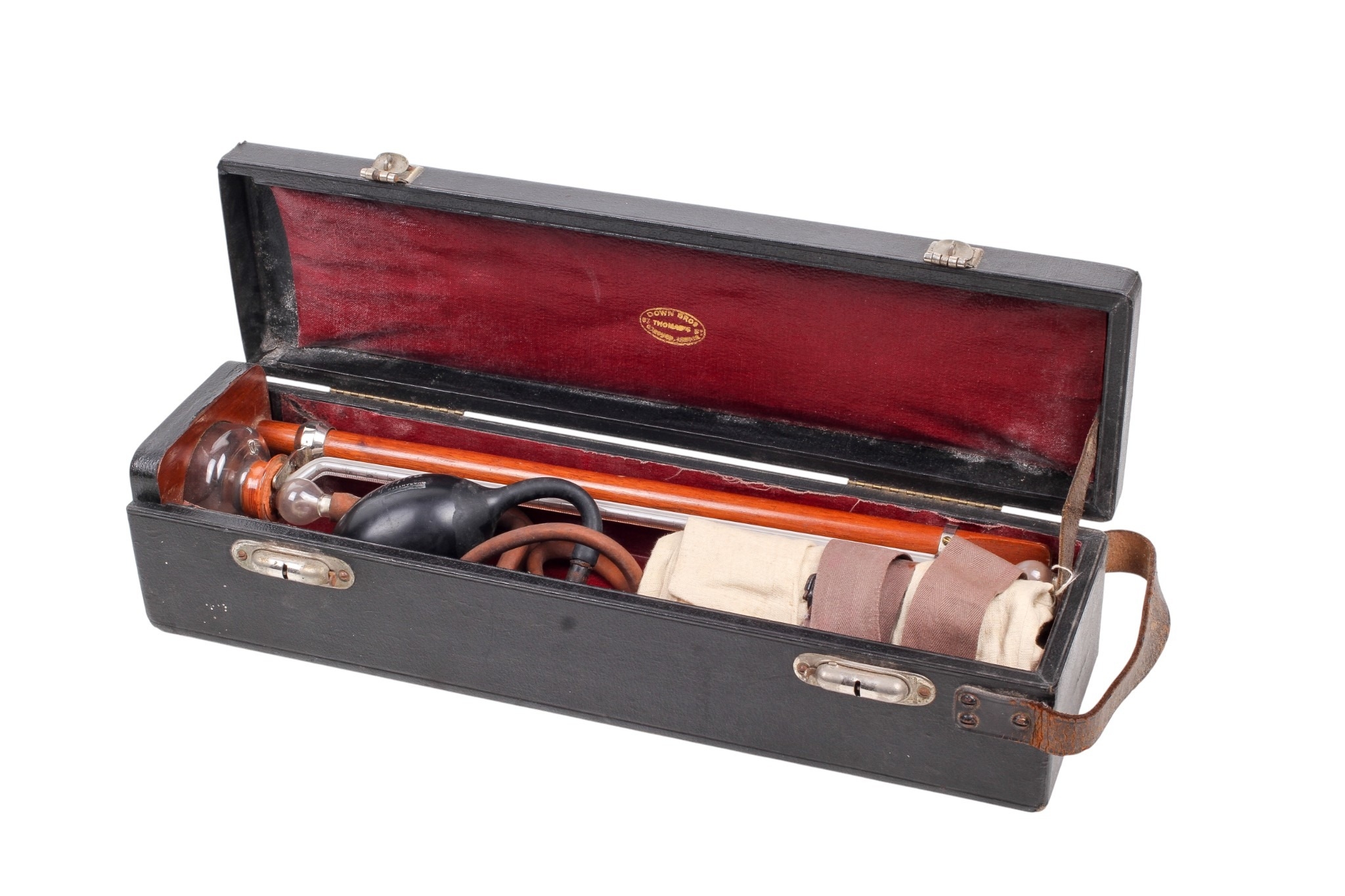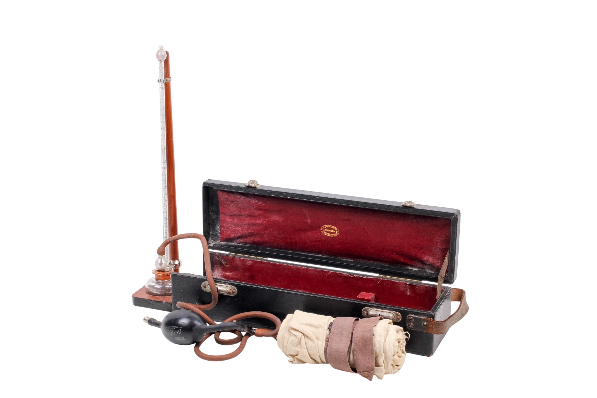 A Down Bros London portable mercury blood pressure gauge. The gauge folding upwards from the fitted case with mercury reservoir to the bottom.