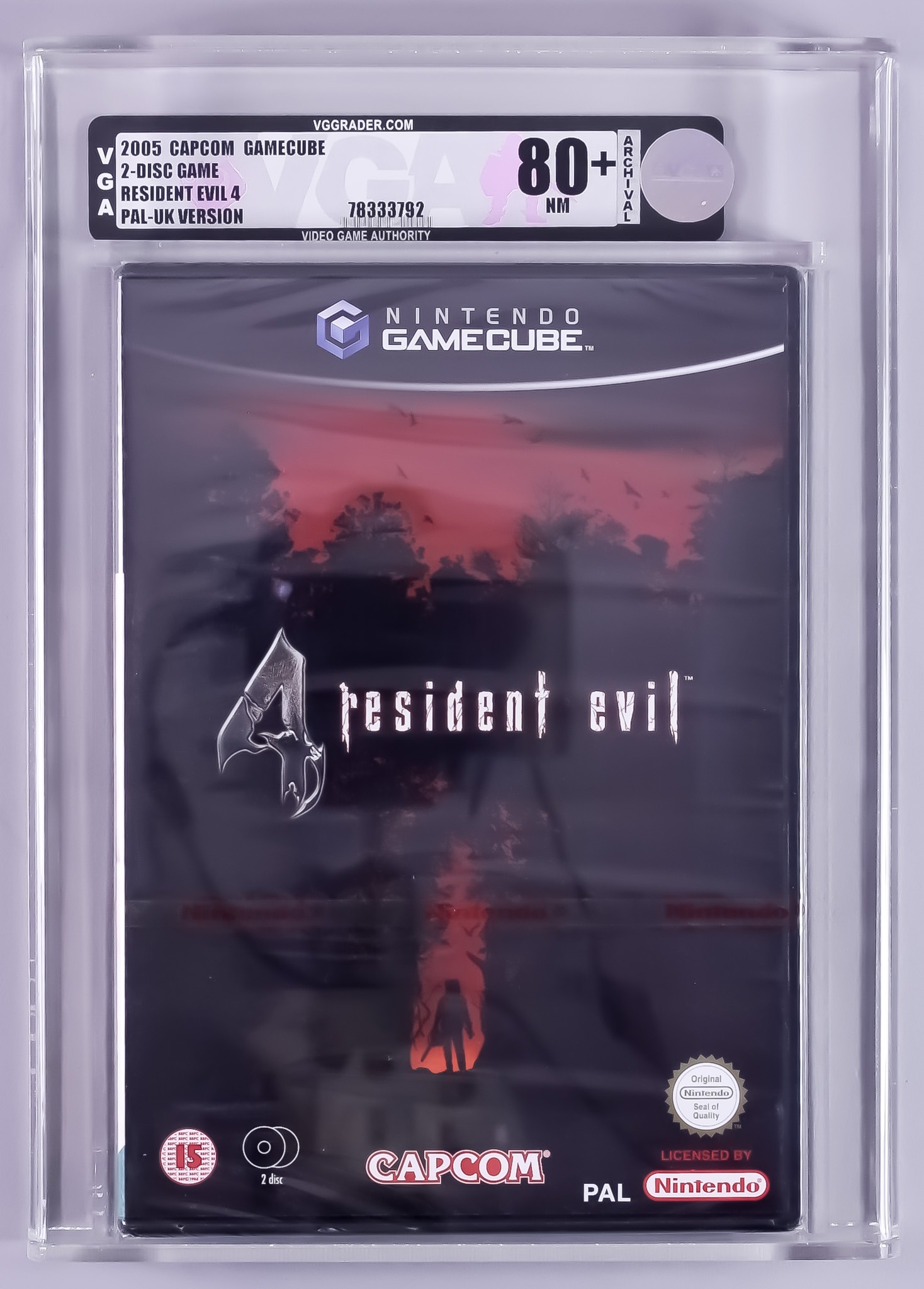 2005 Nintendo GameCube – Resident Evil 4 2 Disc Game – PAL/UK Version VGA 80+/NM, with red Nintendo strip seal and in rigid Perspex case supplied by VGA at the time of grading