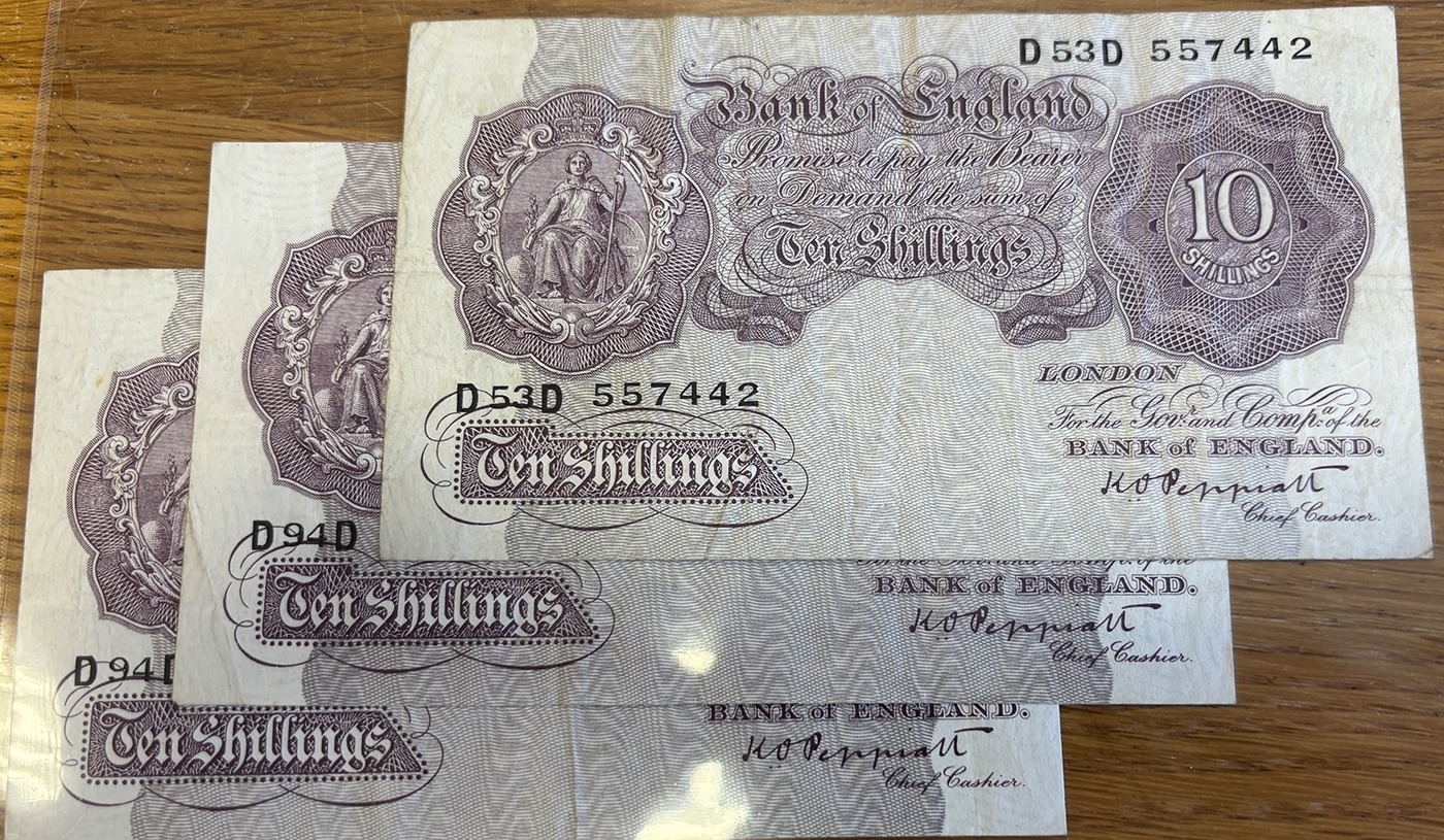 K.O. Peppiatt. Range of 1940 (2 April) 10/- with D94D (2) and D53D, very fine in plastic wallet. Qty 3 (Duggleby B251) (N)