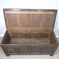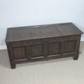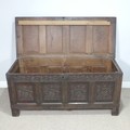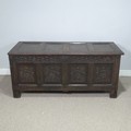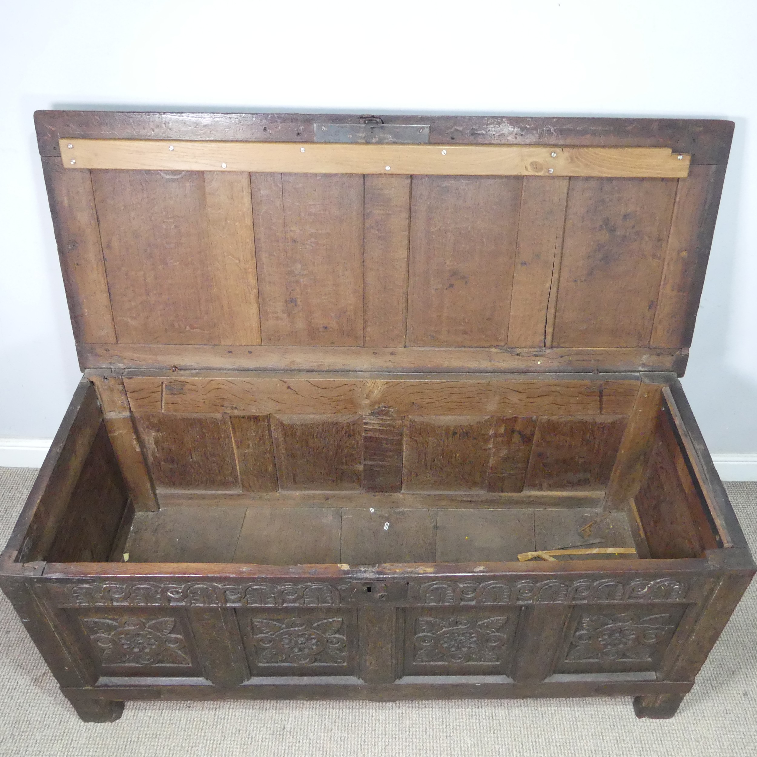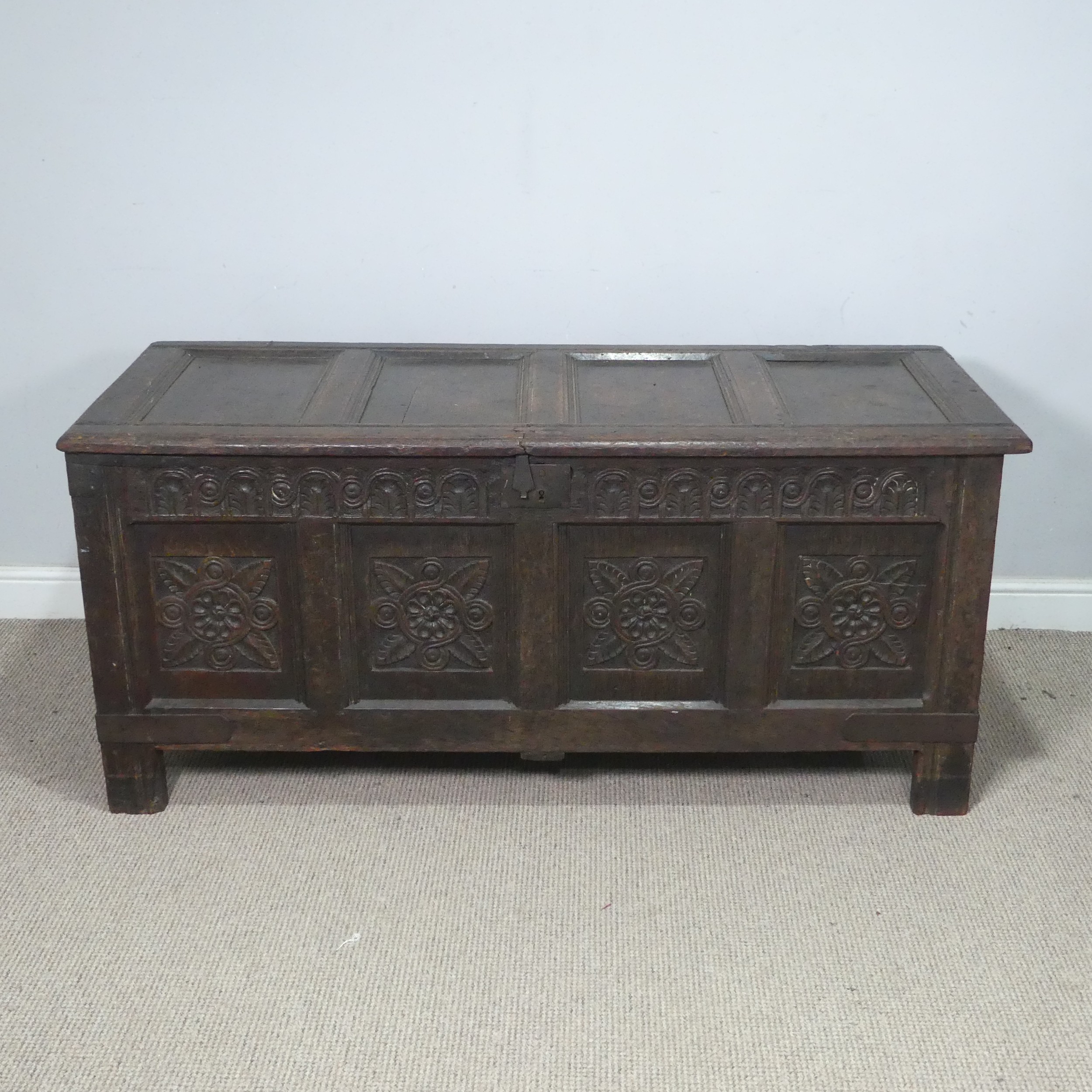 An 18th century oak four-panel Coffer, the front carved in relief with floral decoration, raised on squared supports, W 135 cm x H 65 cm x D 60 cm.