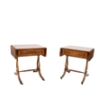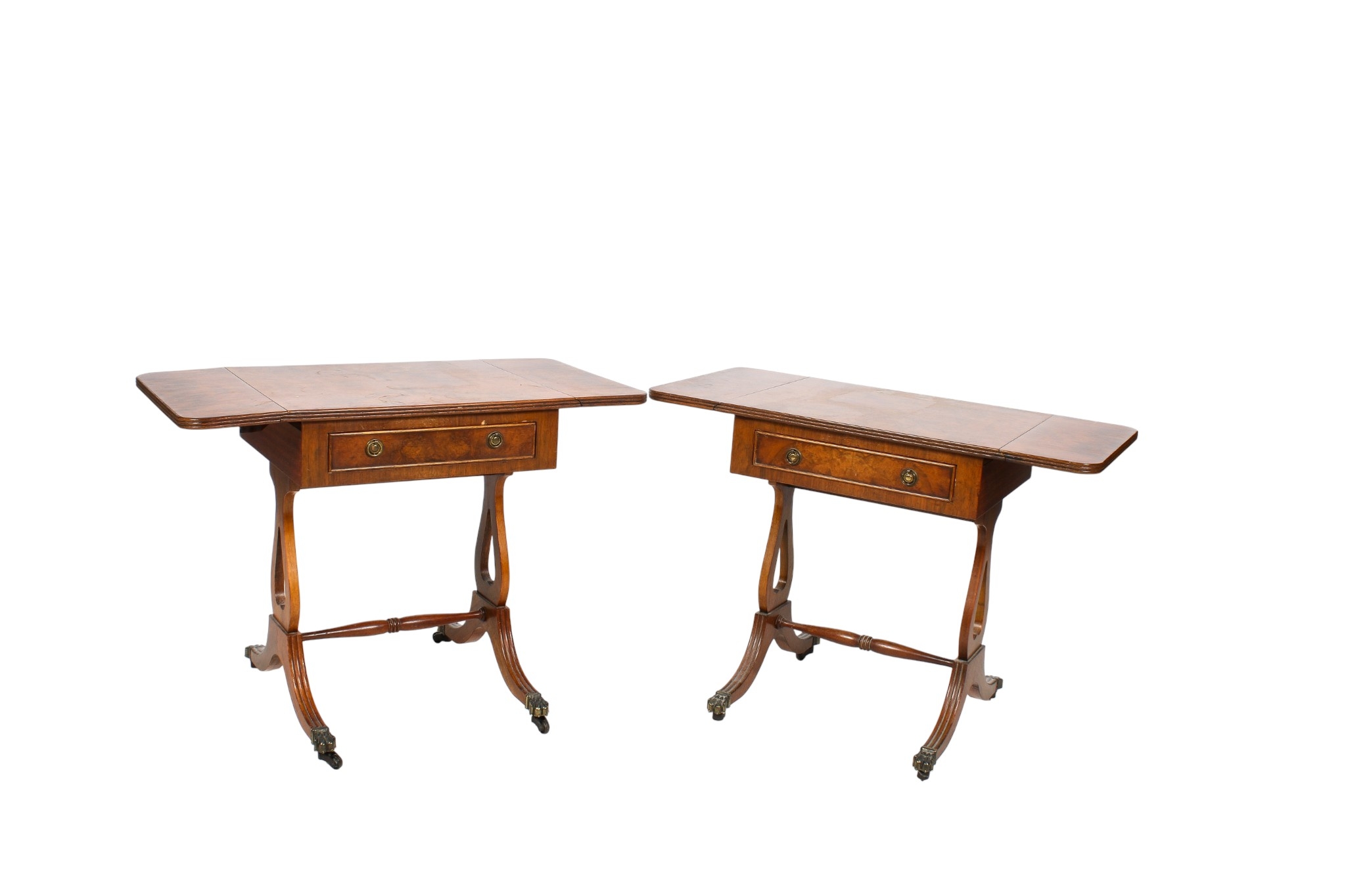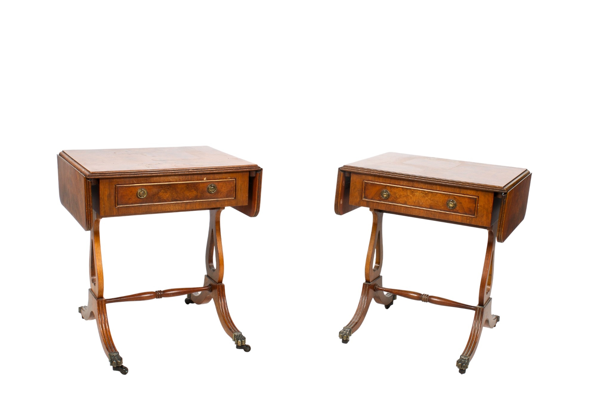 A pair of 20th century Regency style burr walnut veneer drop leaf side tables. Having a drawer, pierced twin pedestals united by a turned stretcher, rasied on reeded supports with claw feet and casters. H53cm x W73cm x D37cm (open)