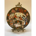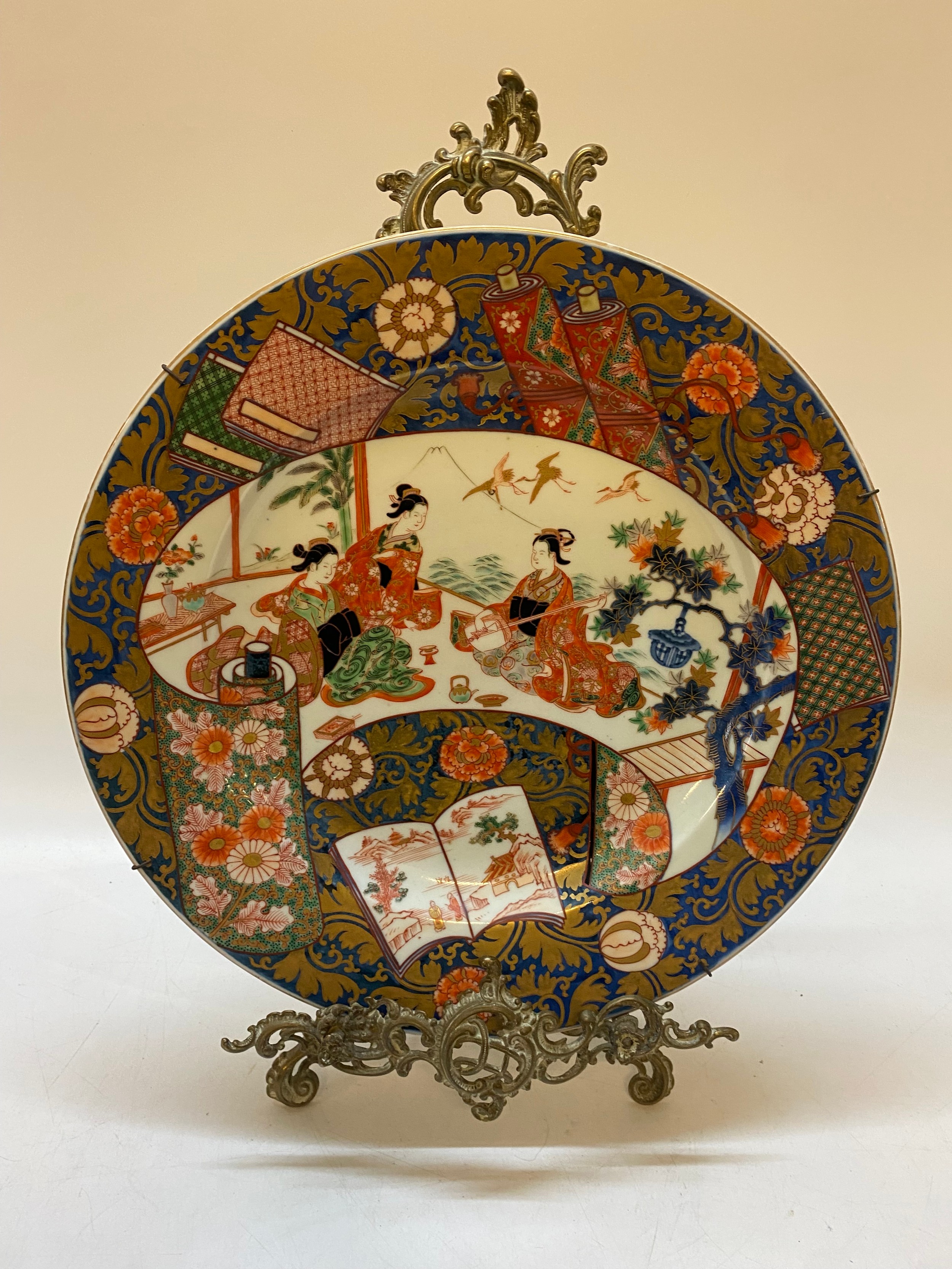 A Japanese charger painted in scroll with bejins, mount Fuji and cranes, within floral borders - 15 3/4in. dia.