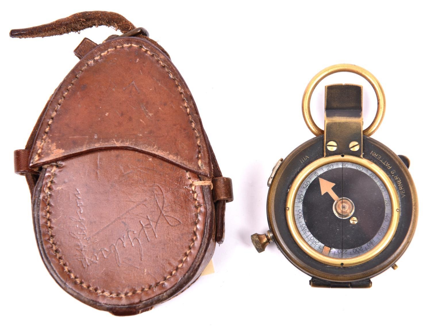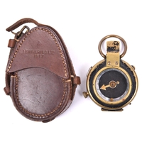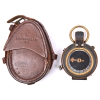A WWI prismatic marching compass, by “F-L”, number 77715, bearing broad arrow and date “1917”, the front marked “Vernier’s Pattern VIII”, with MOP dial, in its leather case stamped “French & Son Ltd, London” and with broad arrow, impressed with the owner’s name “J H Gibson”. GC (some wear to black finish on the compass) £60-80