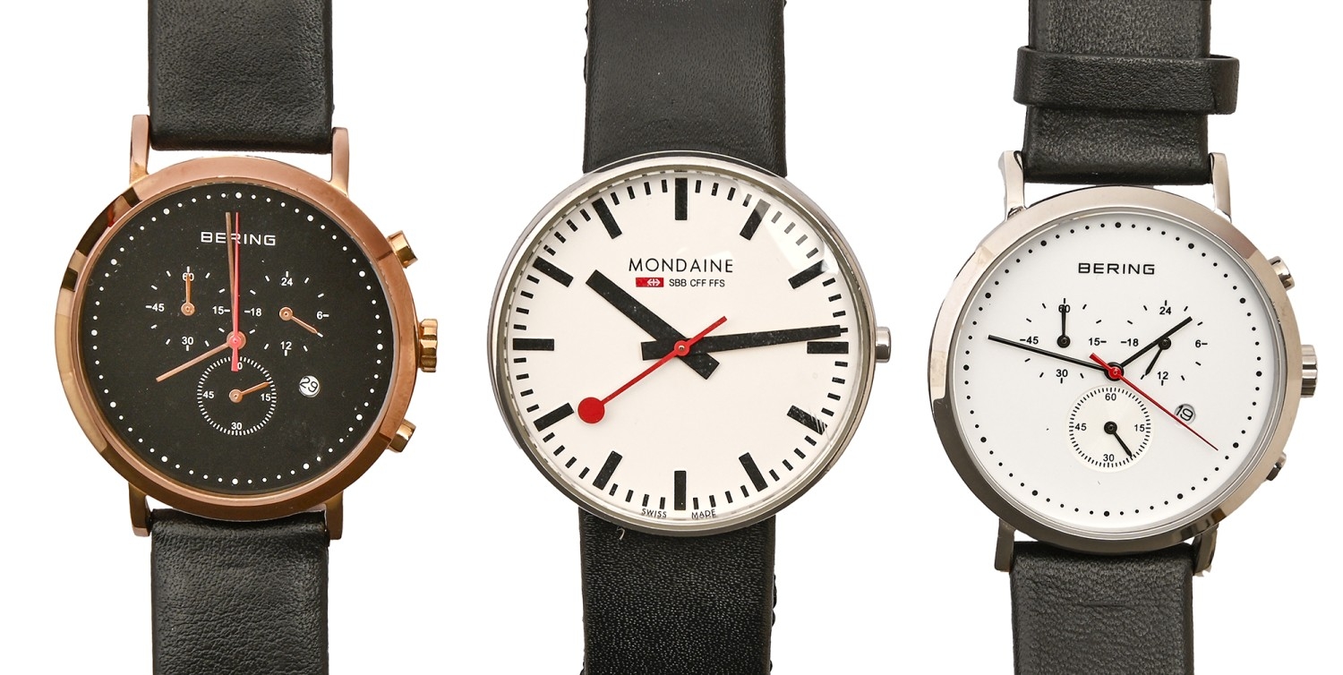 One Mondaine and two Bering stainless steel gentleman's wristwatches, quartz movements, various sizes