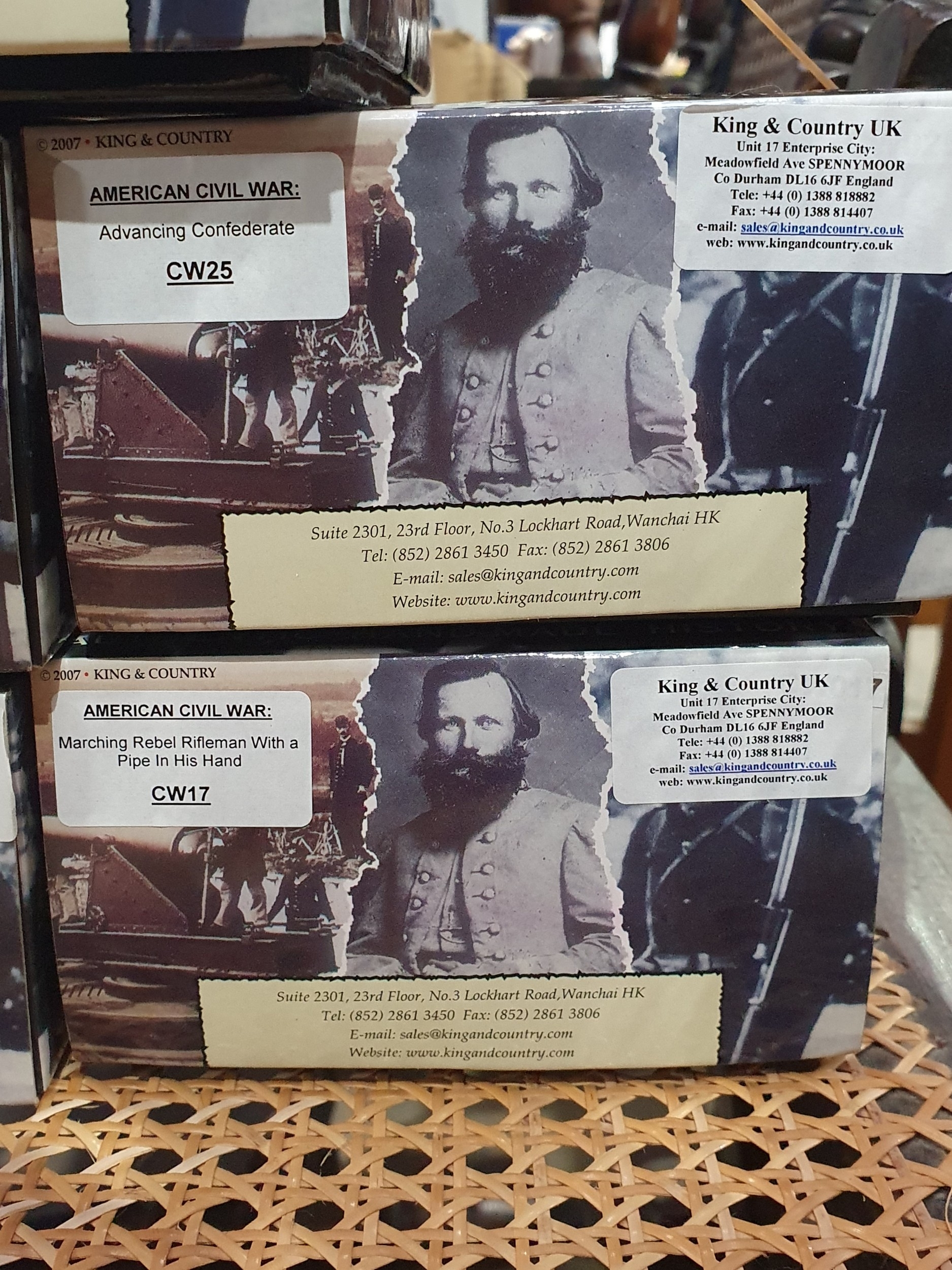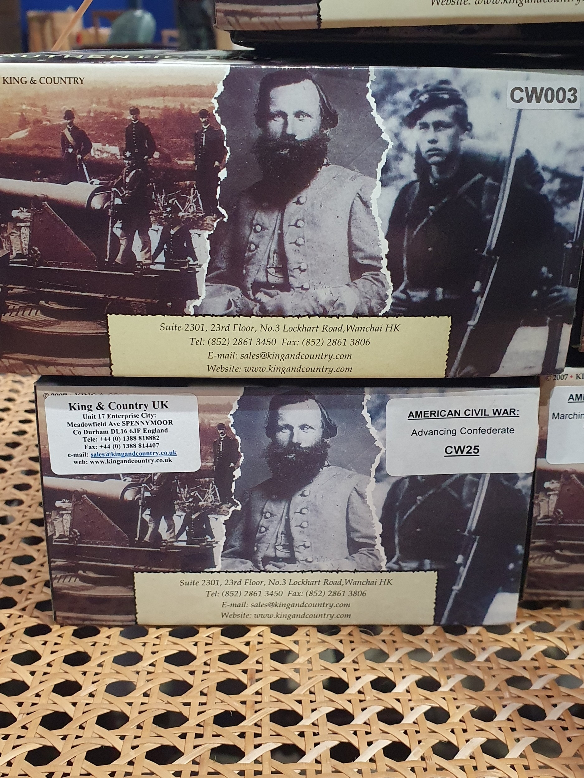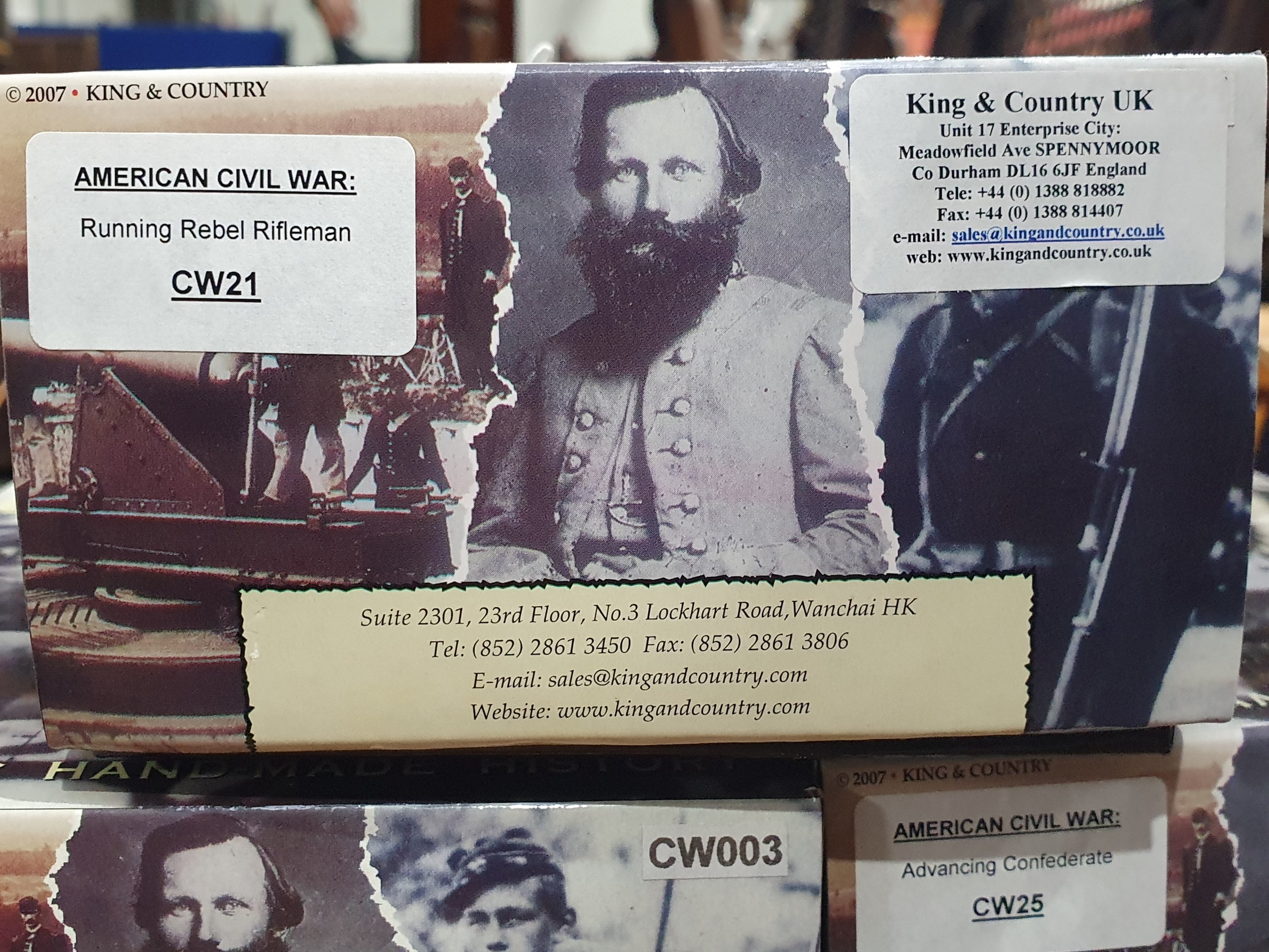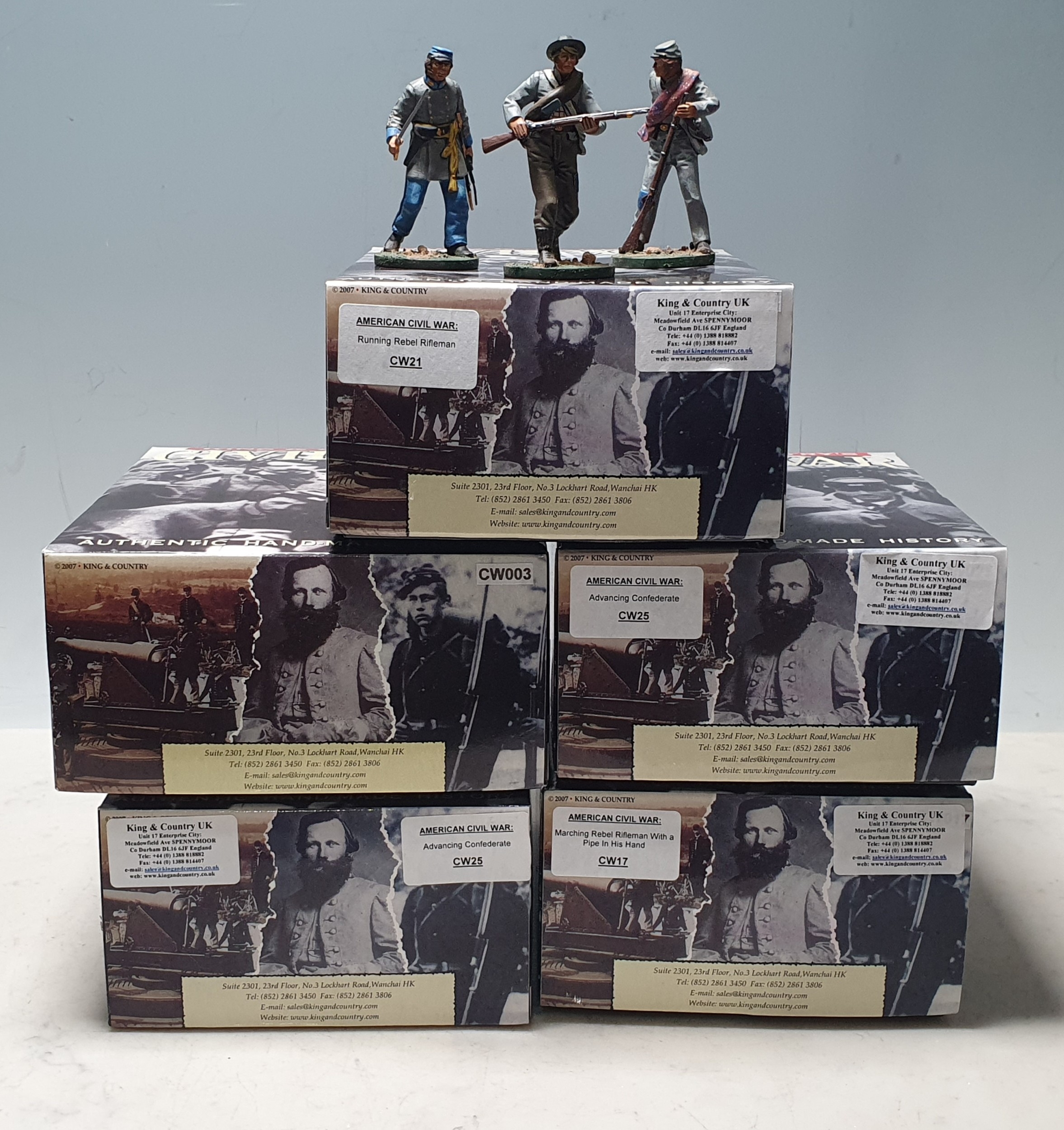 Five boxed King & Country American Civil War Military Figures comprising CW17 Marching Rebel Rifleman with a pipe in his hand, two CW25 Advancing Confederate, CW21 Running Rebel Rifleman and CW003 General Jackson, all appear unopened
