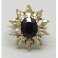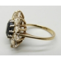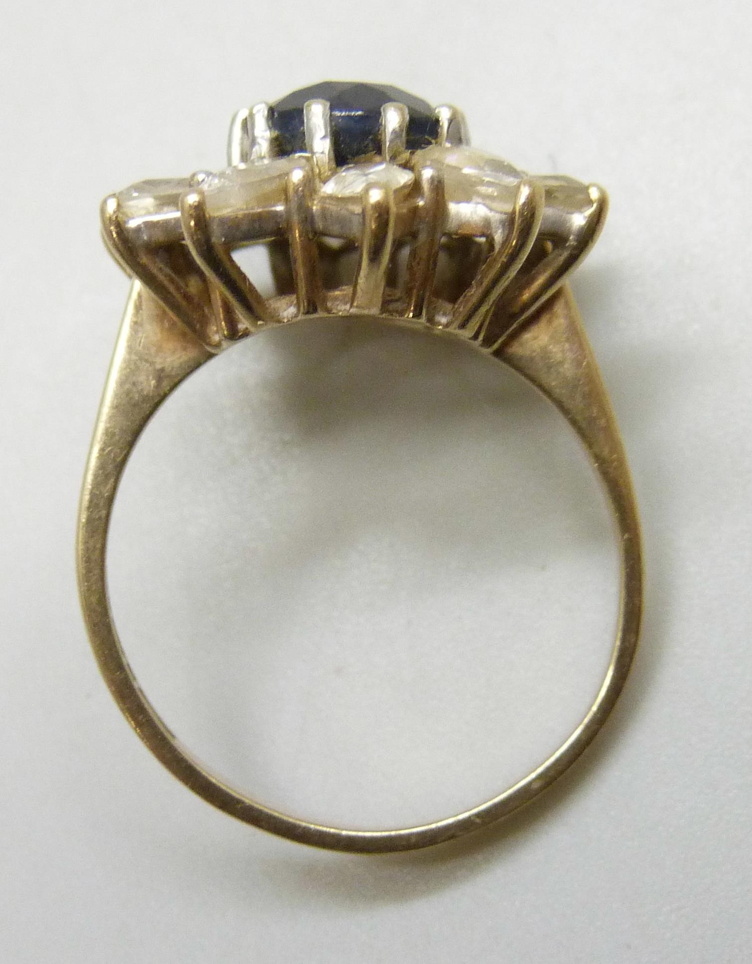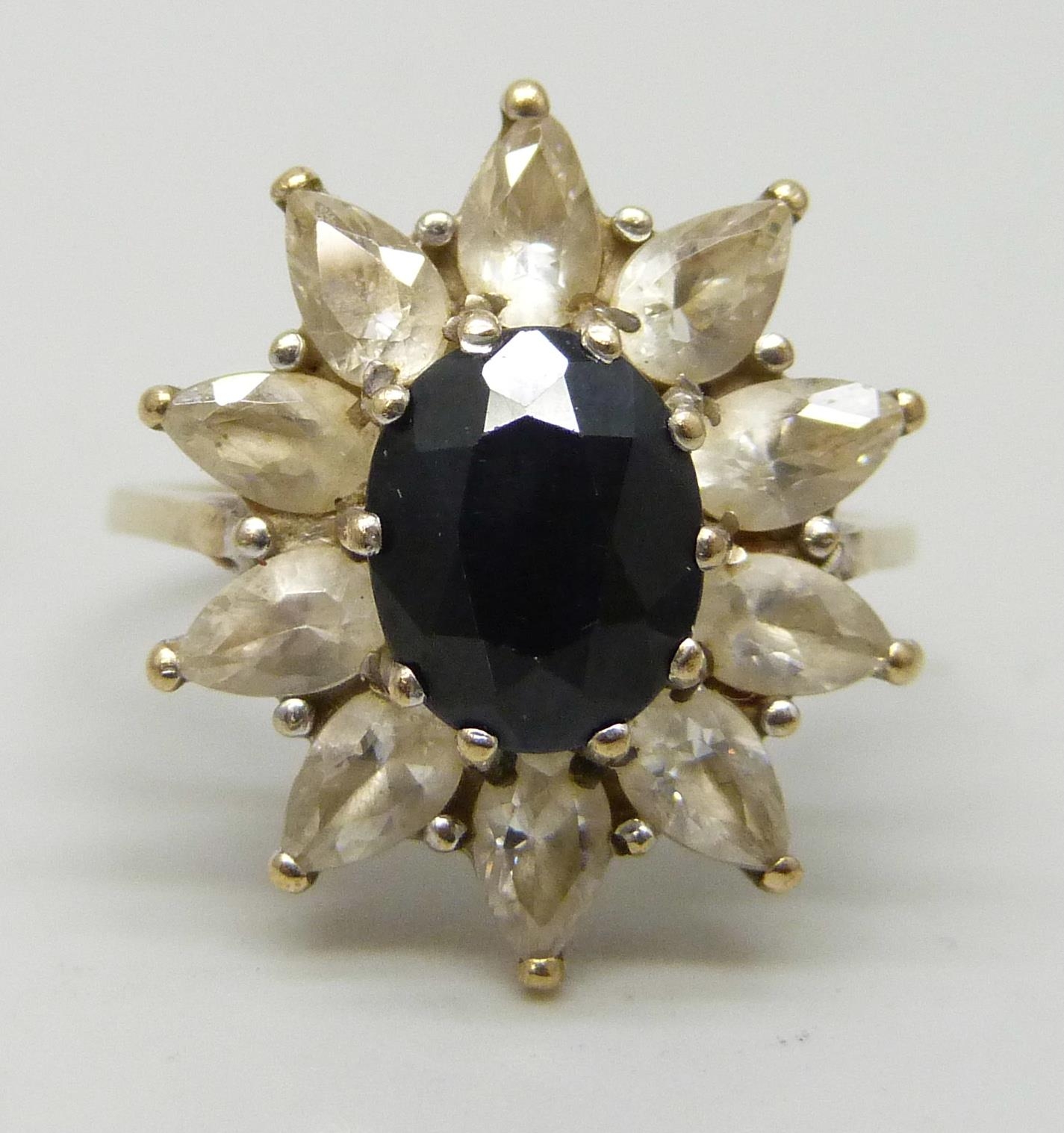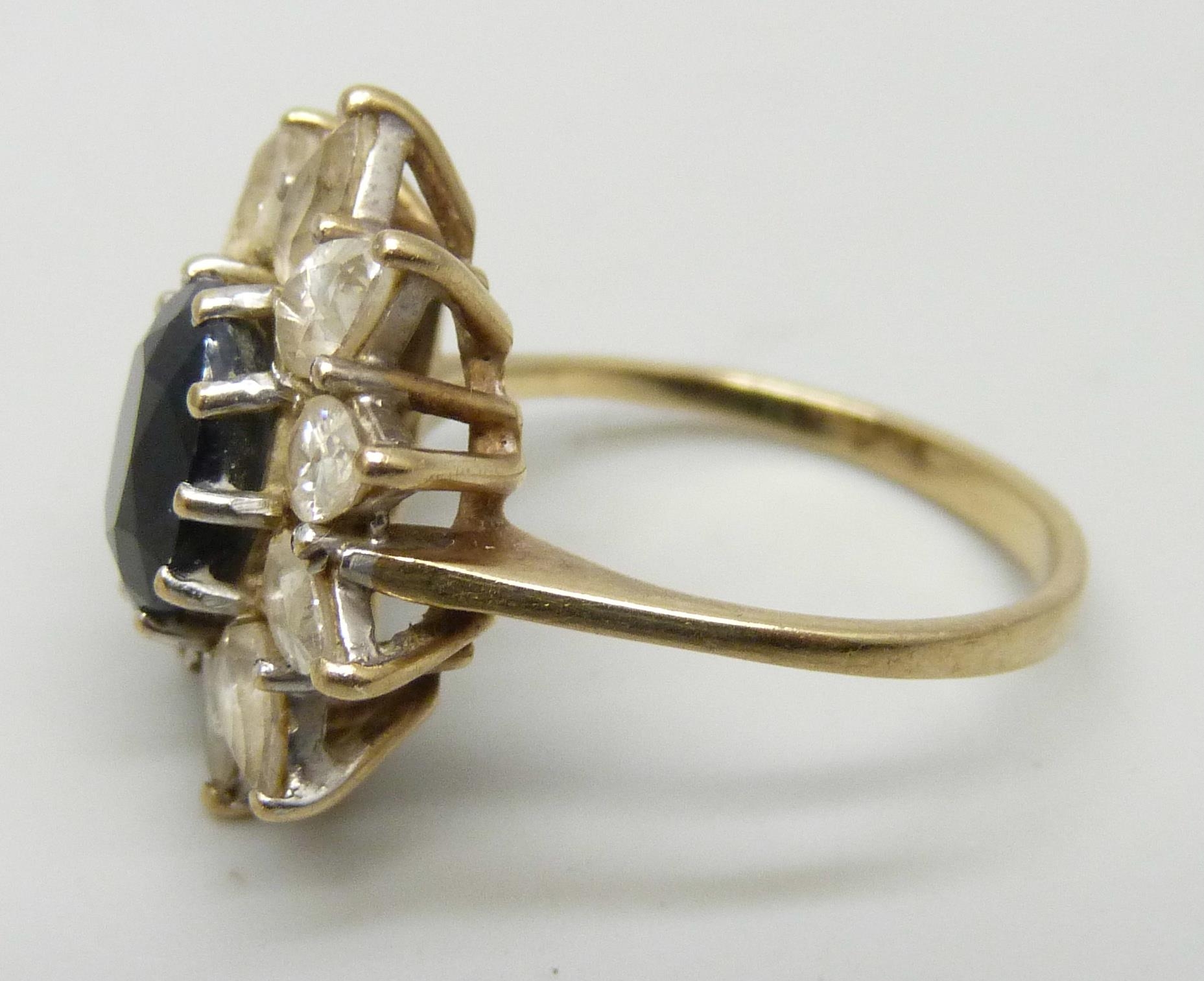 A 9ct gold, sapphire and white stone cluster ring, 4.5g, N
