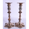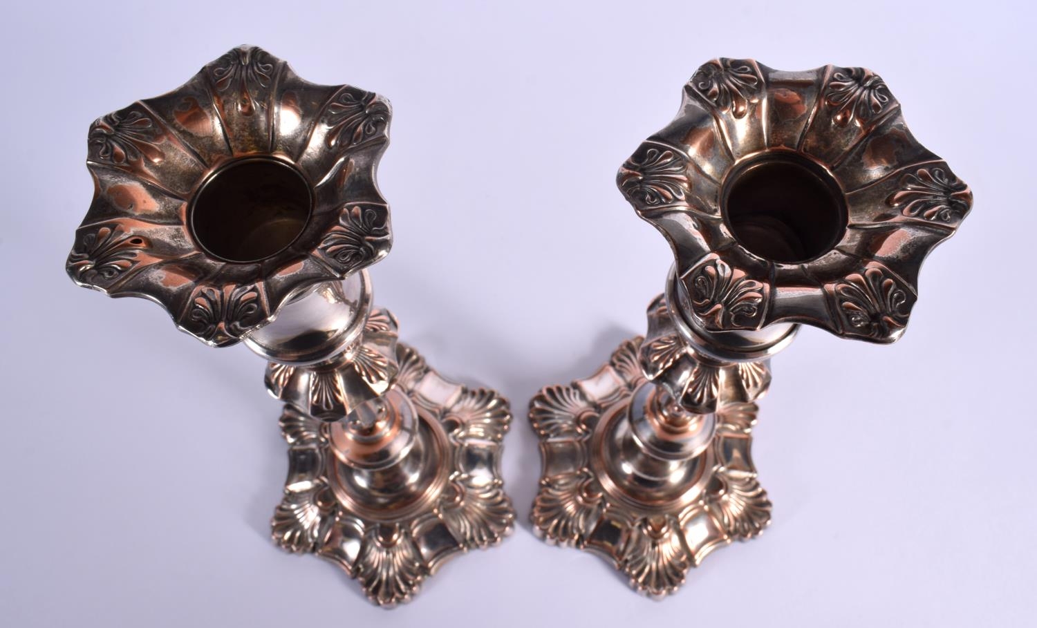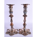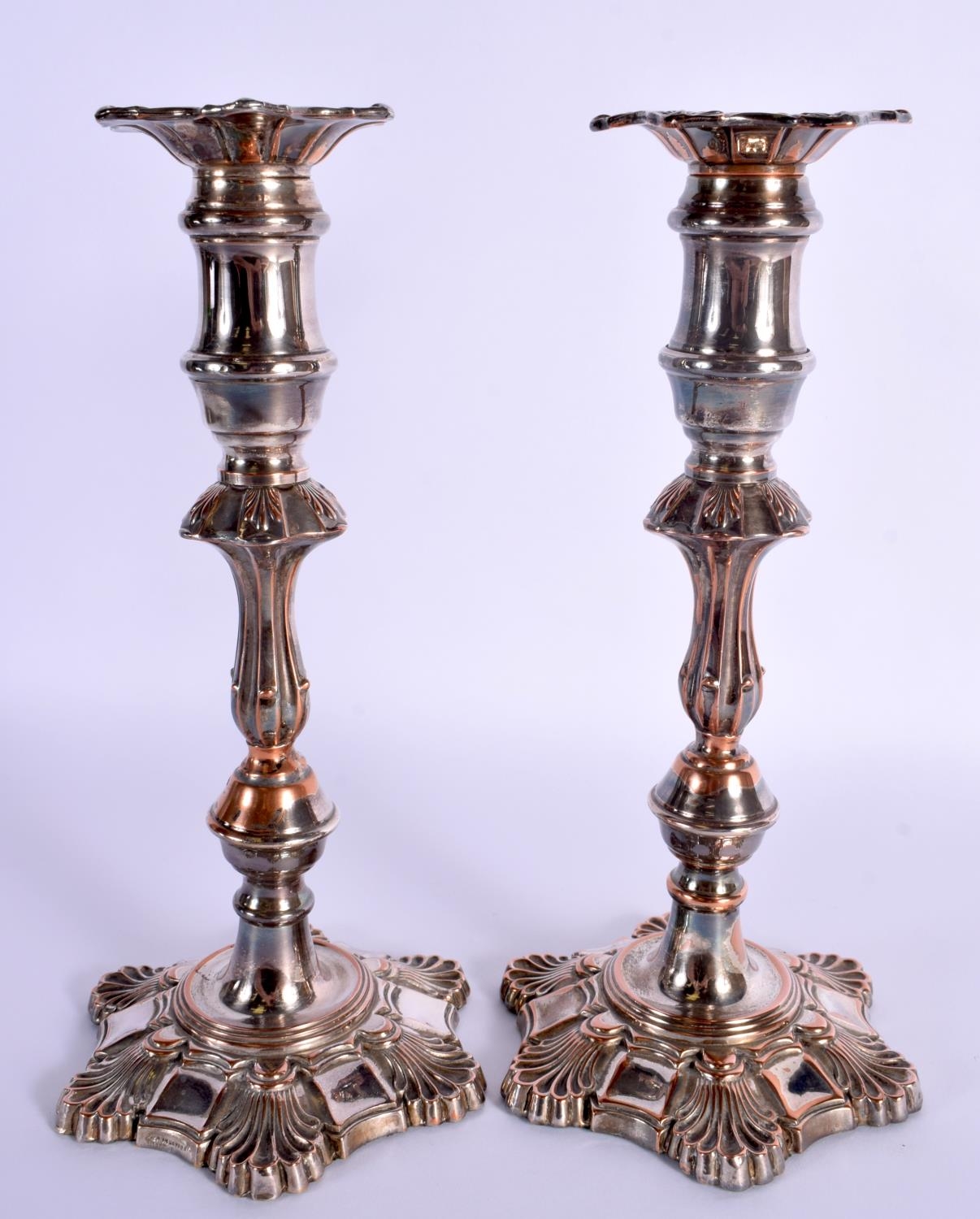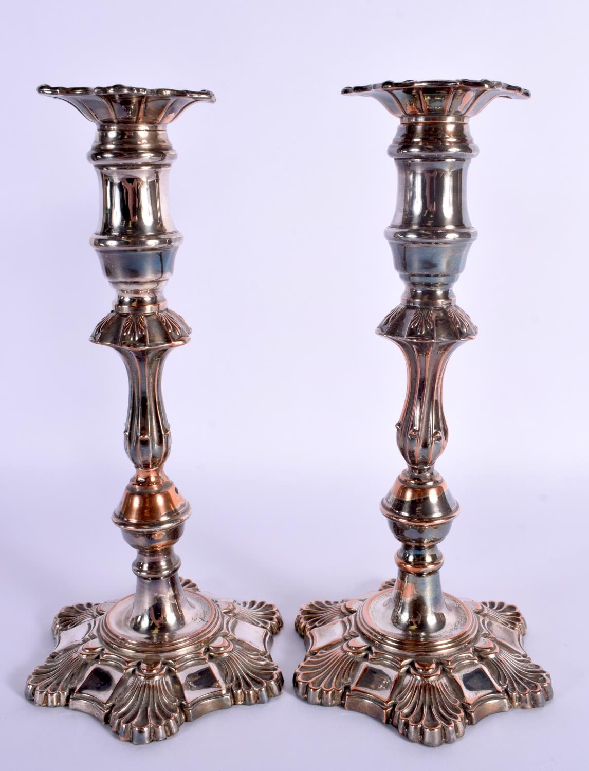A PAIR OF EARLY 19TH CENTURY OLD SHEFFIELD PLATED CANDLESTICKS formed with acanthus. 25 cm high.
