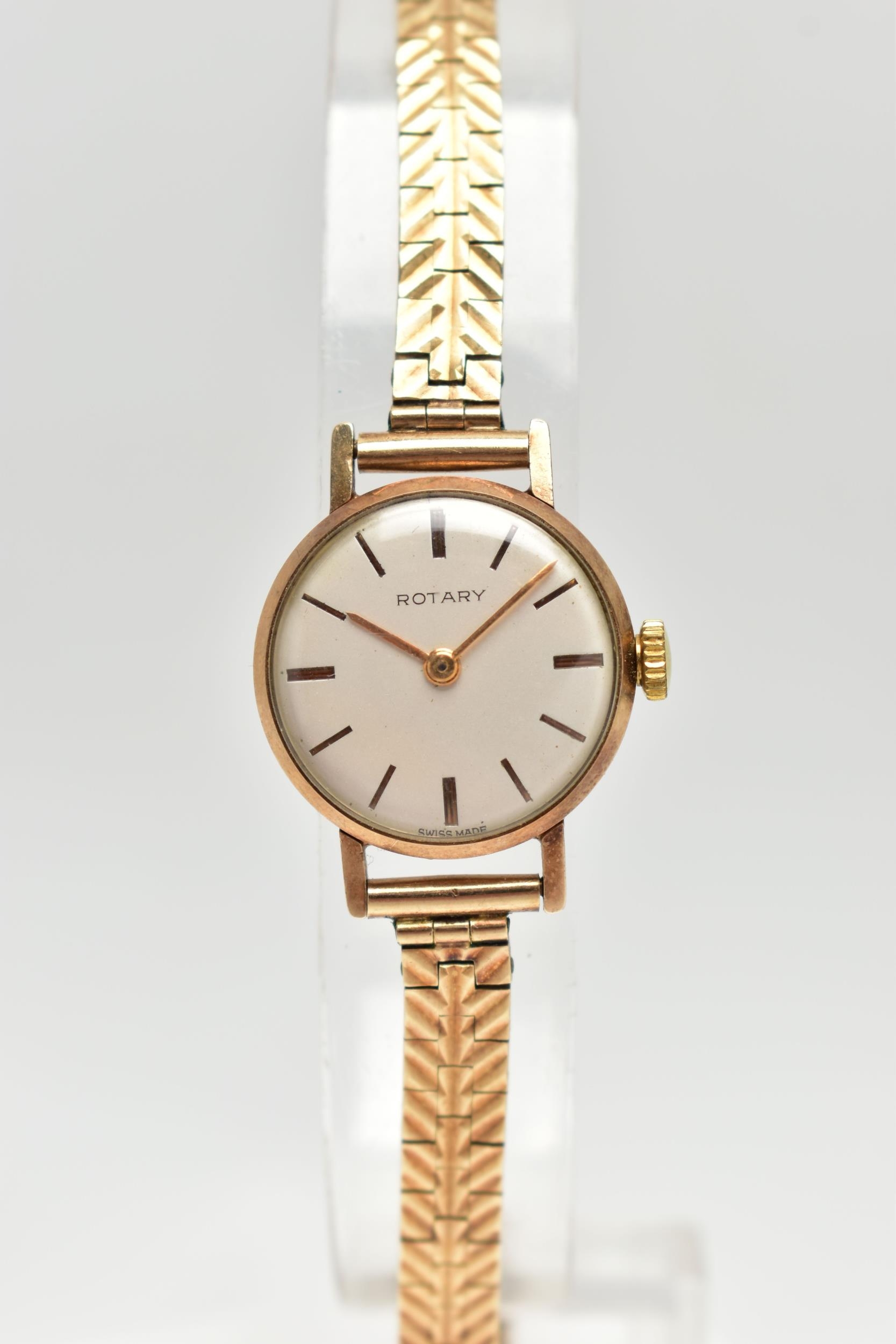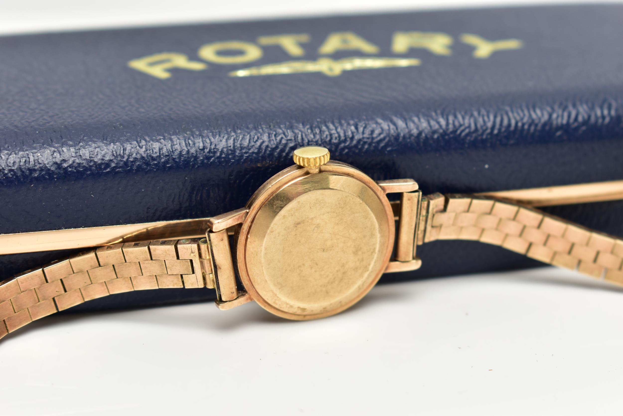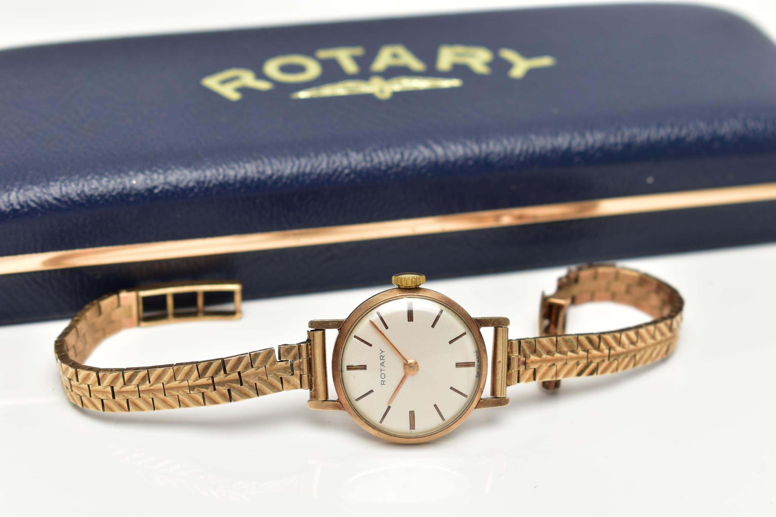 A LADY'S 9CT GOLD 'ROTARY' WRISTWATCH, manual wind, round silver dial signed 'Rotary', baton markers, gold tone hands, within a polished case, inside case back stamped 218881, hallmarked 9ct London 1961, approximate case width 21.0mm, fitted with a diamond cut pattern, articulated bracelet and folding clasp, hallmarked 9ct London 1964, length 185mm, approximate gross weight excluding movement 16.6 grams, together with a fitted signed 'Rotary' box (condition report: watch winds, sets and runs at time of cataloguing, although time keeping is untested, general light wear, would benefit from a gentle clean and polish, overall condition good)