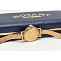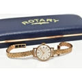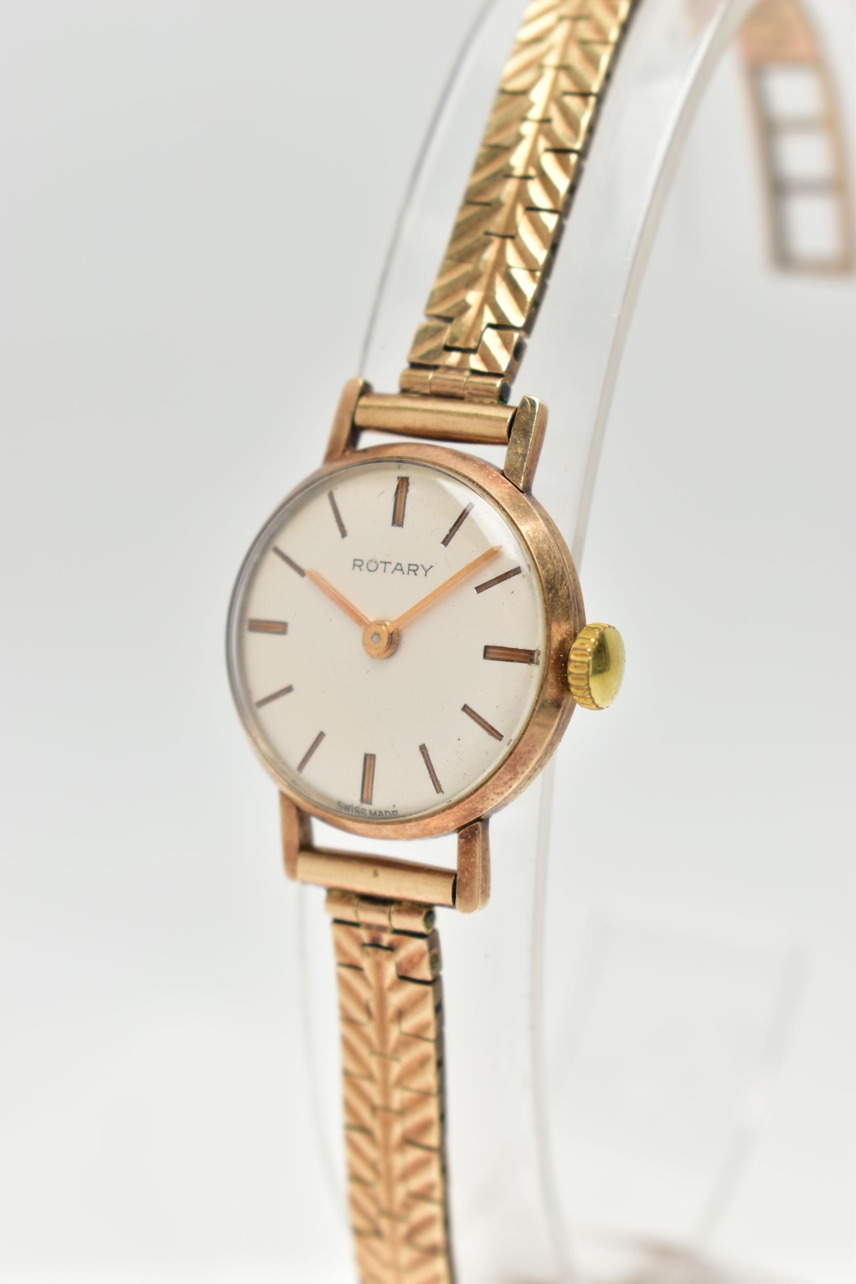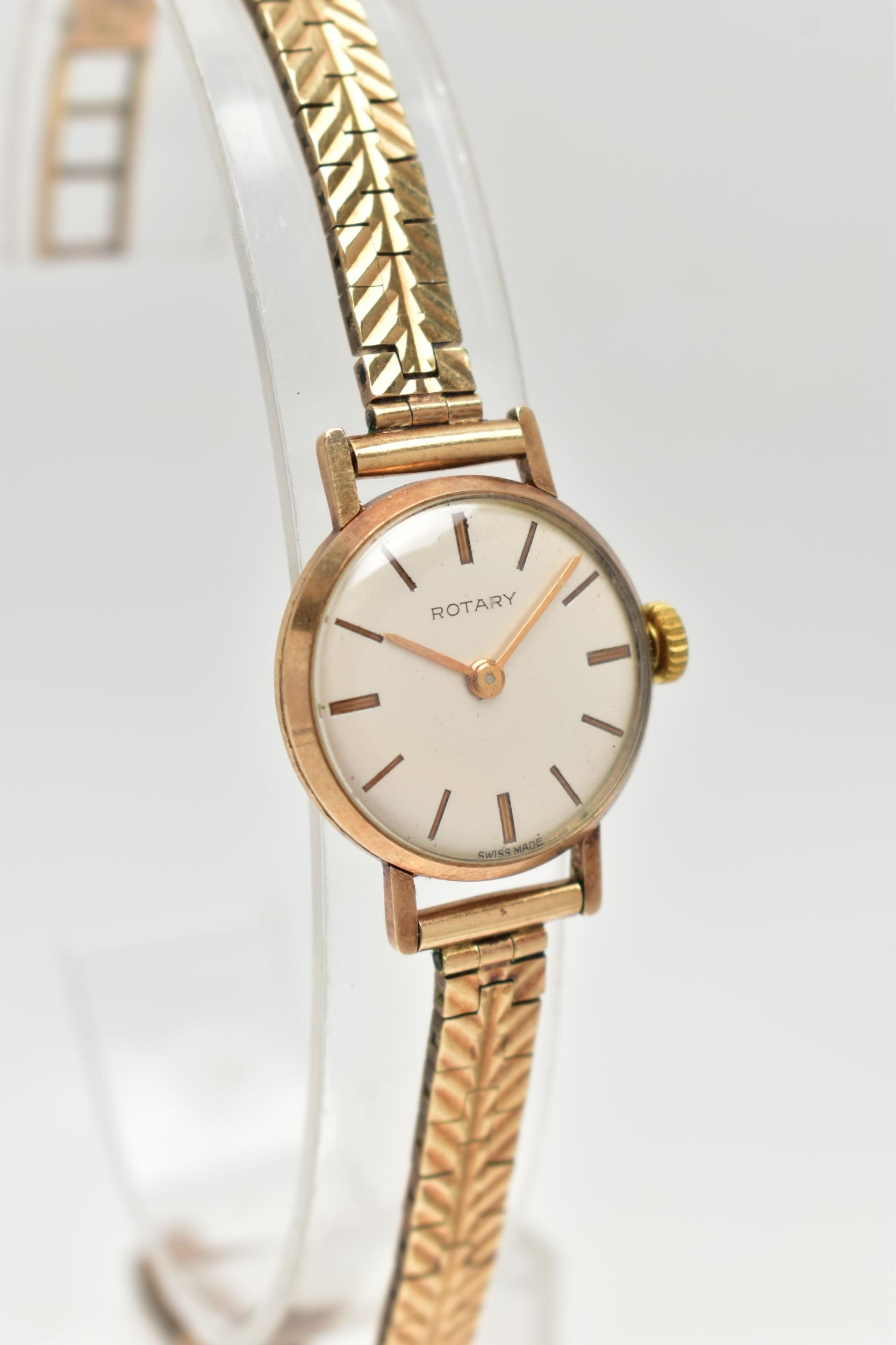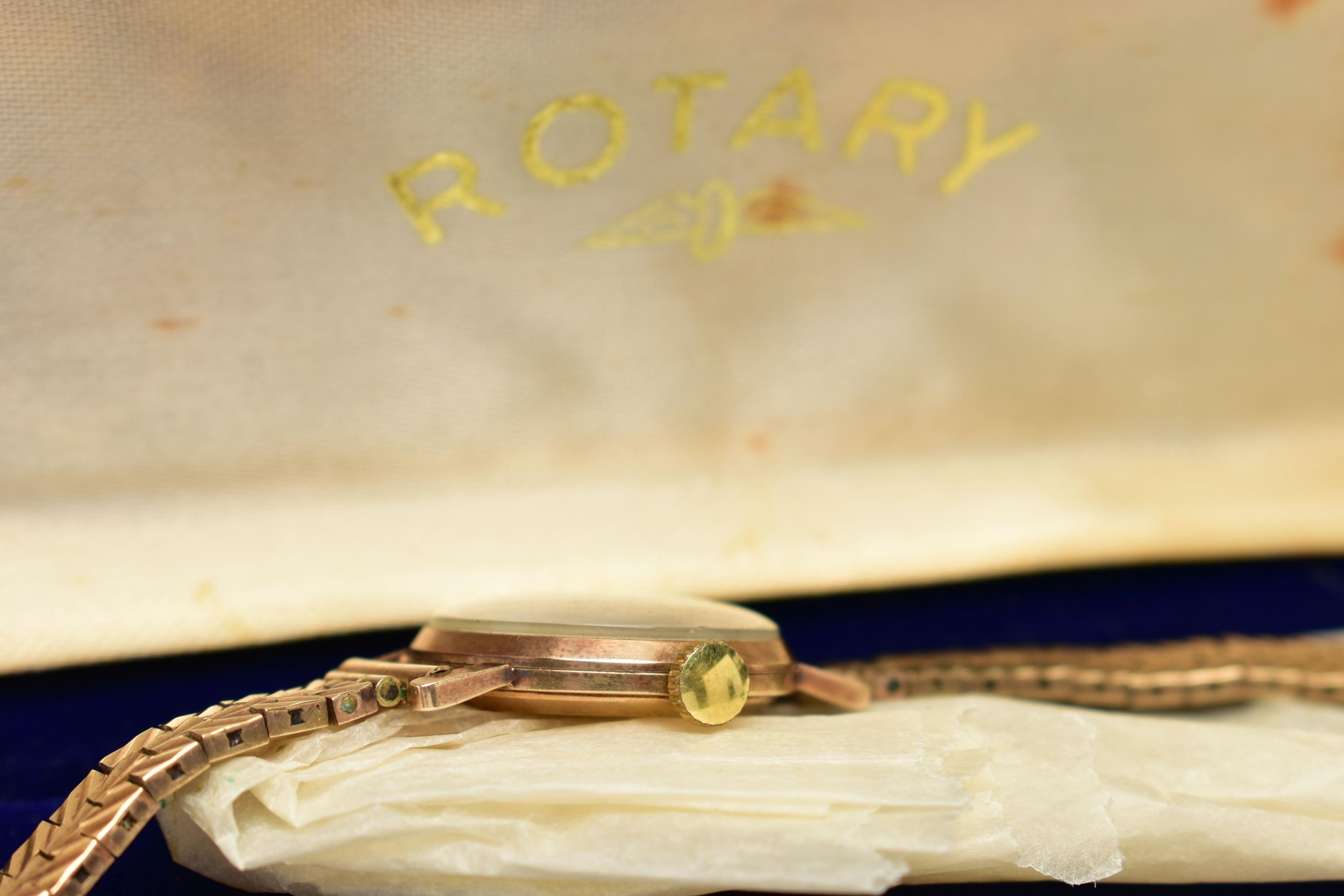A LADY'S 9CT GOLD 'ROTARY' WRISTWATCH, manual wind, round silver dial signed 'Rotary', baton markers, gold tone hands, within a polished case, inside case back stamped 218881, hallmarked 9ct London 1961, approximate case width 21.0mm, fitted with a diamond cut pattern, articulated bracelet and folding clasp, hallmarked 9ct London 1964, length 185mm, approximate gross weight excluding movement 16.6 grams, together with a fitted signed 'Rotary' box (condition report: watch winds, sets and runs at time of cataloguing, although time keeping is untested, general light wear, would benefit from a gentle clean and polish, overall condition good)