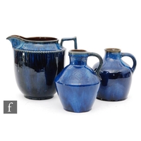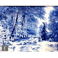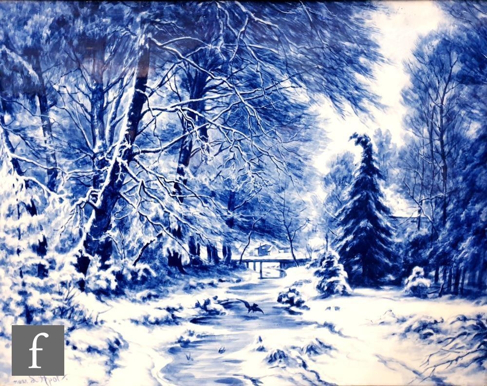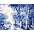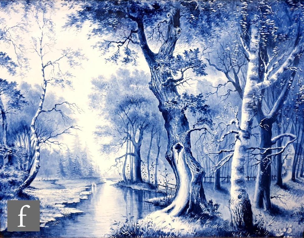 A large pair of 19th Century Dutch rectangular plaques hand painted by Louis Apol, with blue and white wooded landscapes, signed, any marks obscured by wooden panel back, possibly Villeroy and Boch or Royal Bonn, visible size 43cm x 57cm, framed 57cm x 72cm (2)