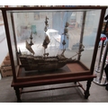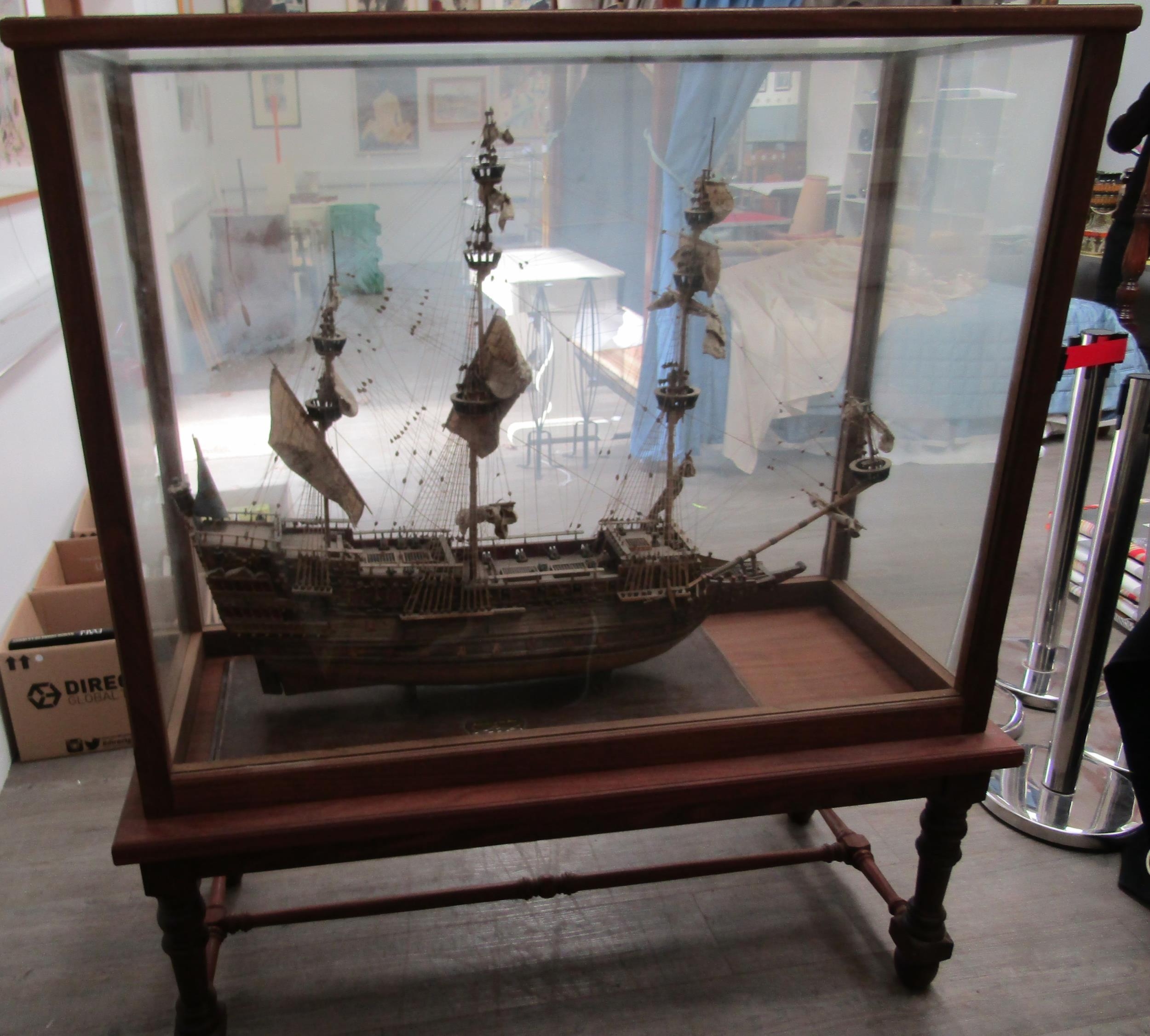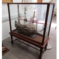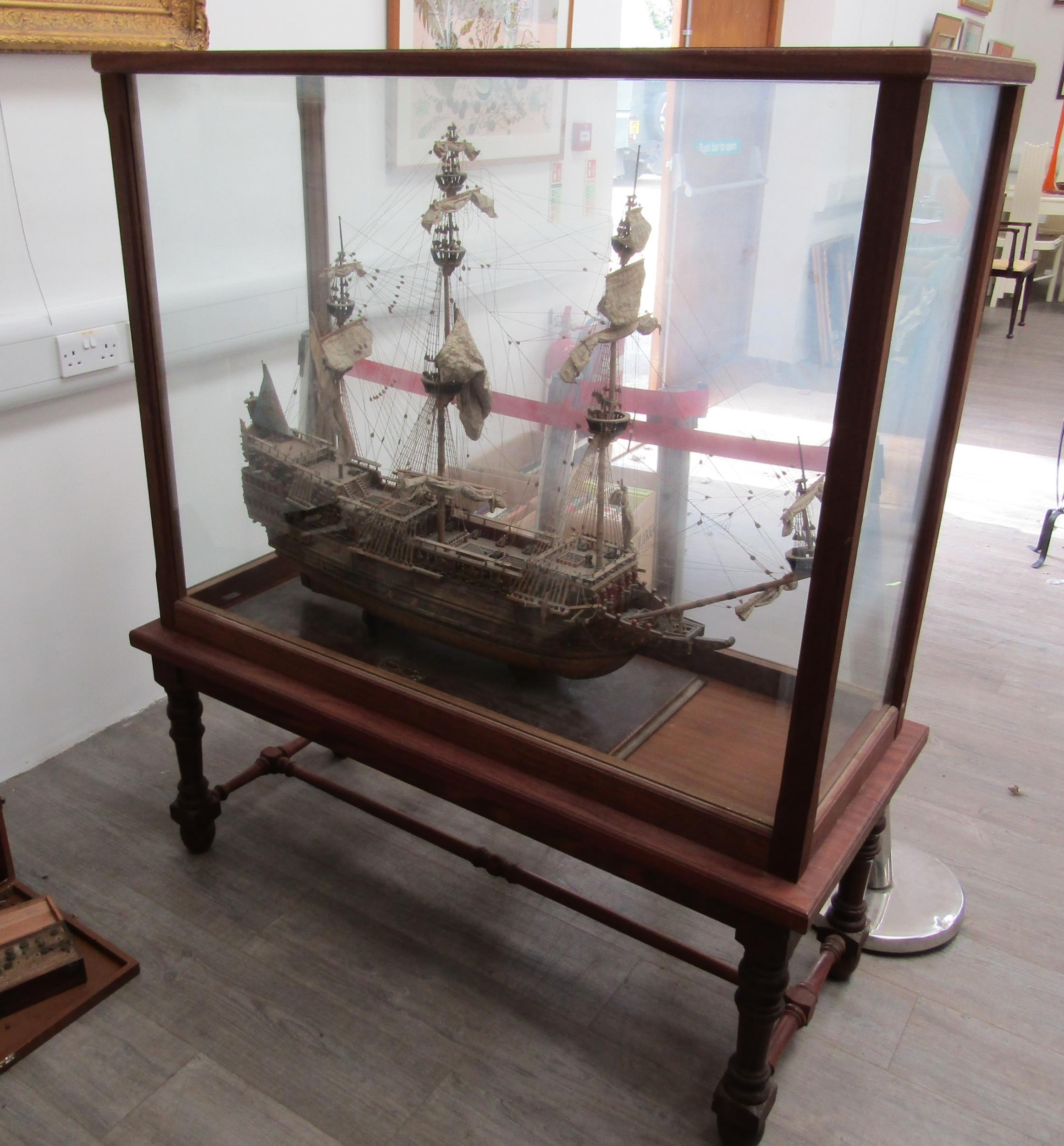 A mid 20th Century scale model of "The Sovereign of The Seas" set on a wooden base and specially made glass and hardwood cabinet on stand. Cabinet measures 128cm x 54.5cm x 146 cm high, boat 80cm high x 106cm long (C)