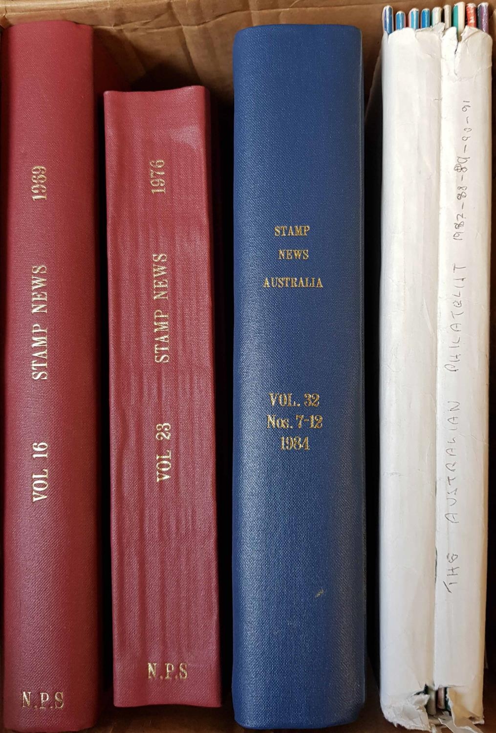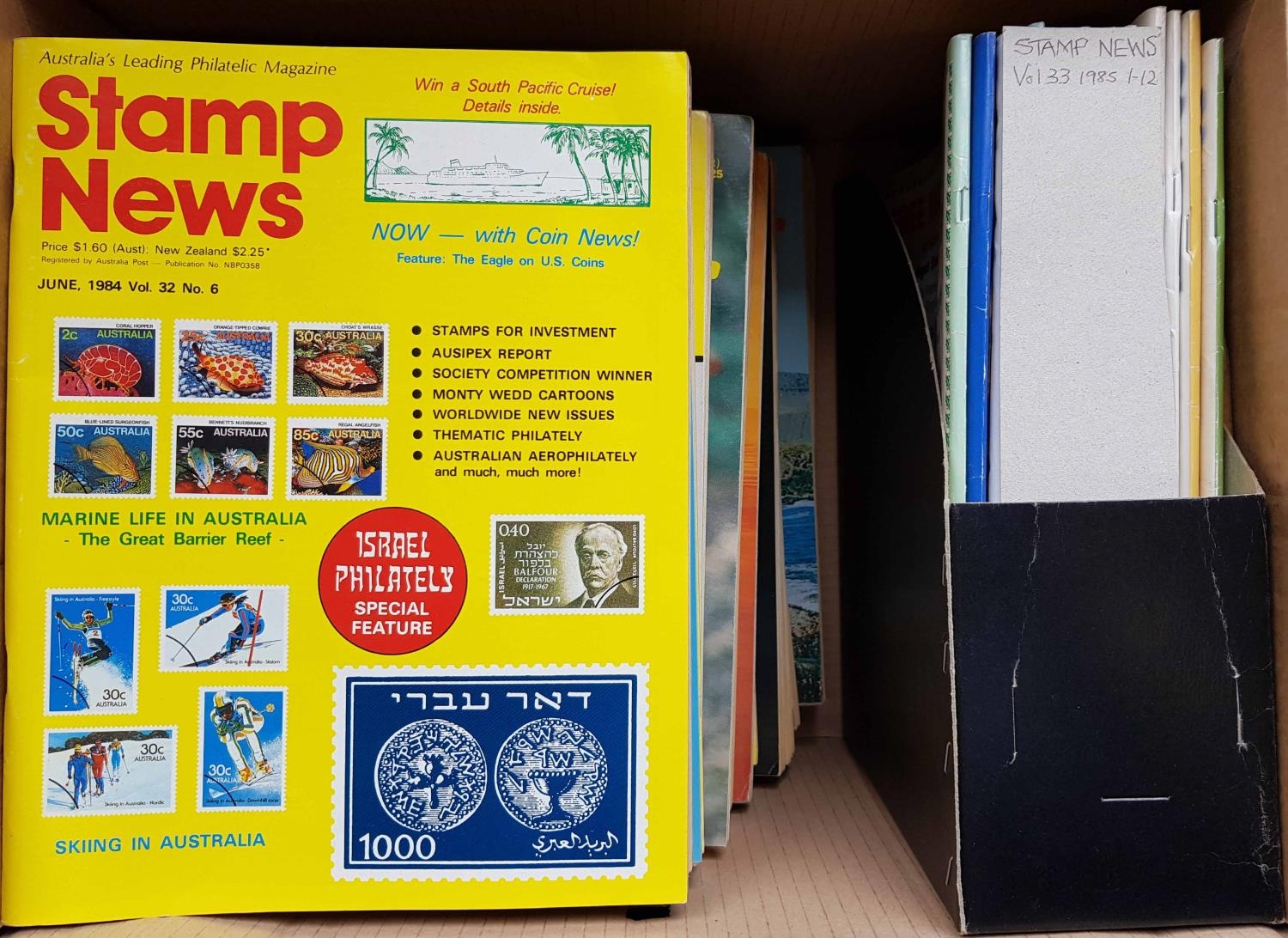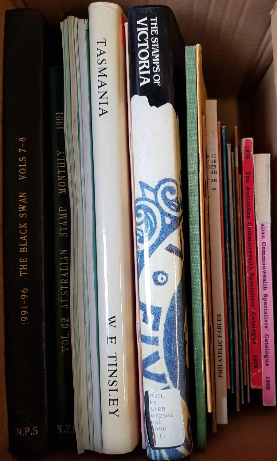 AUSTRALIA: Three boxes containing a mixture of books and journals, including Stamps of Victoria by Kellow, Tasmania by Tinsley, Stamp News in three HB volume plus box of unbound 1960s-1980s. (Many)Cross Reference: AUSTRALIA