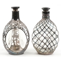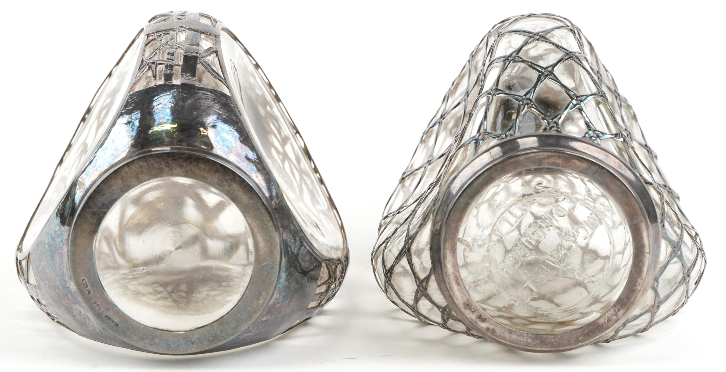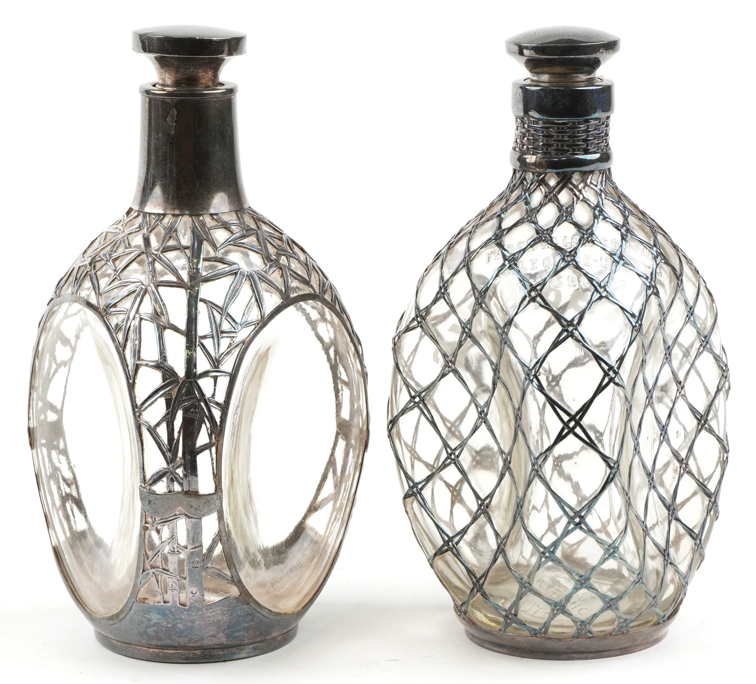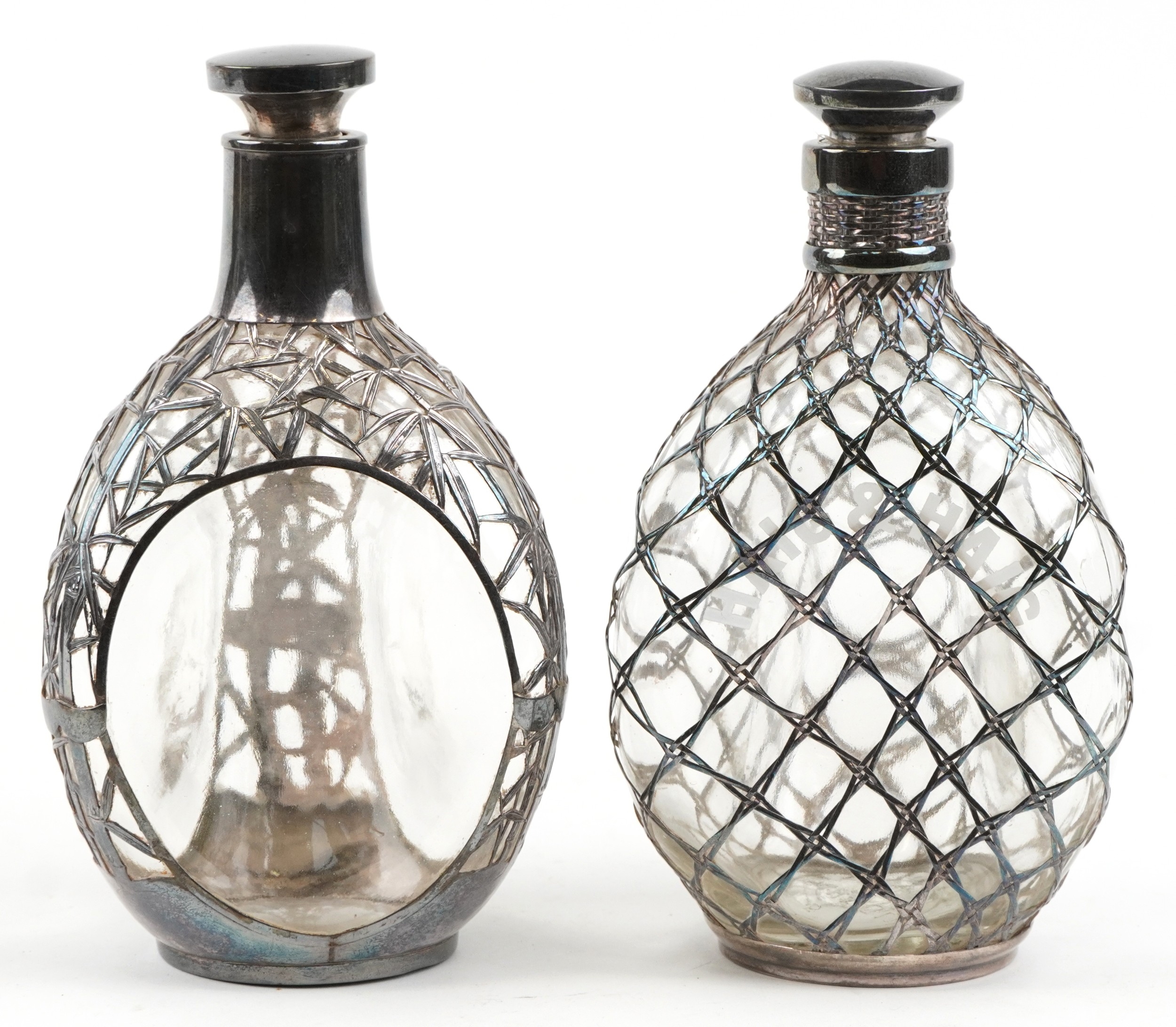 Two glass whisky decanters with 950 grade silver overlay comprising one inscribed Haig & Haig, the other with a Kuyeda bamboo design overlay, the largest 21cm high.