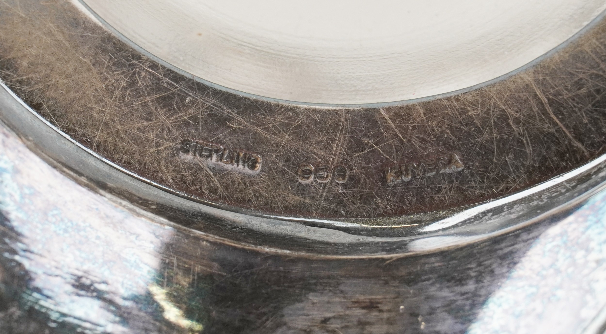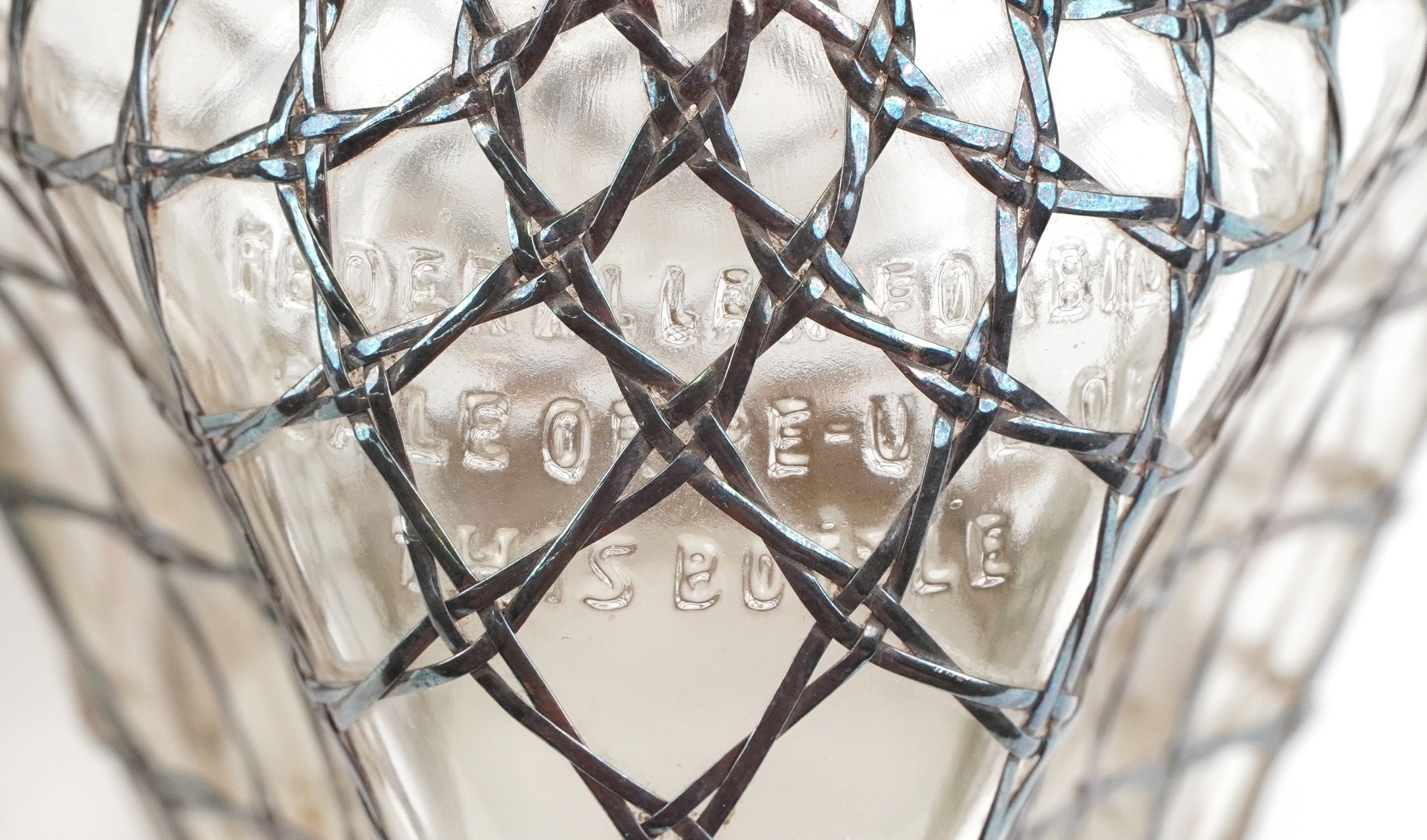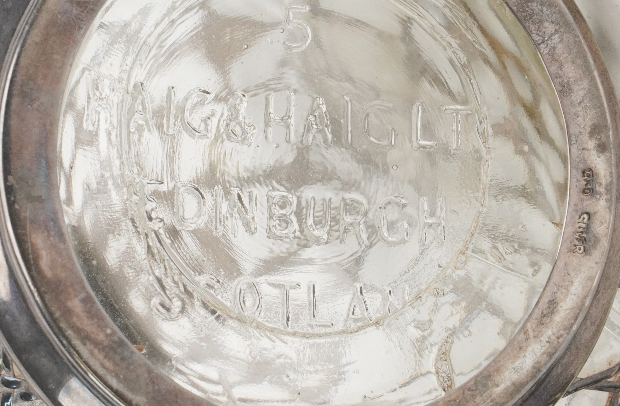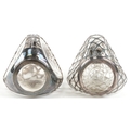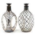 Two glass whisky decanters with 950 grade silver overlay comprising one inscribed Haig & Haig, the other with a Kuyeda bamboo design overlay, the largest 21cm high.