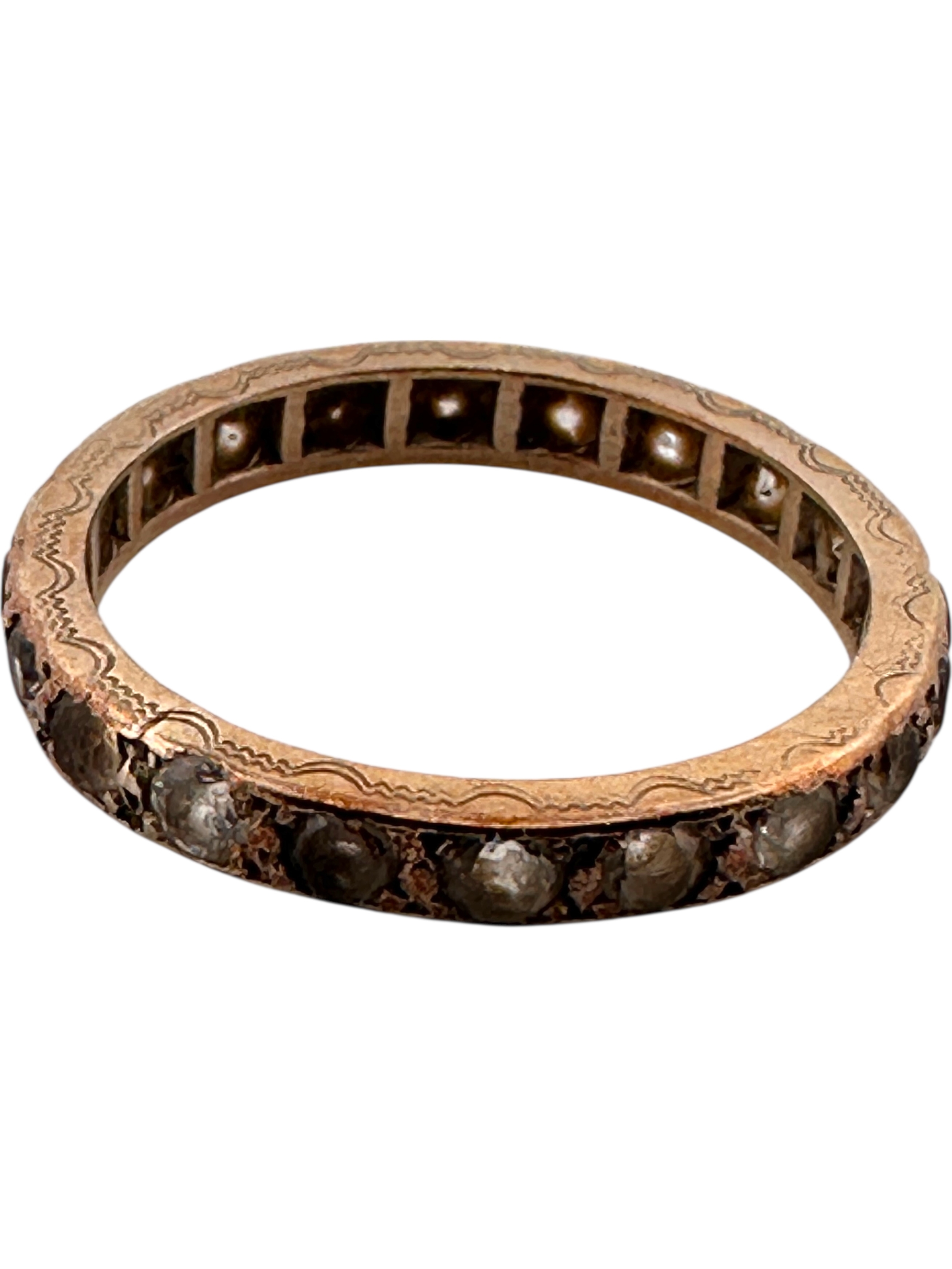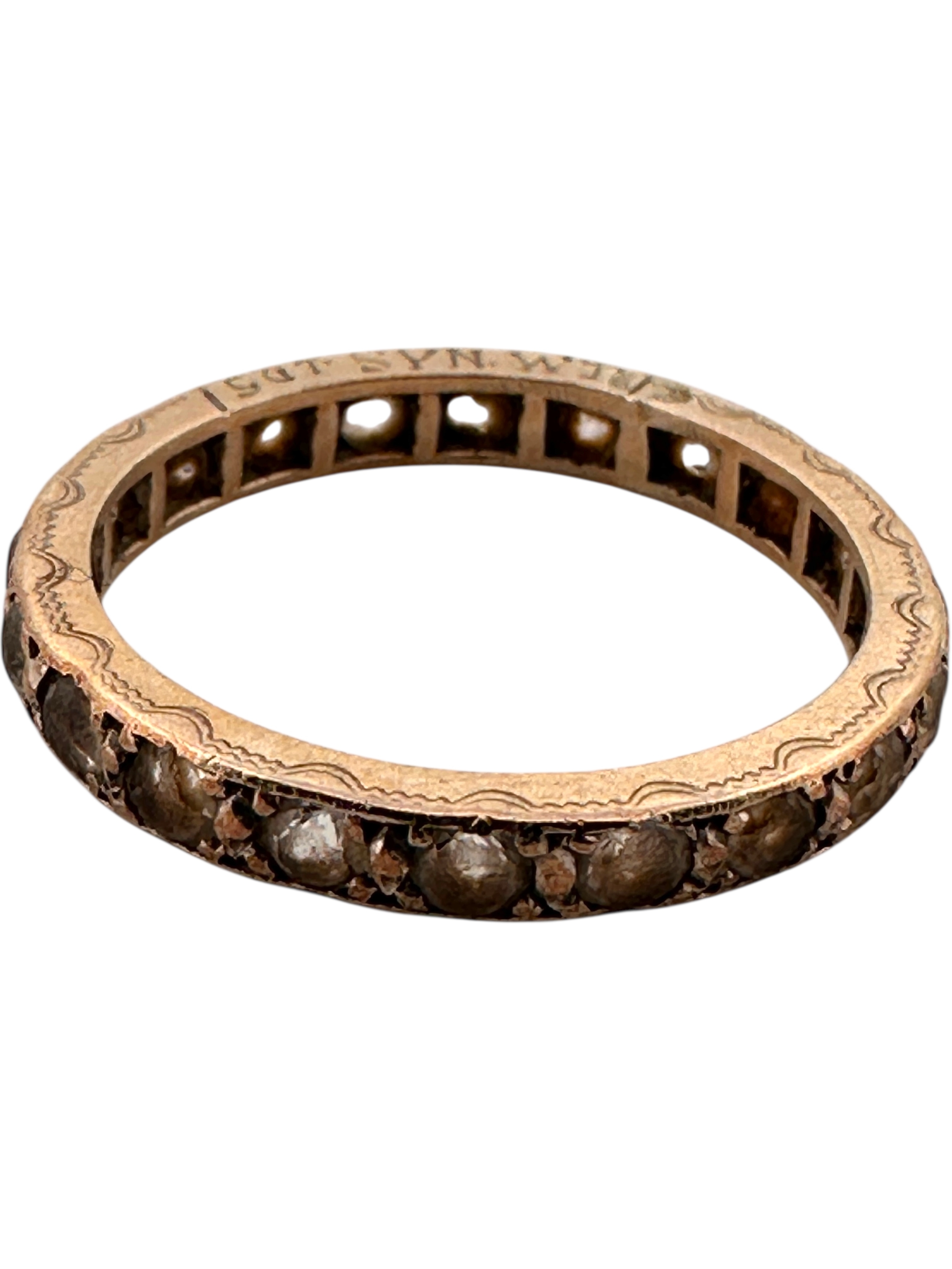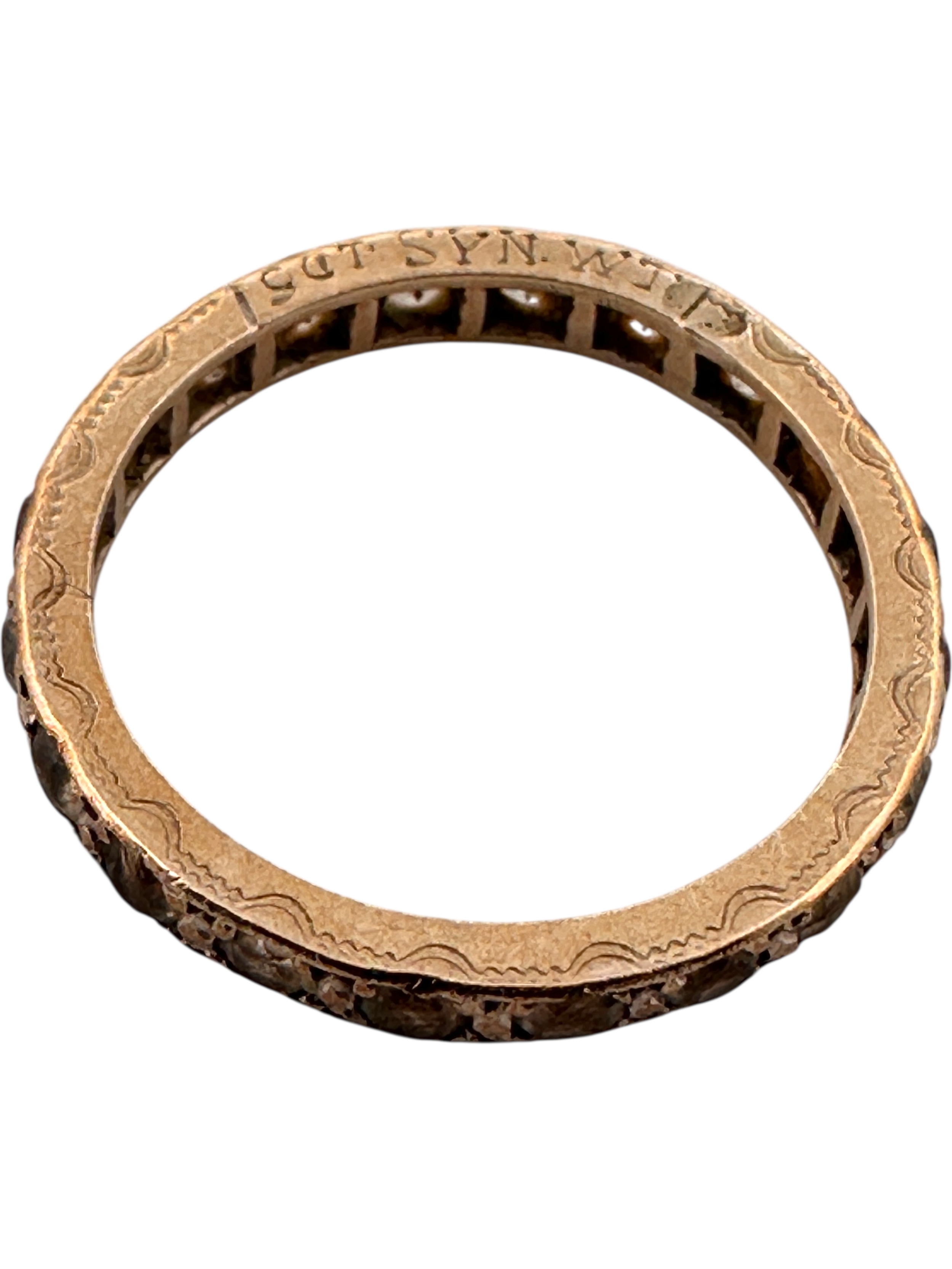 Antique Nine Carat Gold Eternity Ring with With Stones and Engraving to Band. 1.87g. Size L