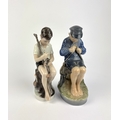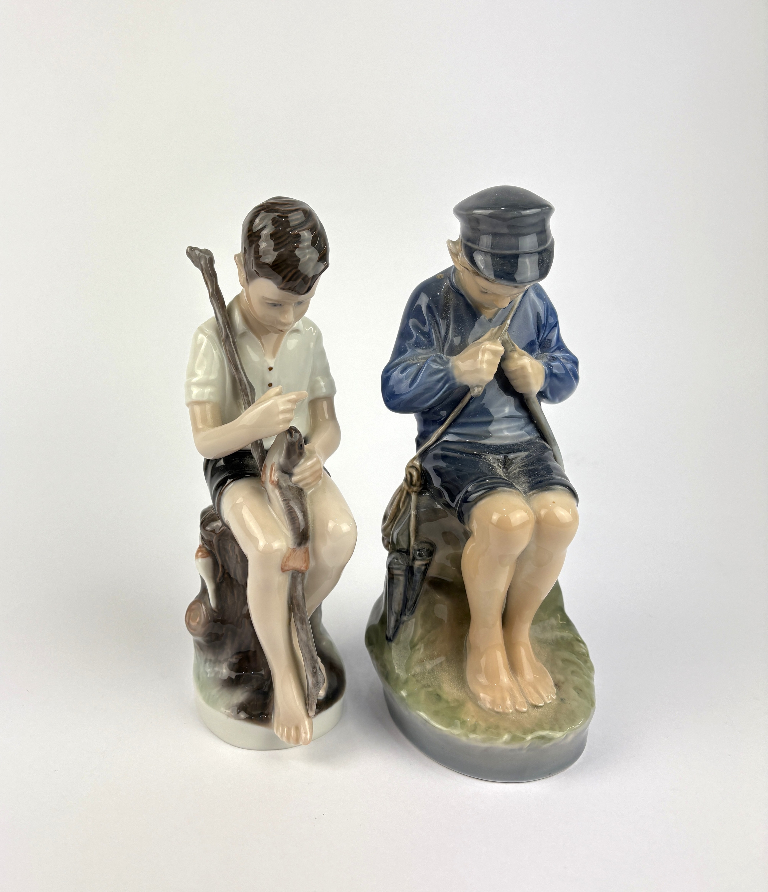 A Royal Copenhagen porcelain figure of a boy whittling a stick no 905, 19cm high, and a Lyngby porcelain model of a boy sitting on a tree trunk with fishing rod and fish 18.5cm high