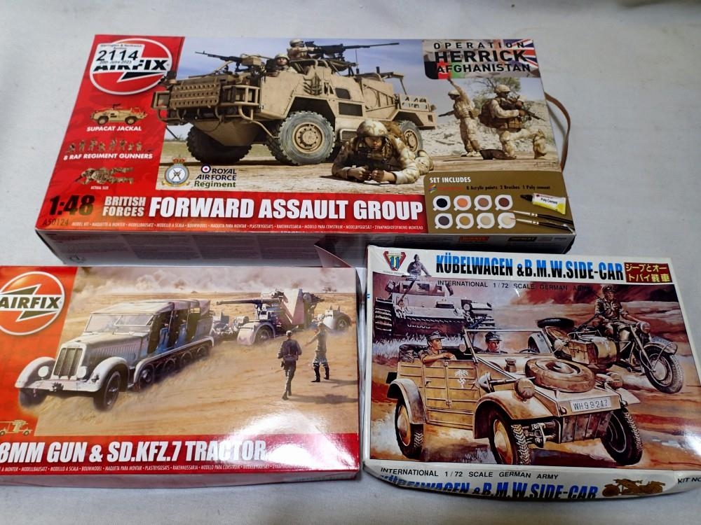 Three military related kits to include 1/48 scale Forward Assault Group Afghanistan, 1/76 scale 88mm gun and tractor, and 1/72 scale Kubelwagon with BMW/sidecar, all appear complete, wear to boxes, unchecked. P&P Group 1 (£14+VAT for the first lot and £1+VAT for subsequent lots)