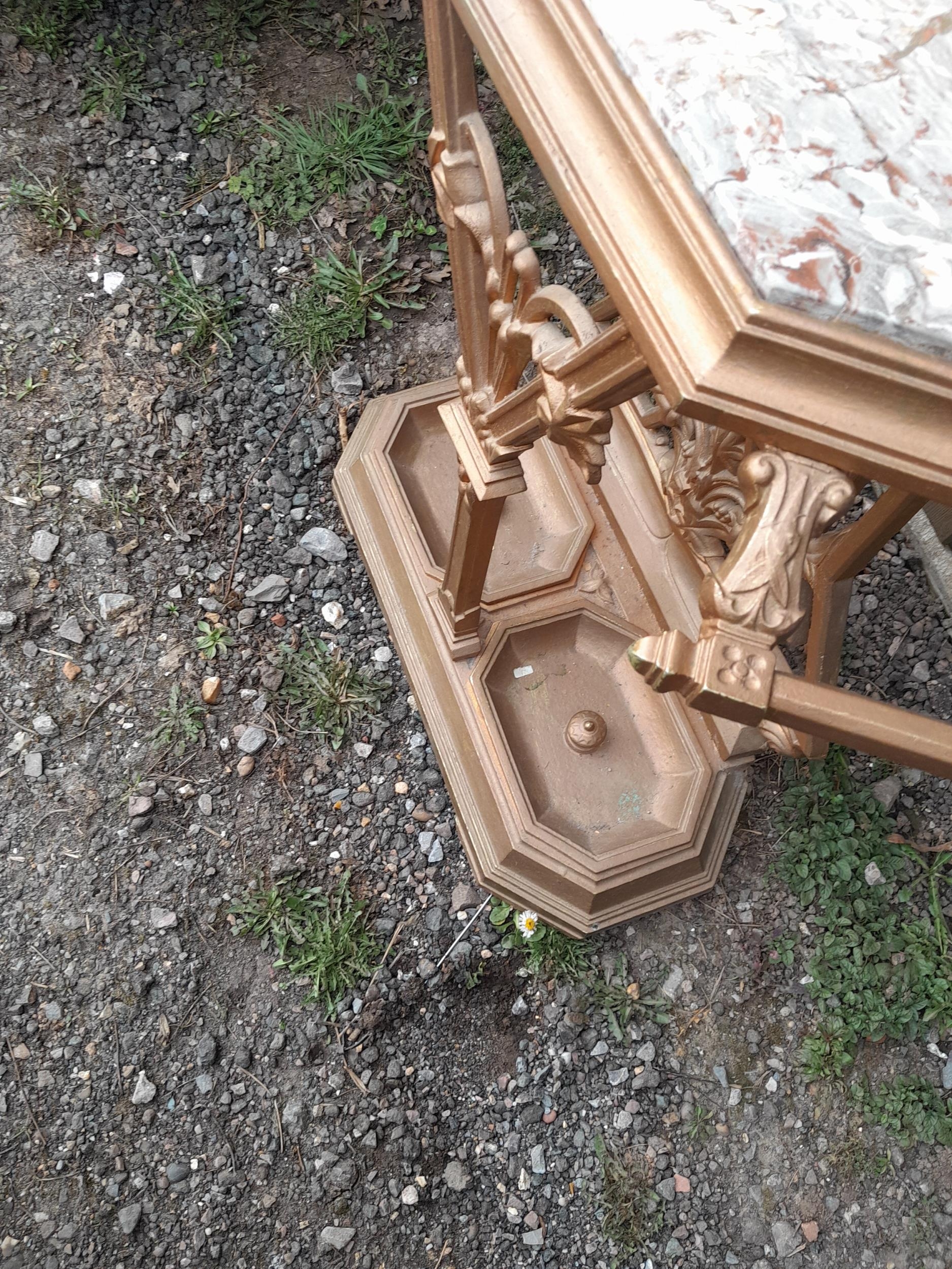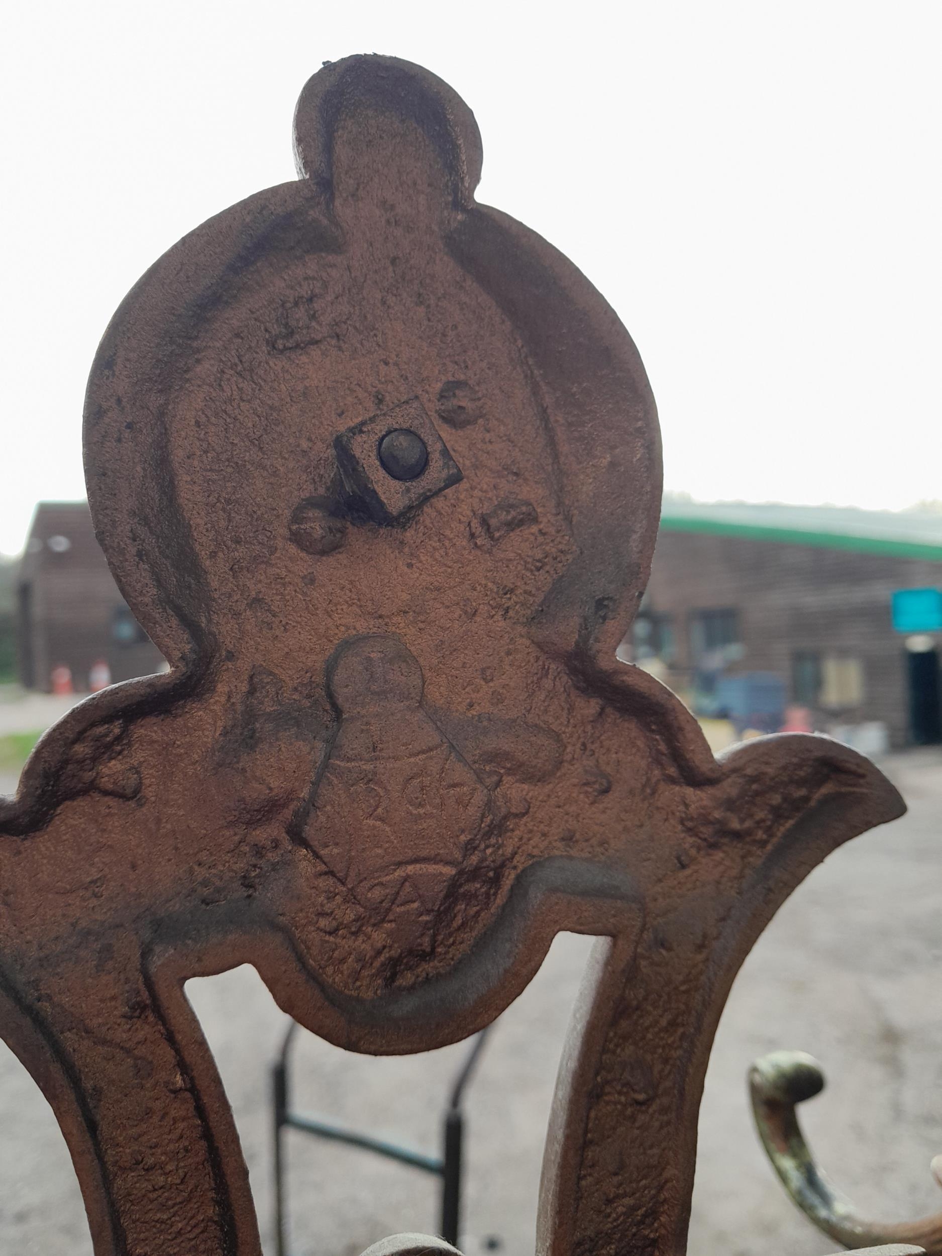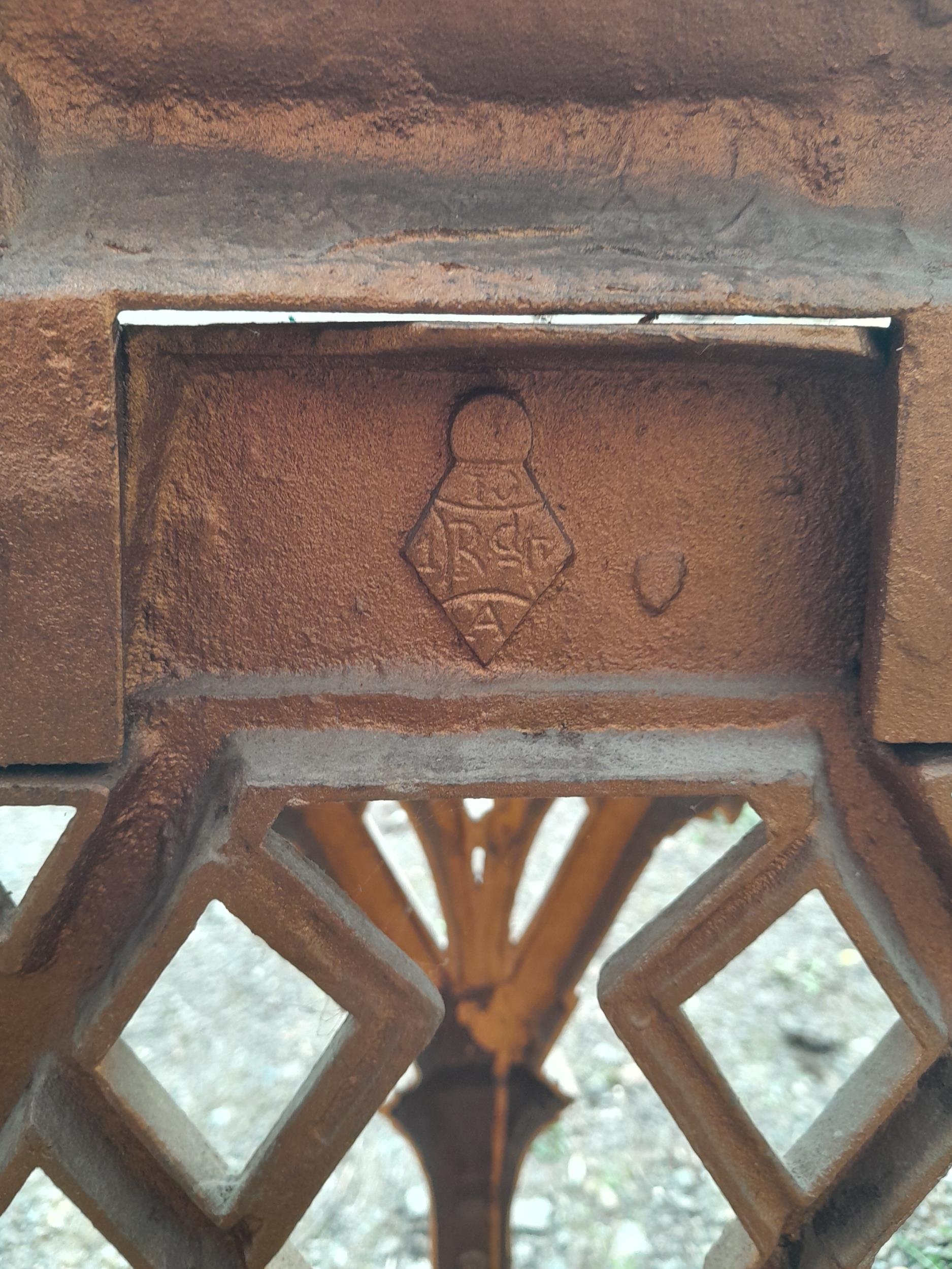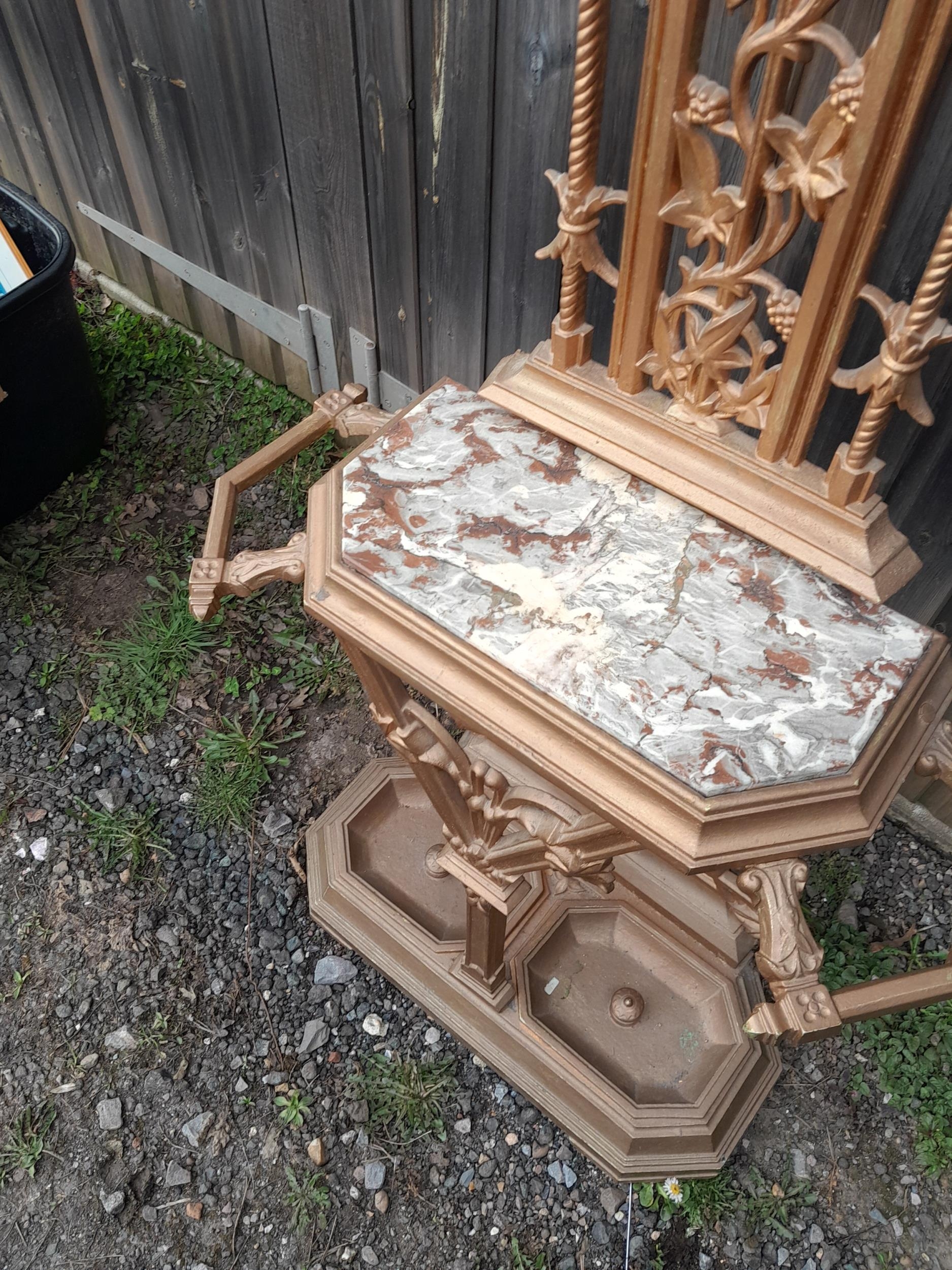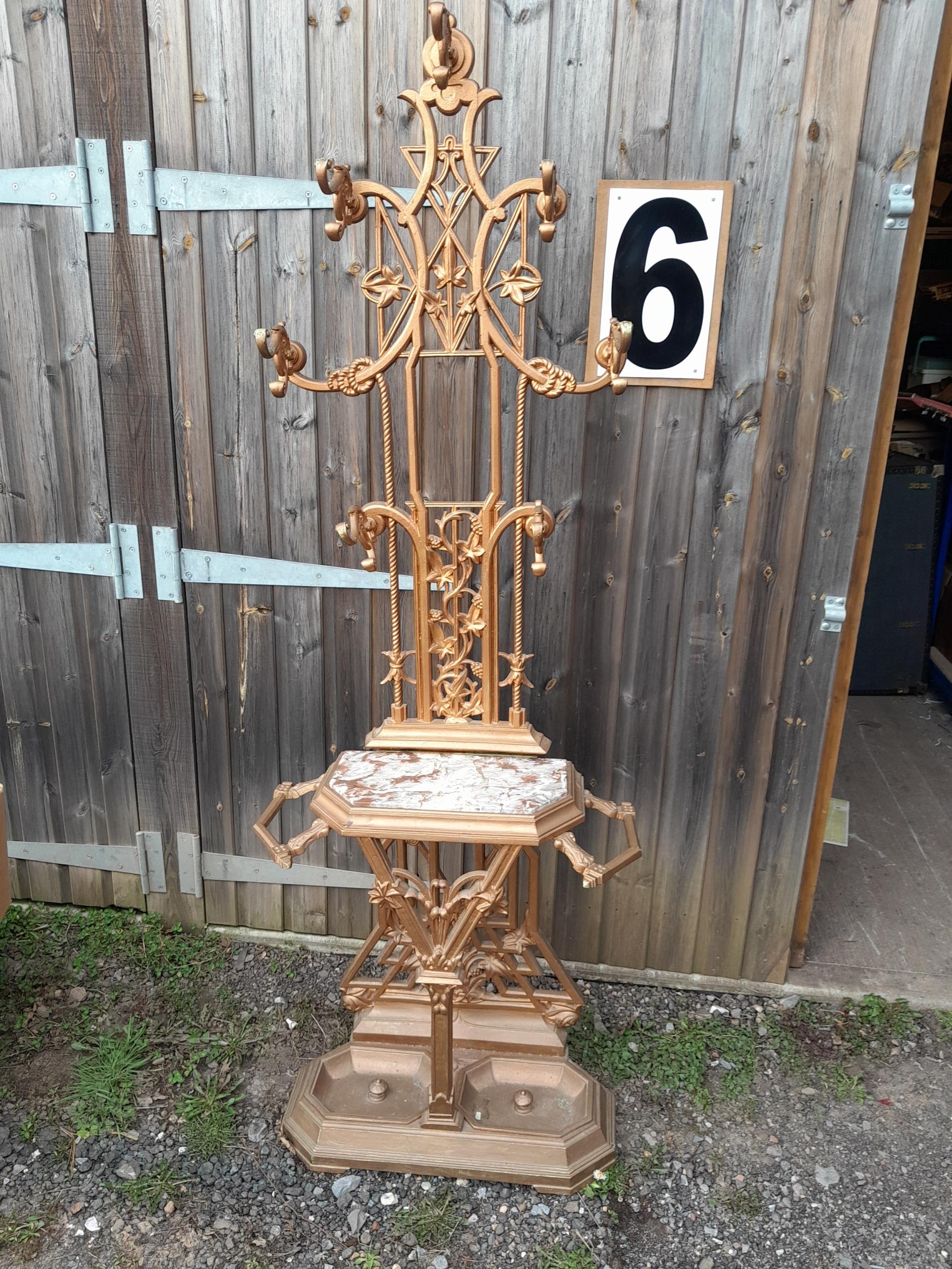 Victorian cast iron hall stand with removable water catchers, marble inset with two registration marks on reverse, no maker mark