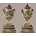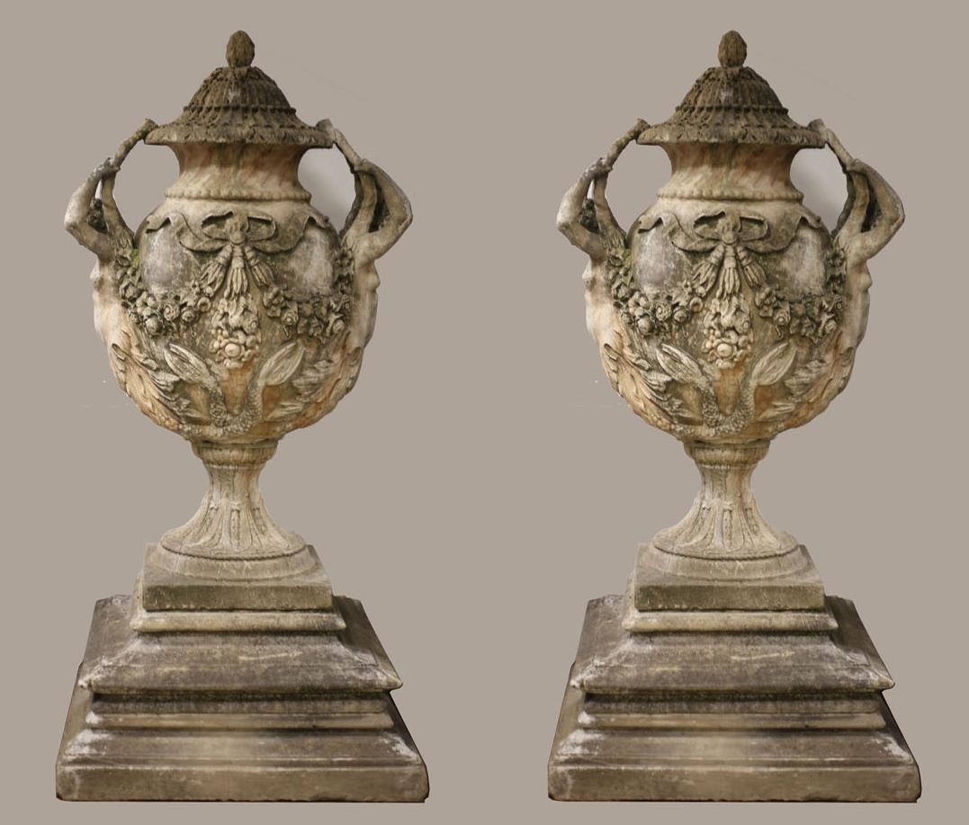 A VERY FINE AND IMPRESSIVE PAIR OF SANDSTONE URNS each of ovoid tapering form hung with ribbon tied floral festoons flanked by figural handles above a waisted sockel with square base raised on a stepped base 220cm (h) x 98cm (d)