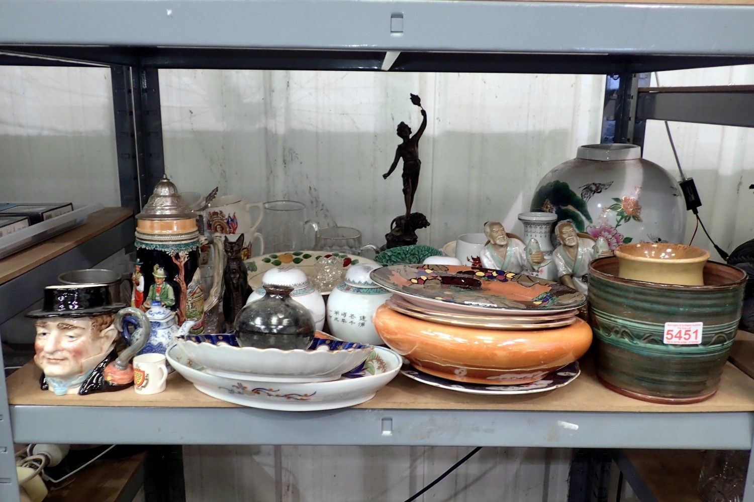 Shelf of mixed ceramics to include oriental. Not available for in-house P&P