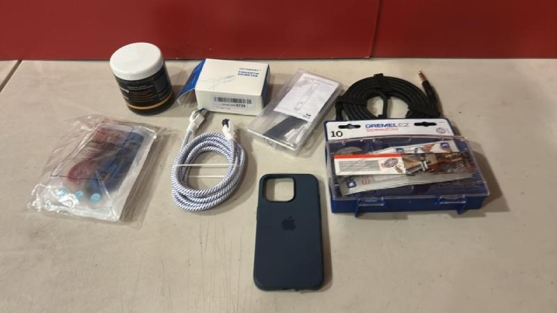 ASSORTED ITEMS INC. APPLE PHONE CASE, DREMEL GRINDING PADS, ...
