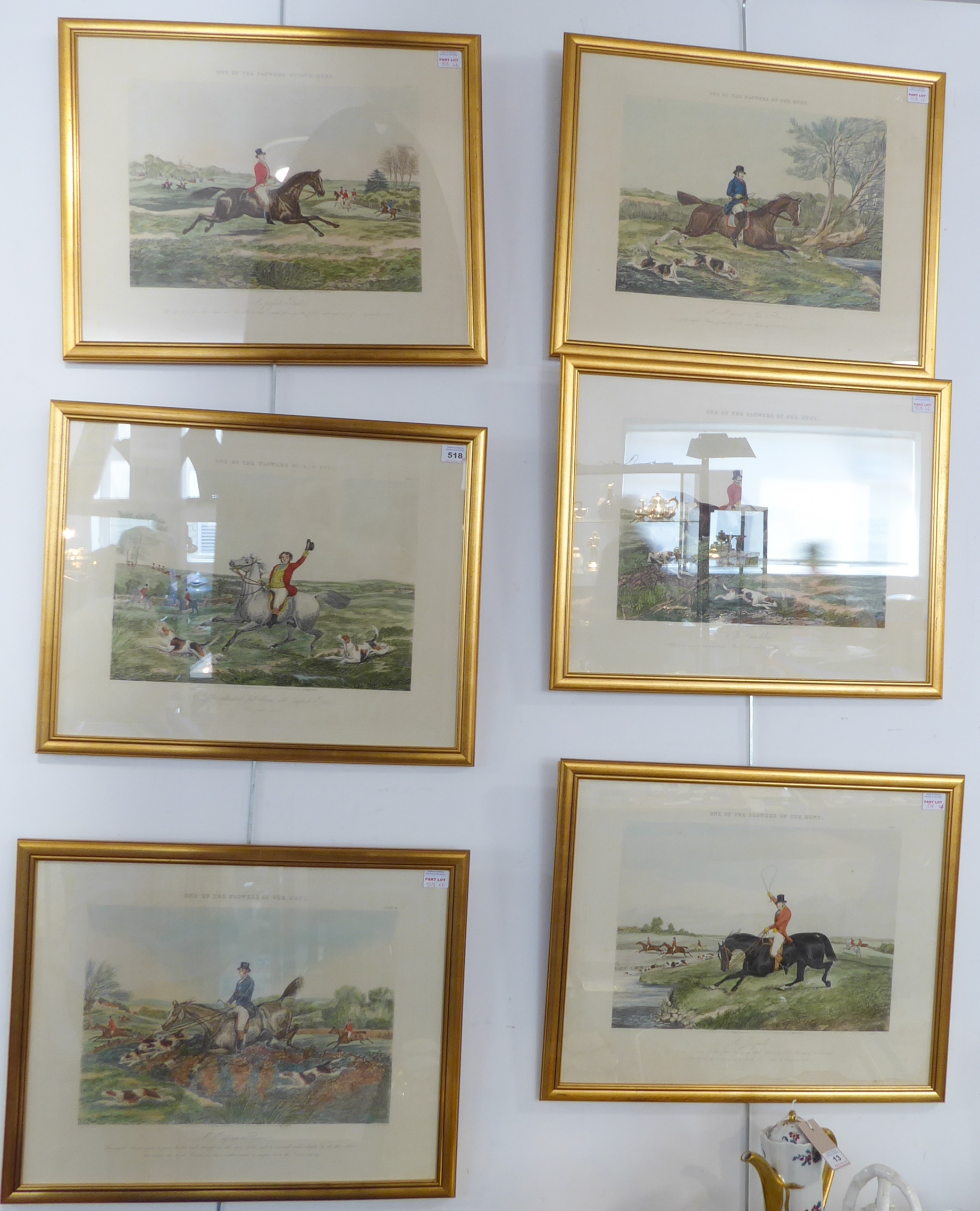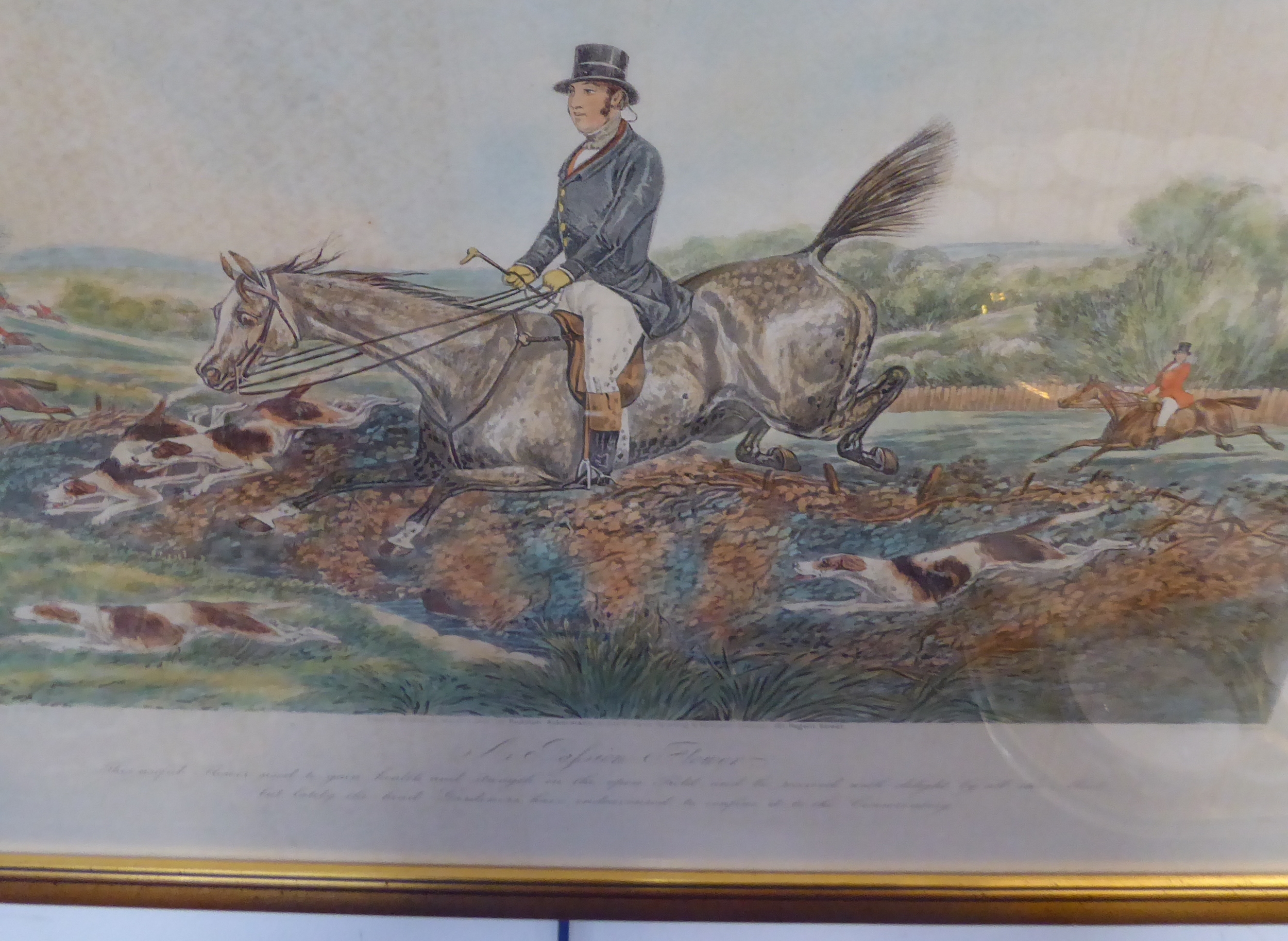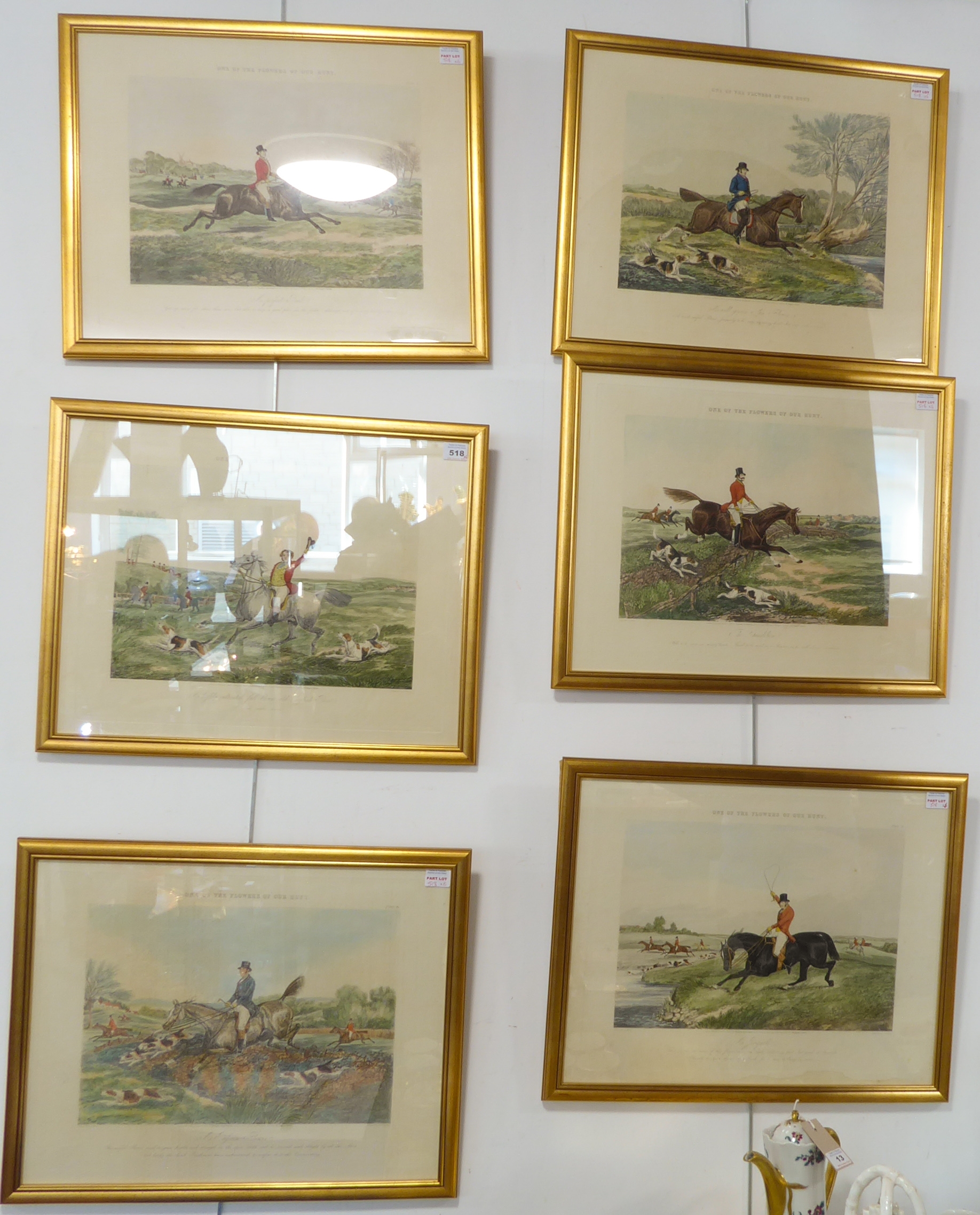 After HENRY ALKEN - a good set of six mid-19th century hand-coloured engravings, 'One of the Flowers of Our Hunt'. Published 1851 by Rudolf Ackermann - 191 Regent St., London. Engraved by J. Harris. Later glazed gilt frames. (Plate sizes 37 x 45.5 cm)