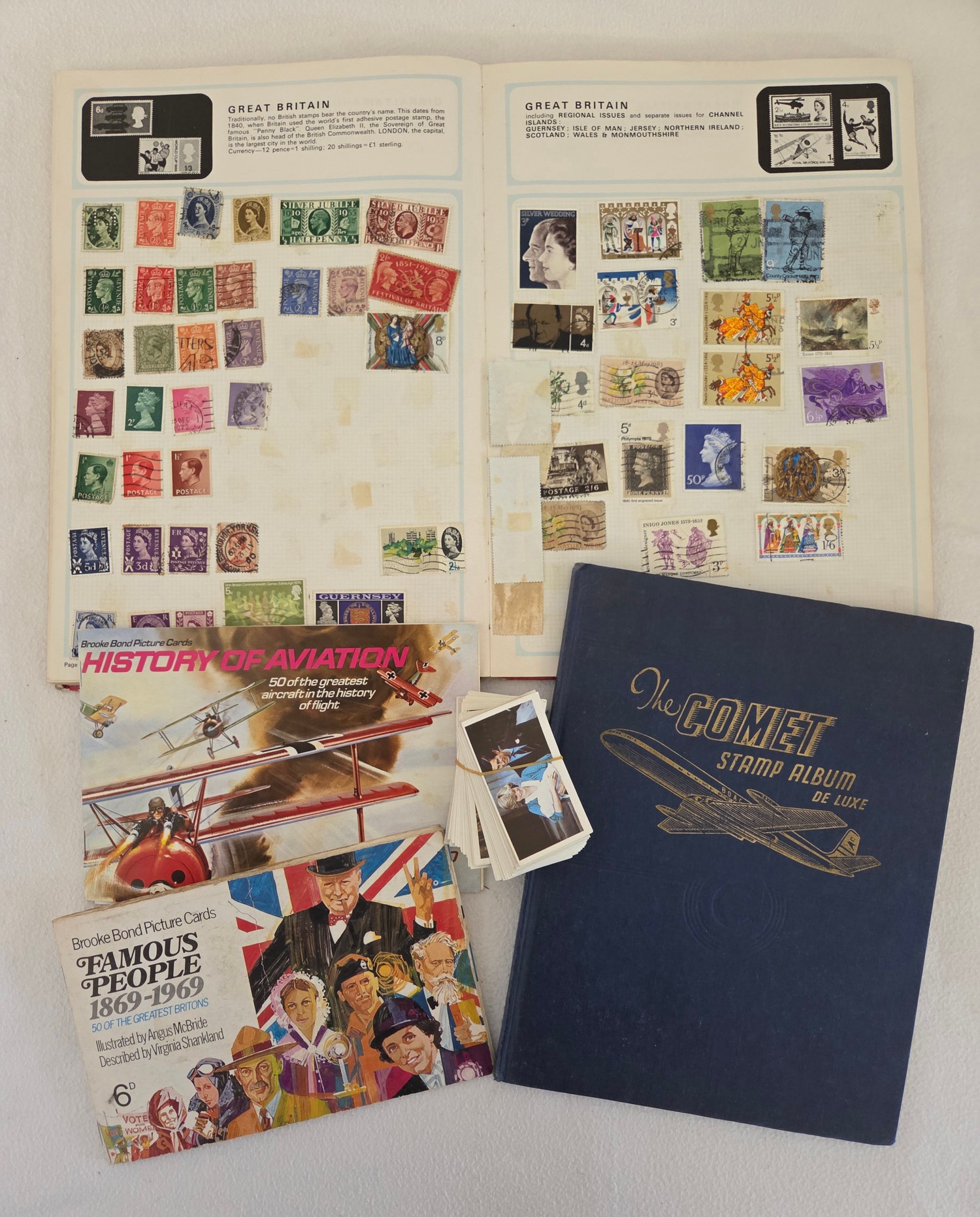 Two albums of world stamps, a Brooke Bond Famous People tea card album, loose tea cards etc