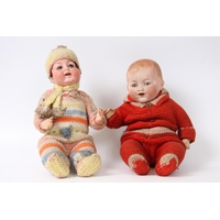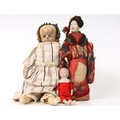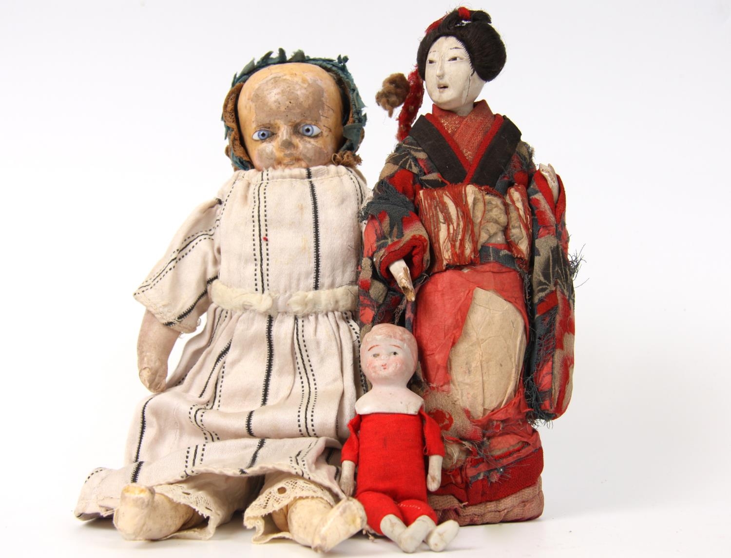 An early 19th Century wax over composition head doll, fixed blue glass eyes, partly stuffed body, composition arms and legs, 37.5cm tall; a miniature bisque head and shoulder doll, bisque arms and legs, 13.5cm tall and a Japanese Geisha girl doll, painted composition type face, painted wooden arms and legs, 24cm tall (3)
