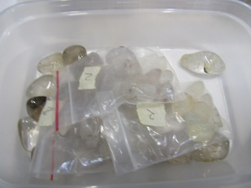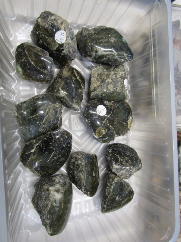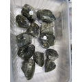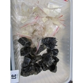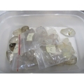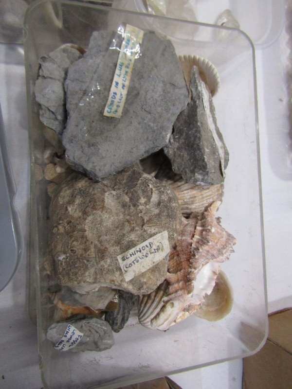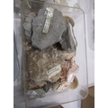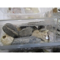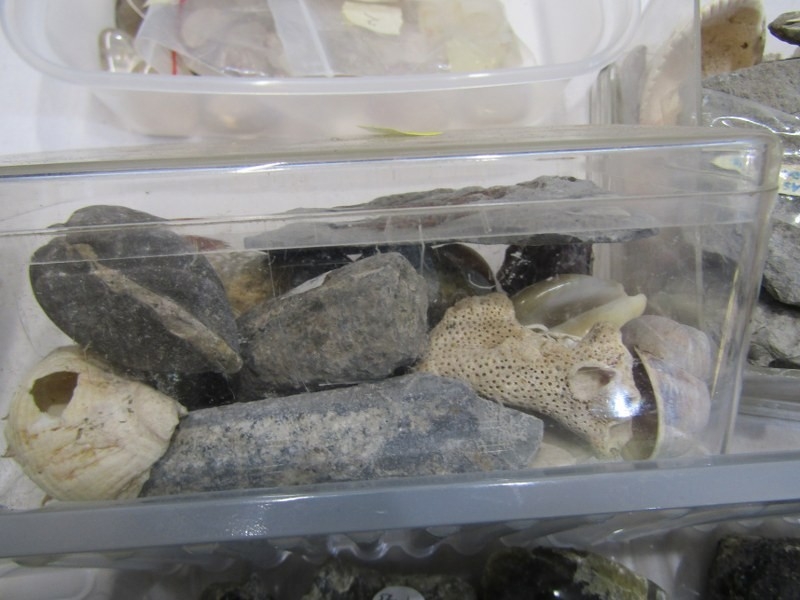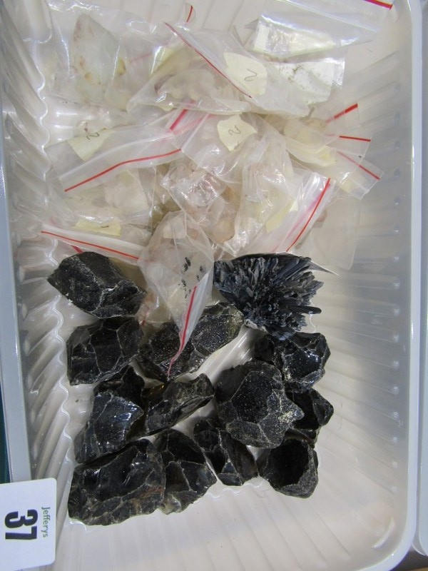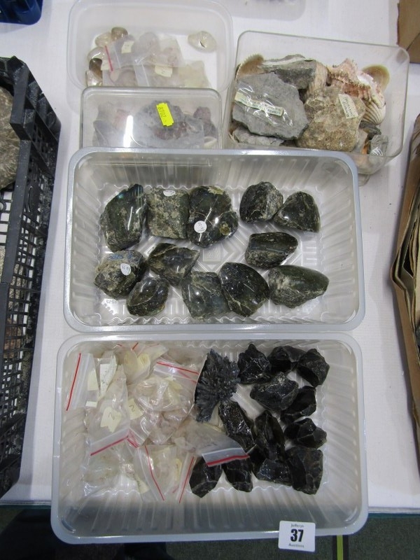 MINERAL SPECIMENS, small crate of black amethyst, another labradorite, also sea shells, etc