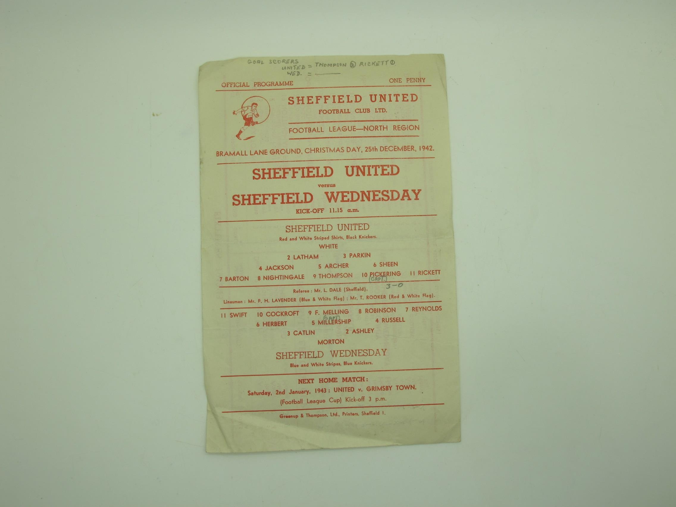 1942-3 Sheffield United v. Sheffield Wednesday Programme, single sheet issue, dated Christmas Day 1942, (light creases, pencil team changes).