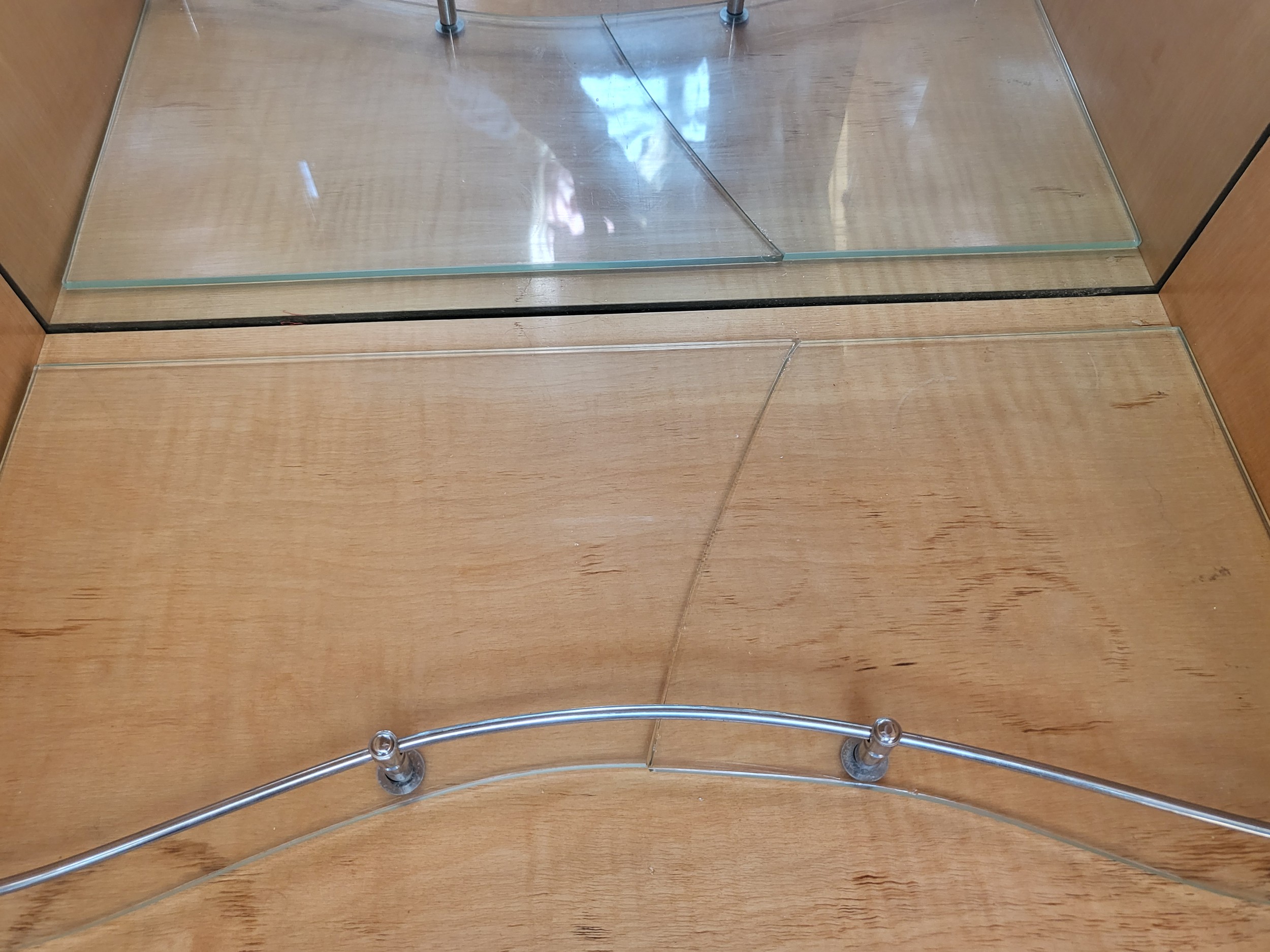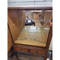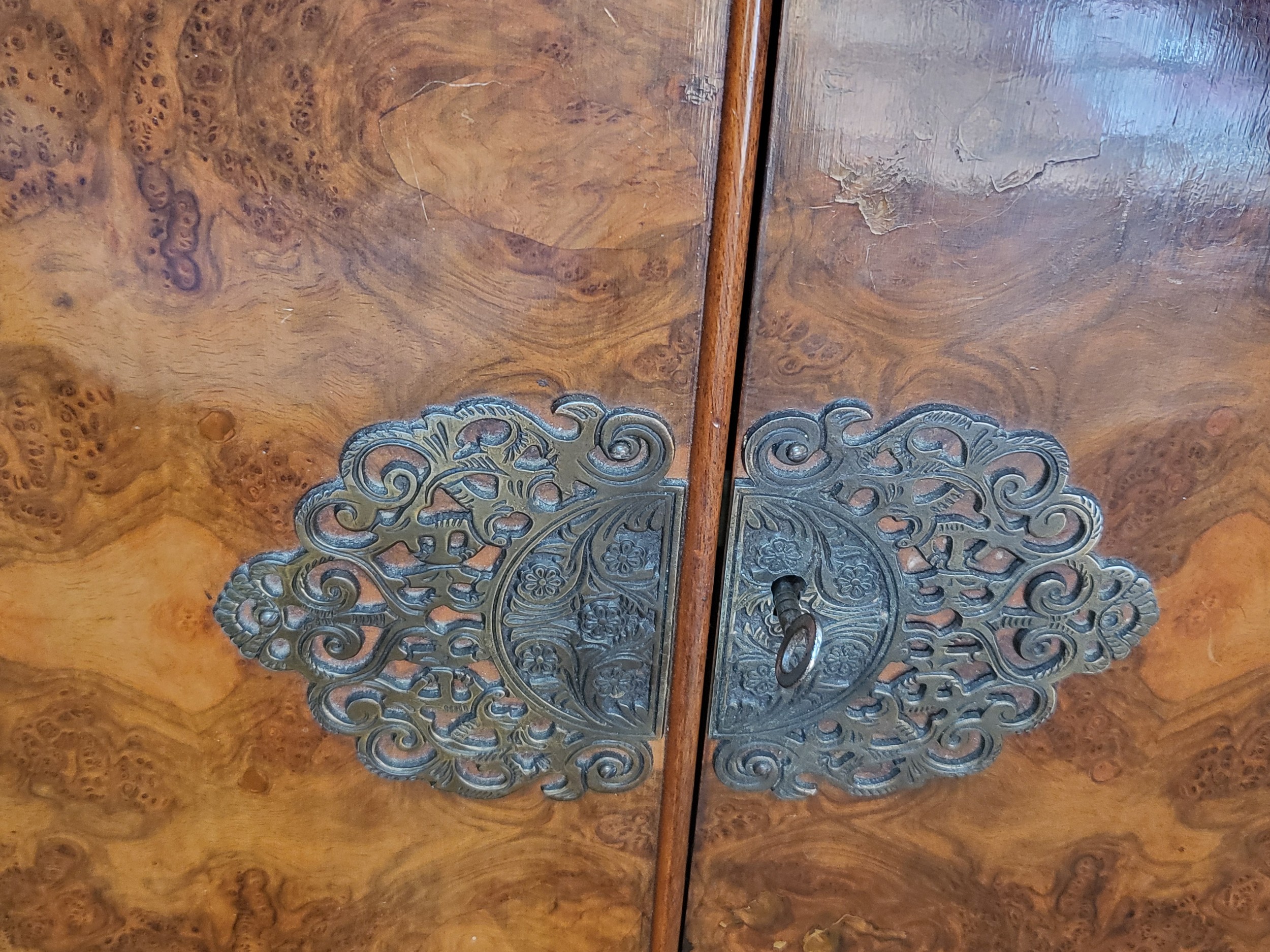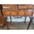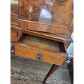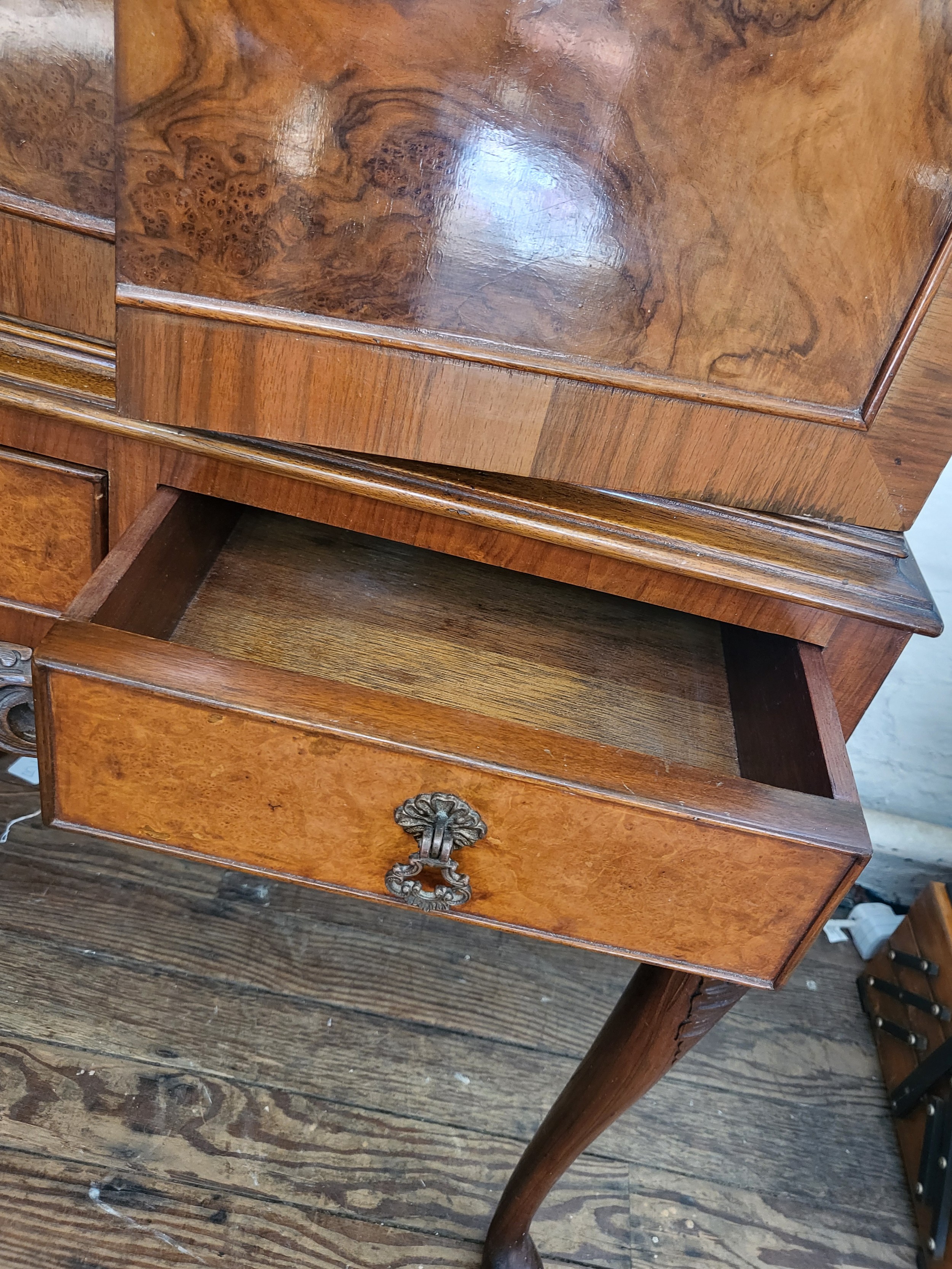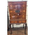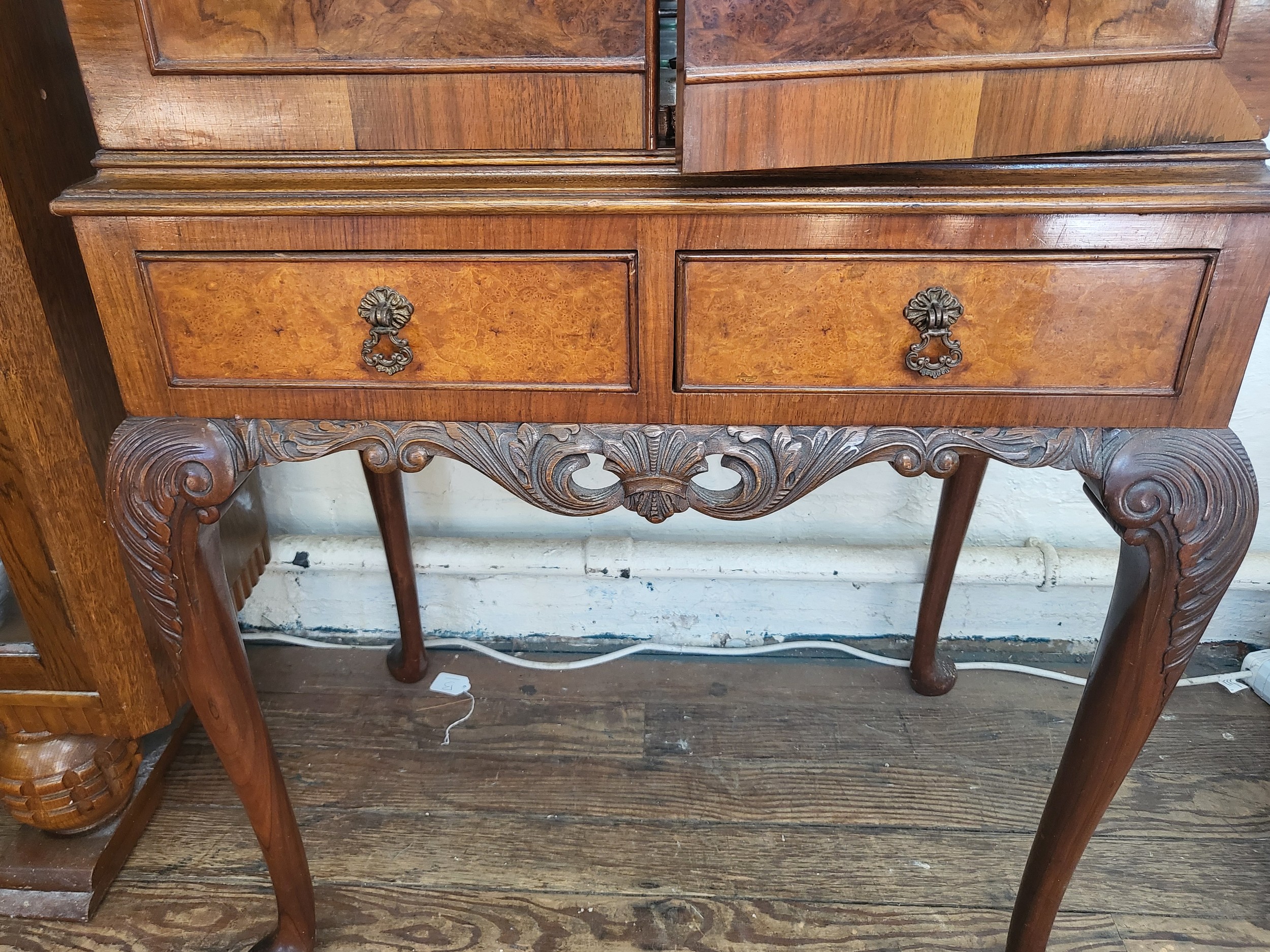 A two-door cocktail mirror-back cabinet (with broken glass shelf), over two short drawers supported by cabriole legs. 138 x 64 x 42cm