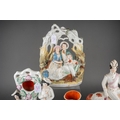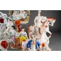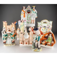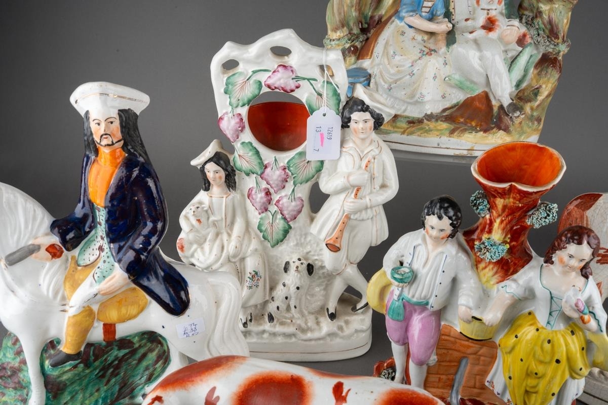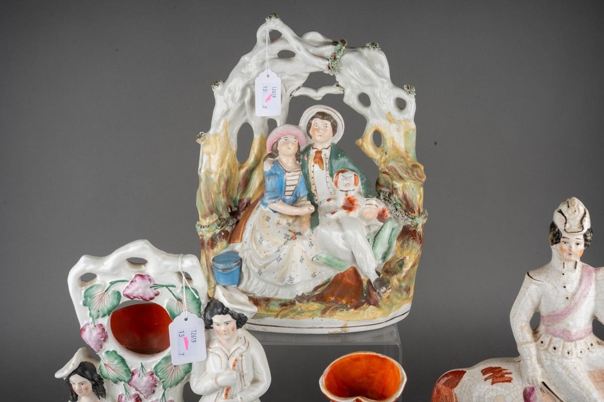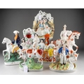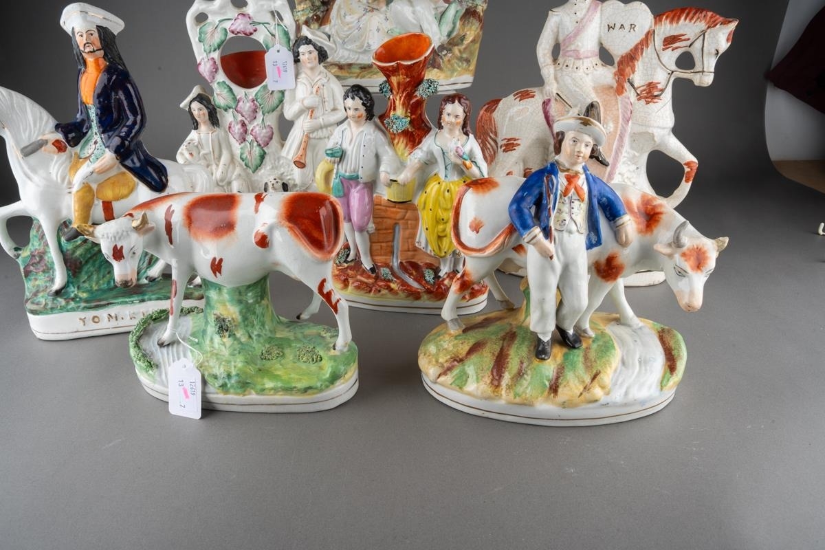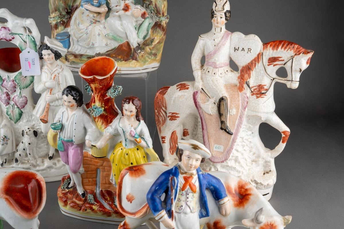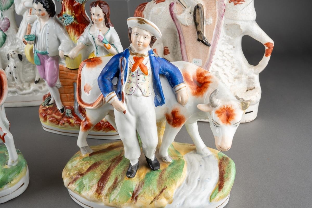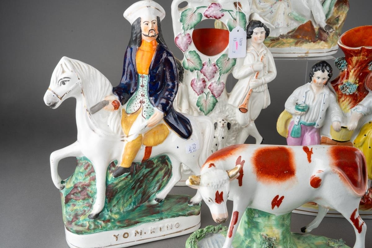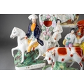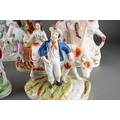 A collection of seven Victorian Staffordshire pottery figures, comprising a cow by a stream (restored horn), height 15cm approx, cow herd with cow (broken horn, boy glued at neck, back of cow chipped), spill vase with a couple by a well, height 25cm approx, Tom King on horseback, height 28.5cm approx, an arbour group of lovers with spaniel, height 30.5cm approx, a watch holder group (cracked at the back) and a soldier on horseback "War", extensive crazing, firing faults and cracks) height 33cm approx (7)
