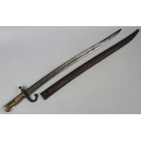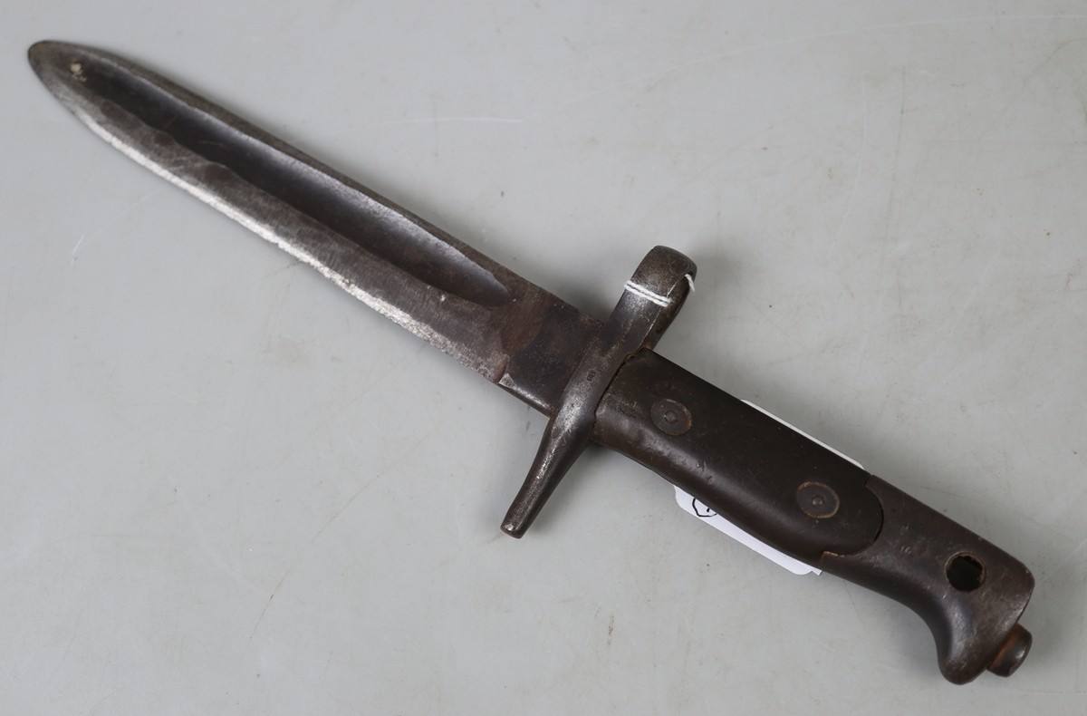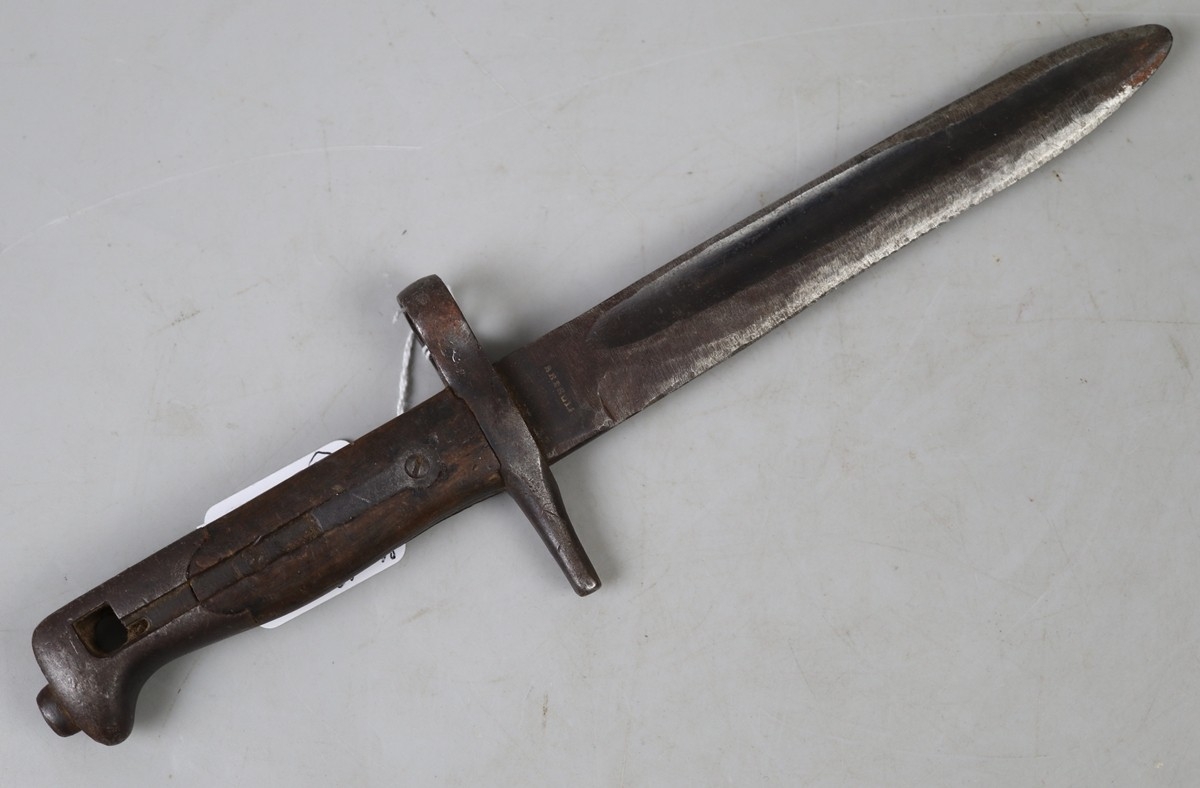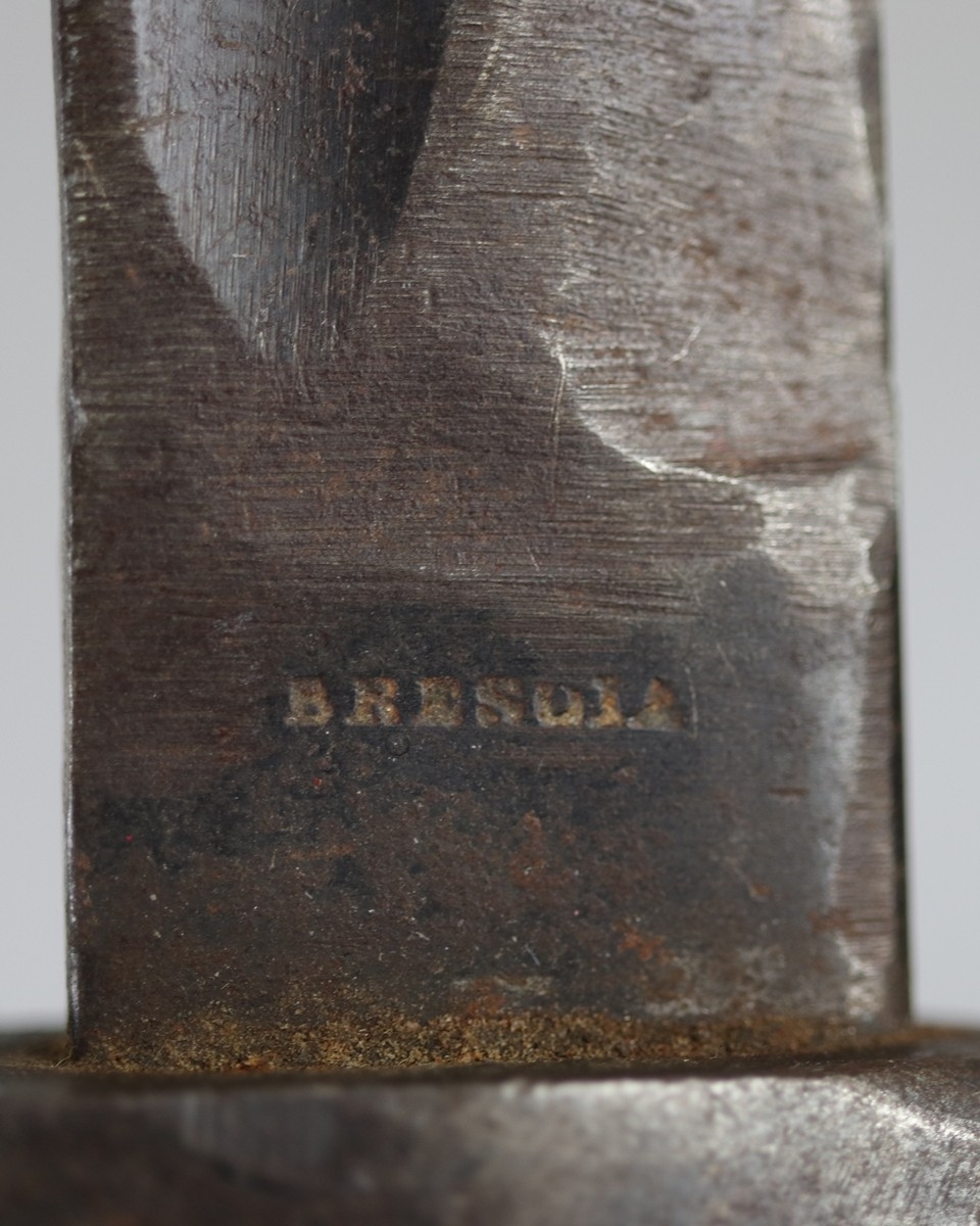 Italian M1870 Vetterli bayonet, on ricasso stamped 'BRESULA', and on crossguard indistinct stamp possibly 'BV'., same stamp on pommel. Quillon had been removed and blade shortened