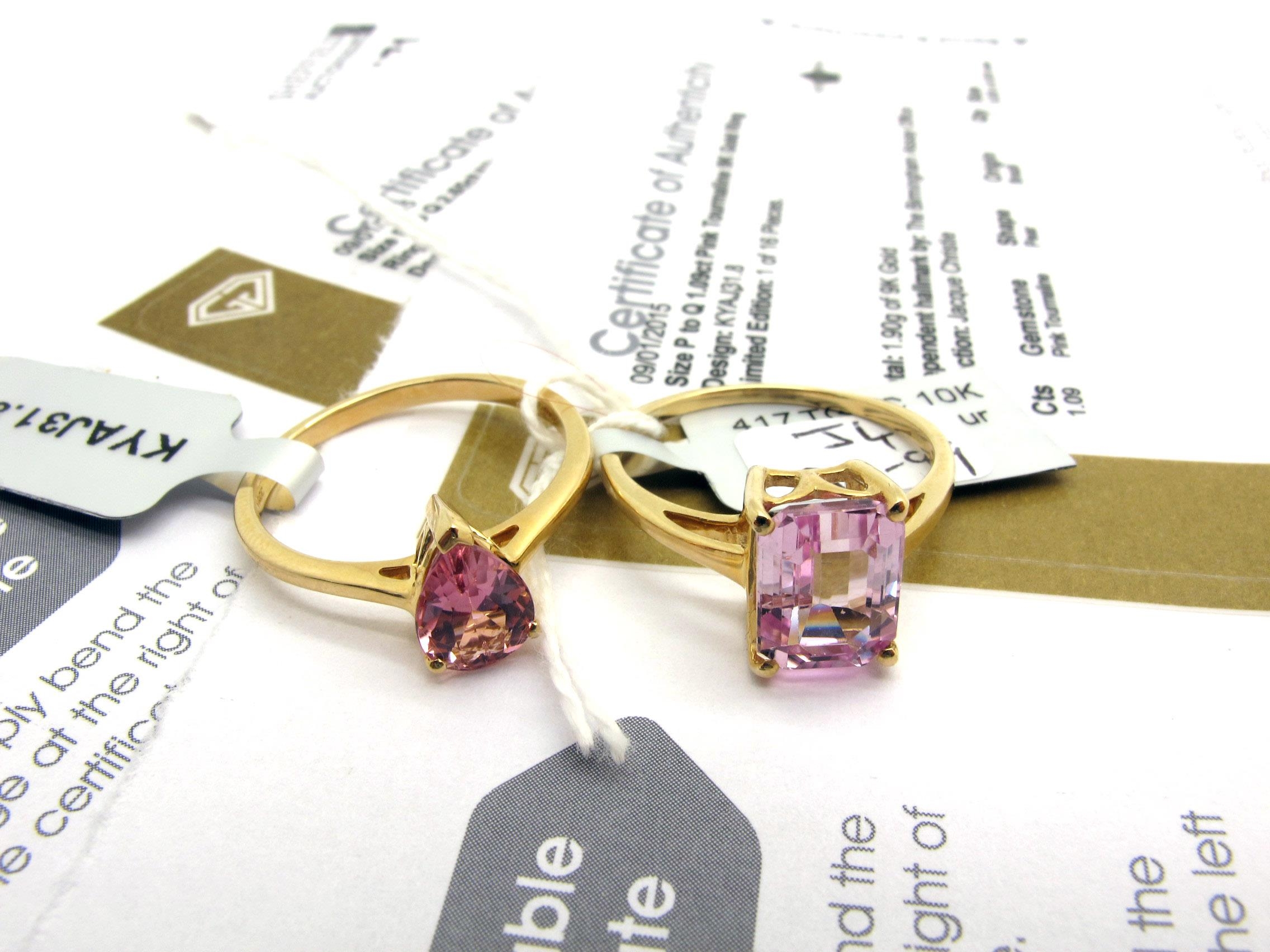 The Genuine Gemstone Company Ltd; A 9ct Gold 1.09ct Pink Tourmaline Single Stone Ring, the pear shape stone claw set, between plain shoulders (finger size P 1/2), A 9ct Gold 2.65ct Minas Gerais Kunzite single stone ring, the rectangular stone claw set, between plain shoulders (finger size Q) (total weight 4.5 grams) (2).