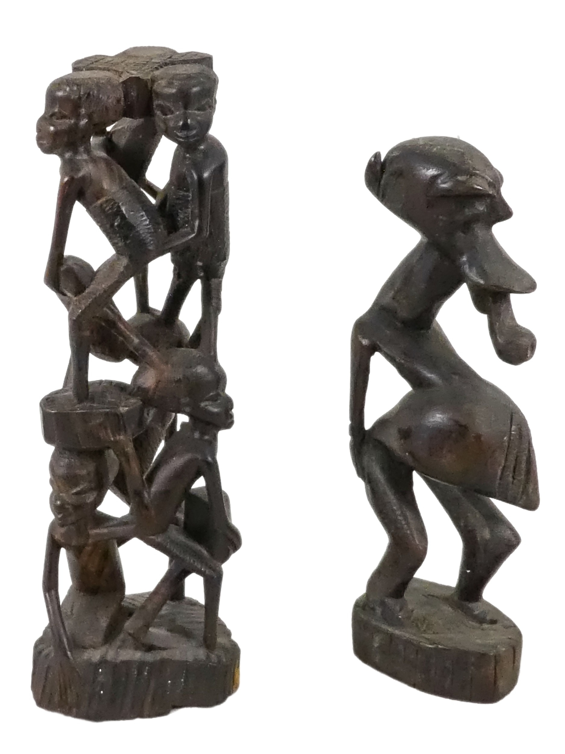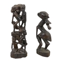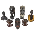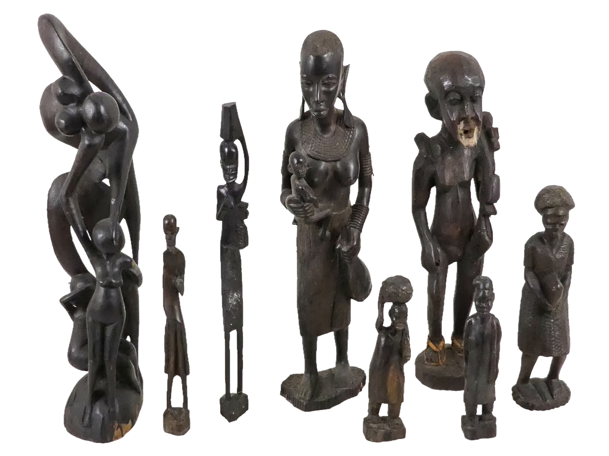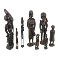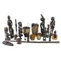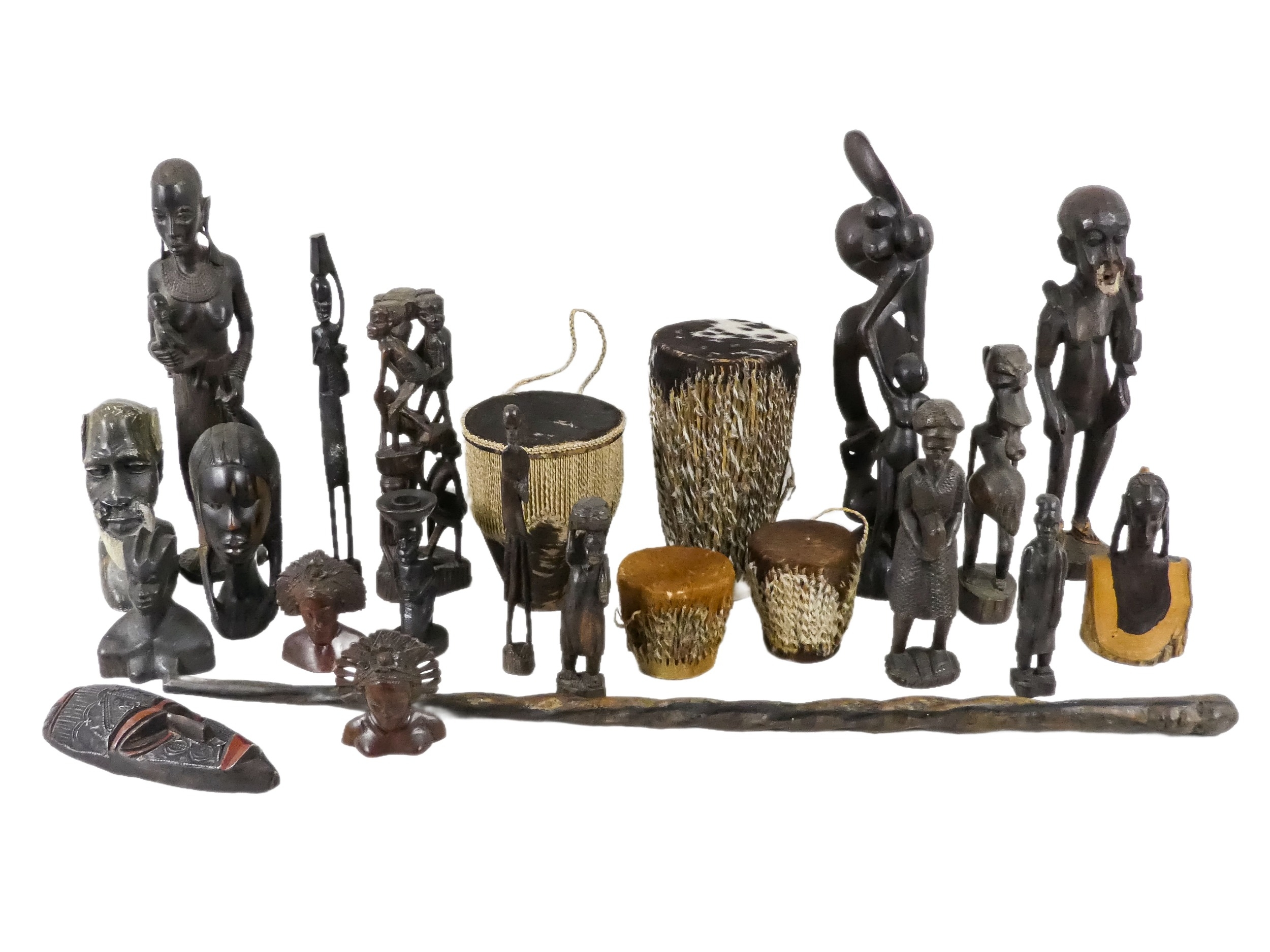 A collection of African carved hardwood figures - together with a walking cane, and four hide covered drums. (qty)