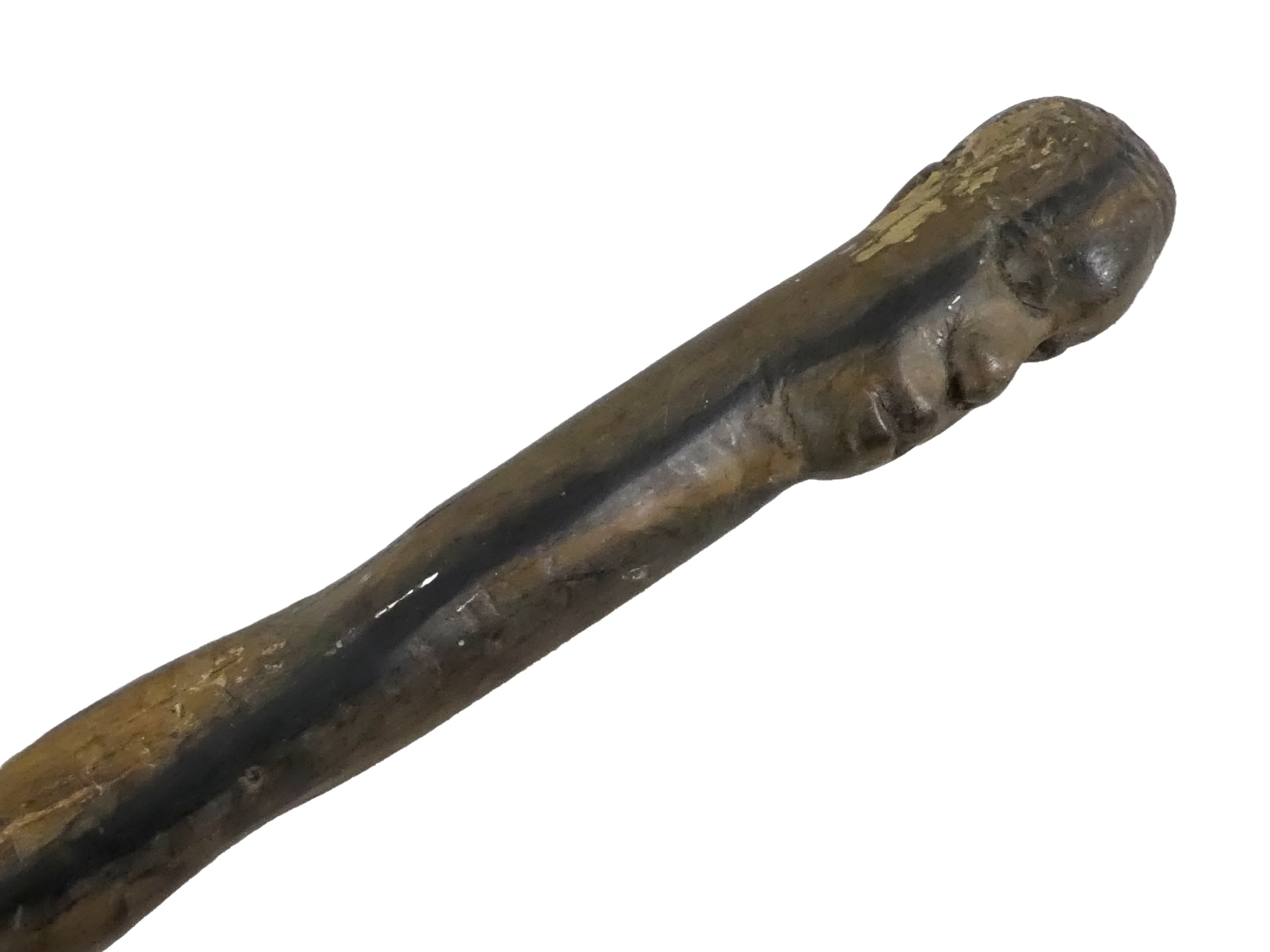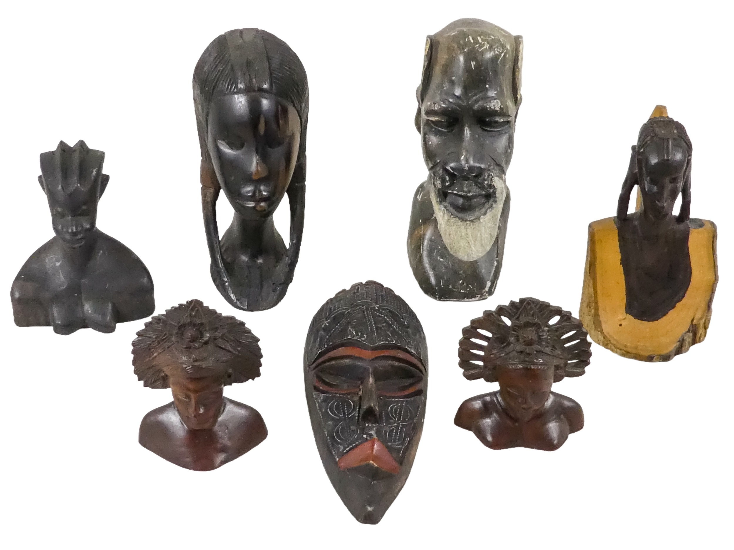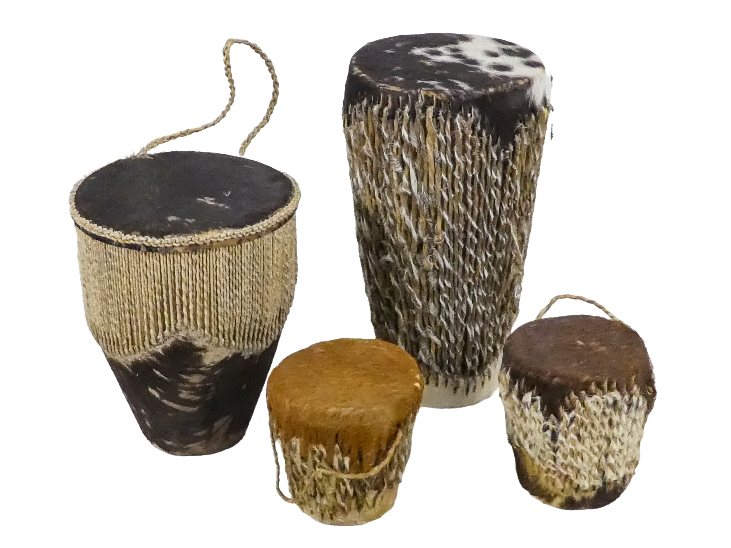 A collection of African carved hardwood figures - together with a walking cane, and four hide covered drums. (qty)