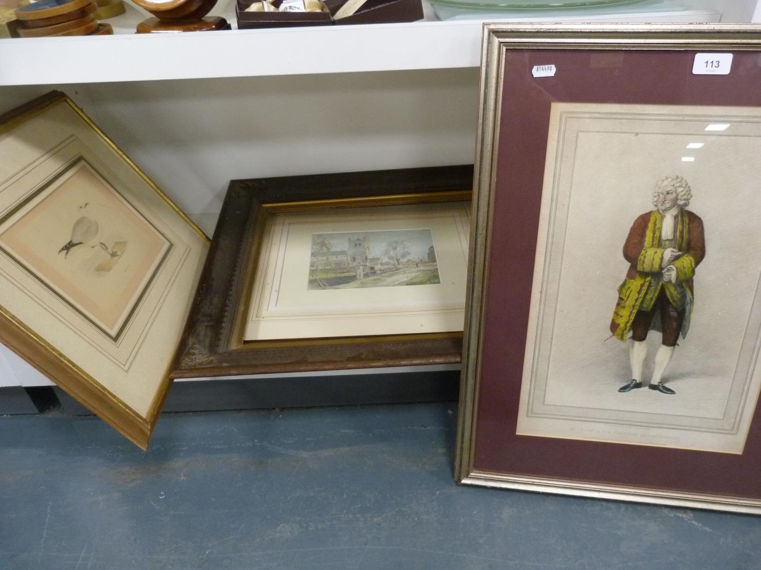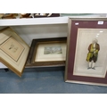 Mr Cooke as Sir Pertinax MacSycophant, print, picture of a common gull, modern picture signed DM, and a frame. (4)