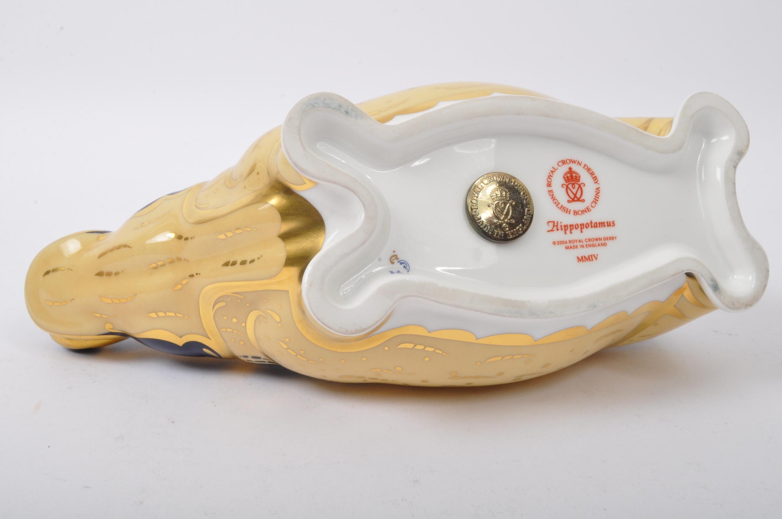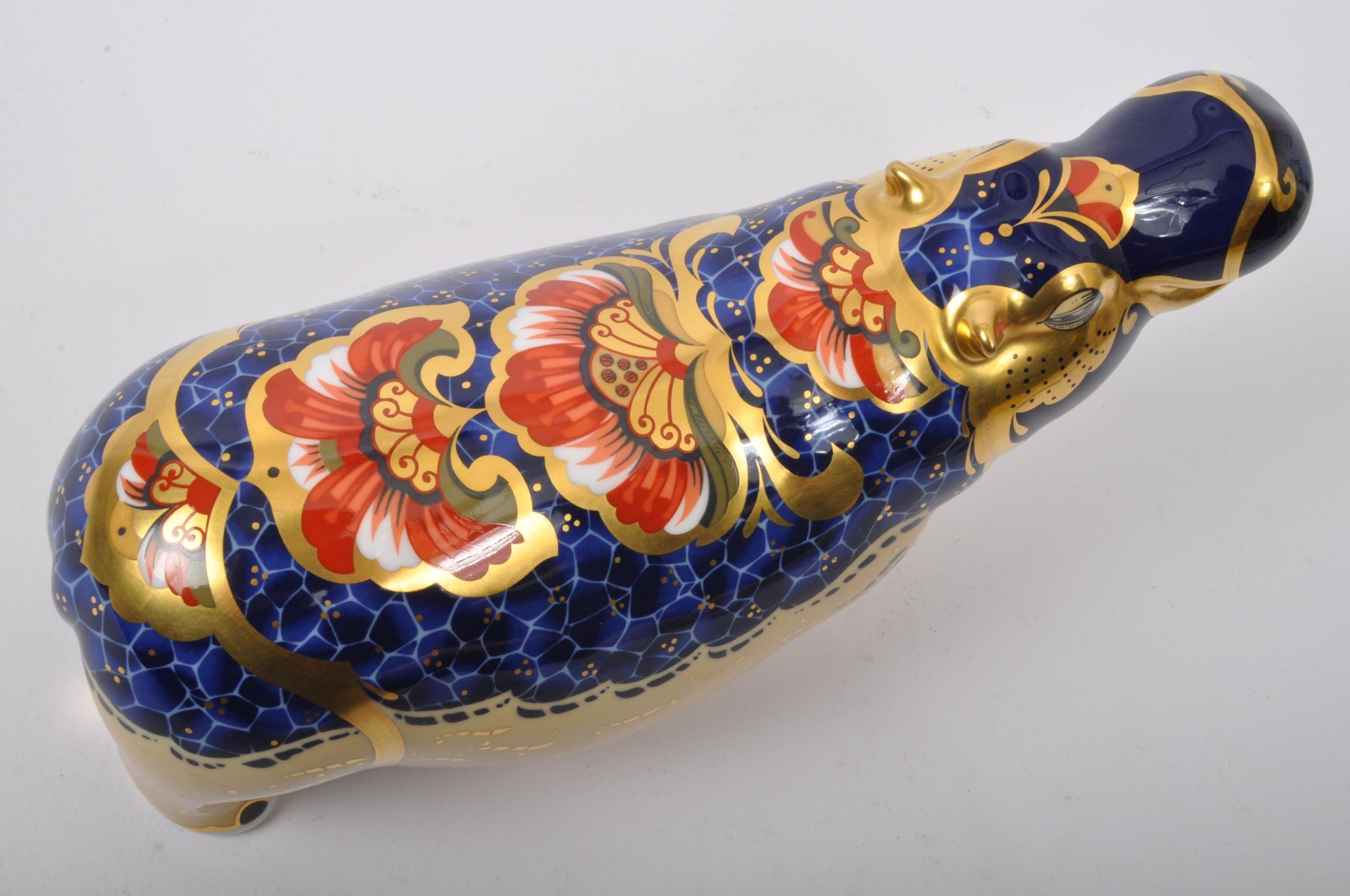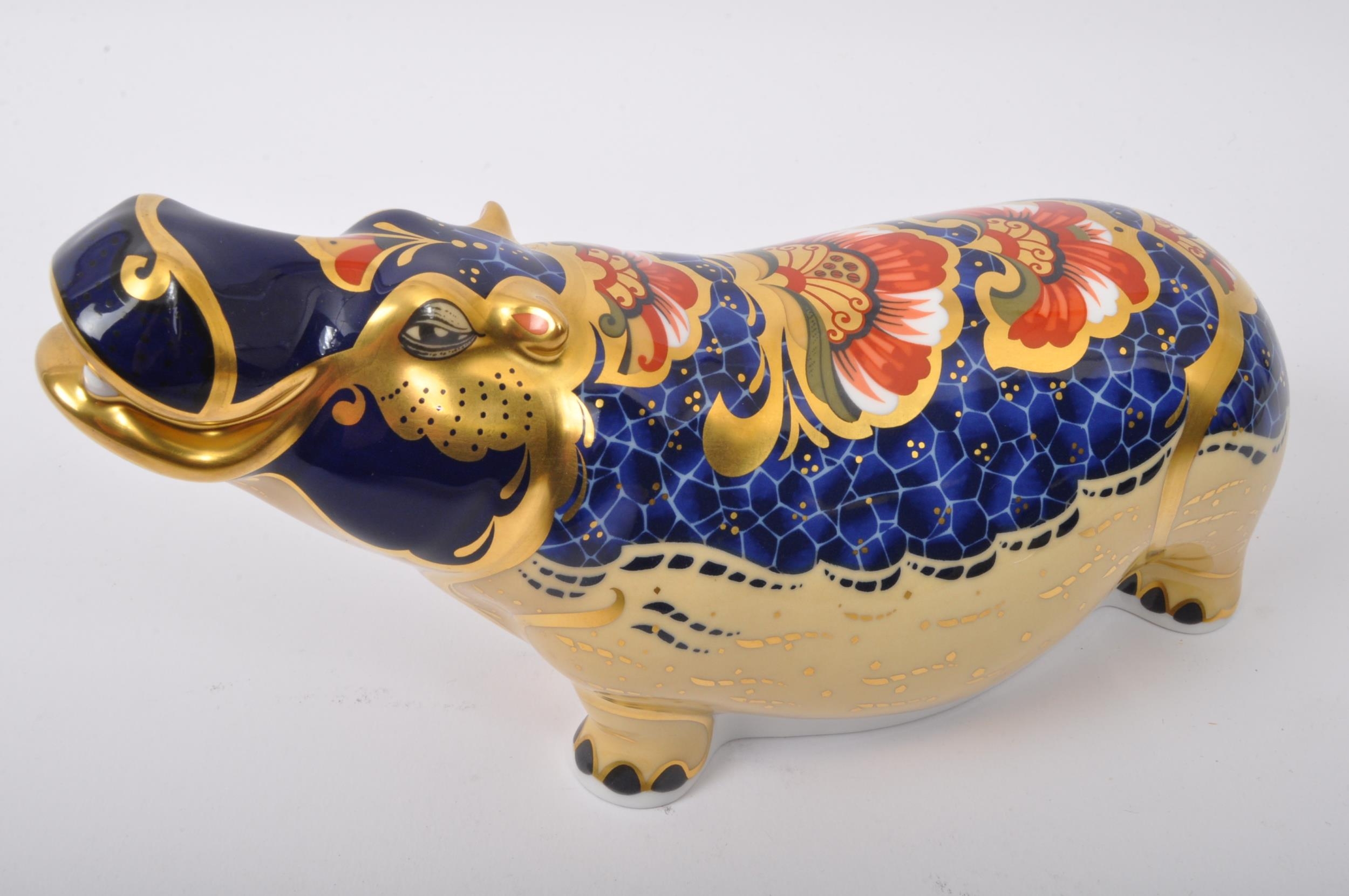 Royal Crown Derby - Hippopotamus - A vintage 20th century Royal Crown Derby bone china paperweight figure with gilded detailing and gold stopper. Good condition. Measures 21cm length.