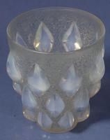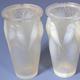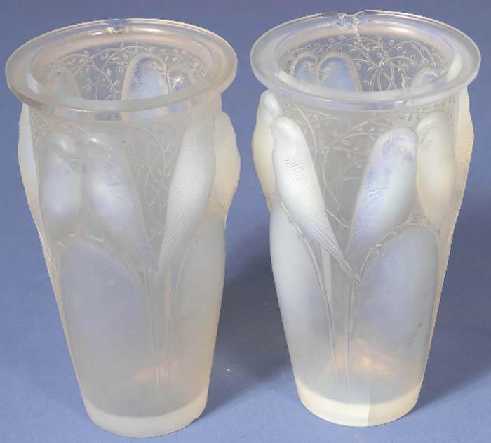 Pair of early Lalique blue iridescent glass vases showing budgerigars in relief - both chipped & one cracked, marked R Lalique (H24cm approx) -