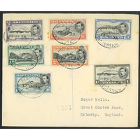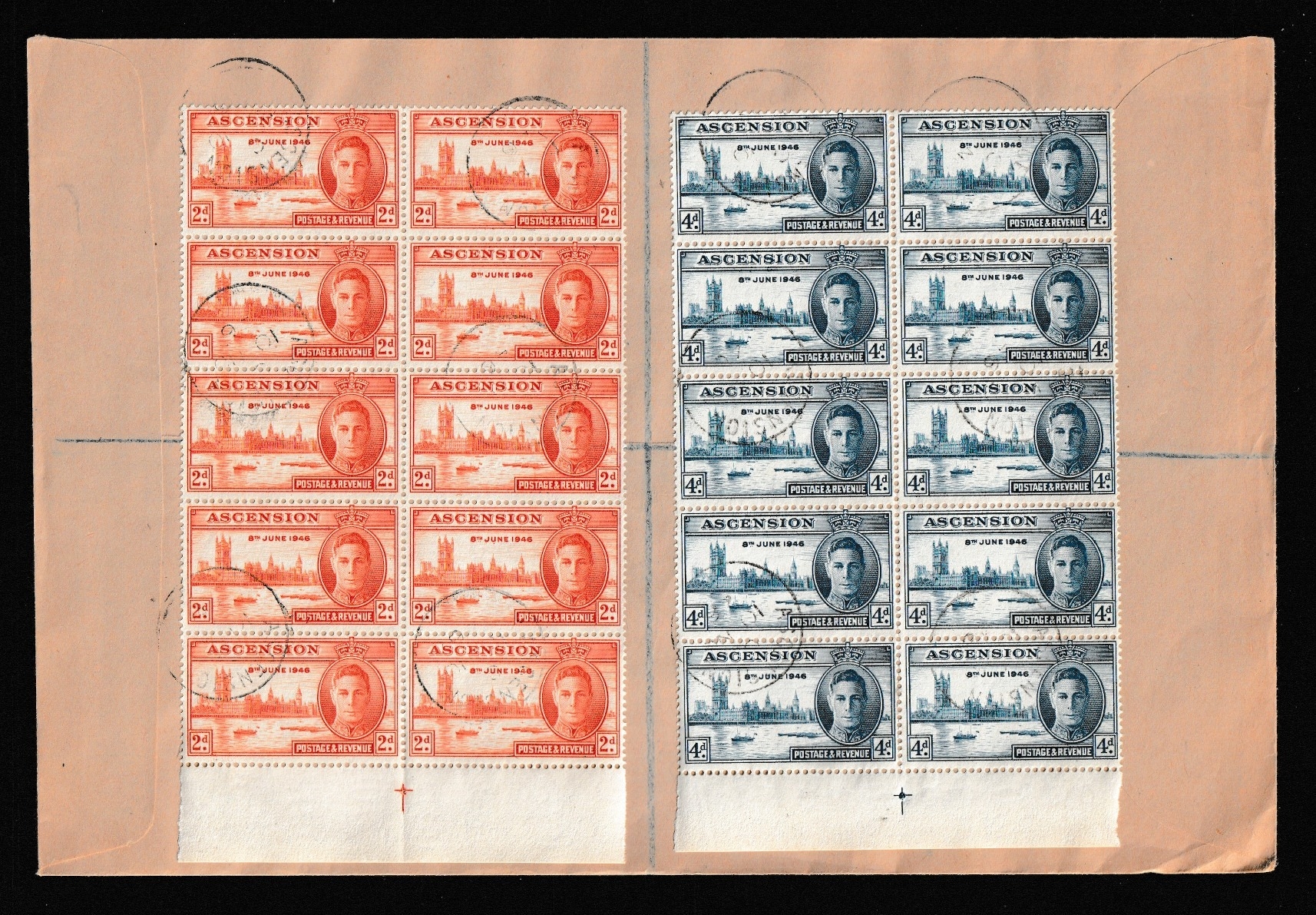 ASCENSION - 1946 Victory set of two on cover in blocks of 10 (2 on front, 2 on back) sent registered to Jamestown St Helena tied ASCENSION / C/ 10 NOV cds's. SG 48/9.