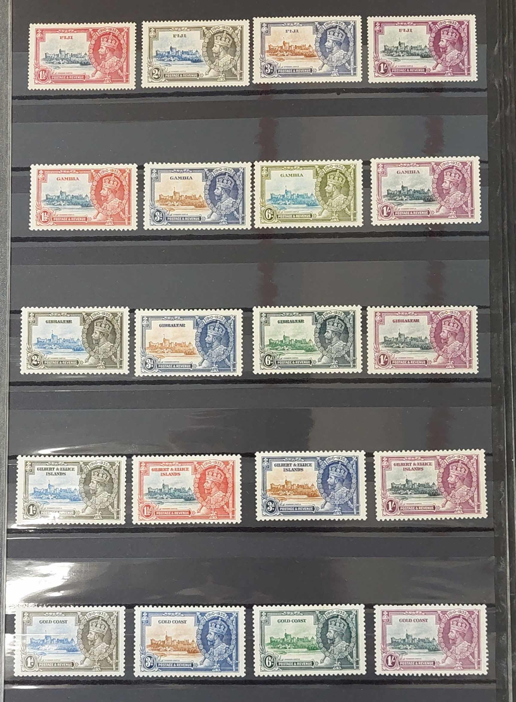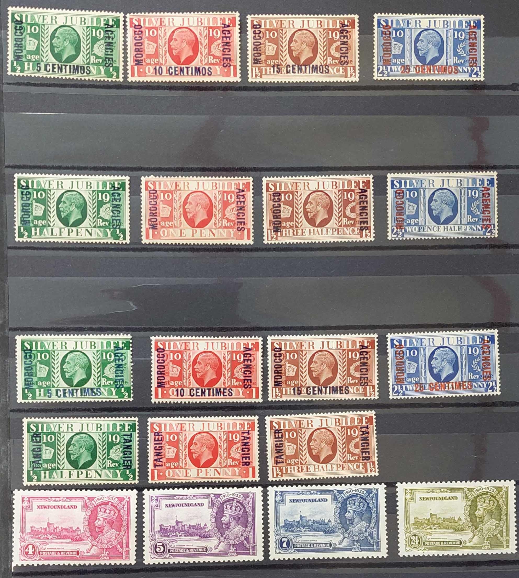 1935 MINT KGV SILVER JUBILEE, ETC.: A stock book containing 44 sets (inc. Australia, Canada x 2, Cook Islands, New Zealand, Papua, South Africa, South West Africa), plus some duplicate sets. Also, a stock page with 20 mint sets of the KGVI Coronation Omnibus.All very fine.Cross Reference: KGV ISSUES, KGVI ISSUES