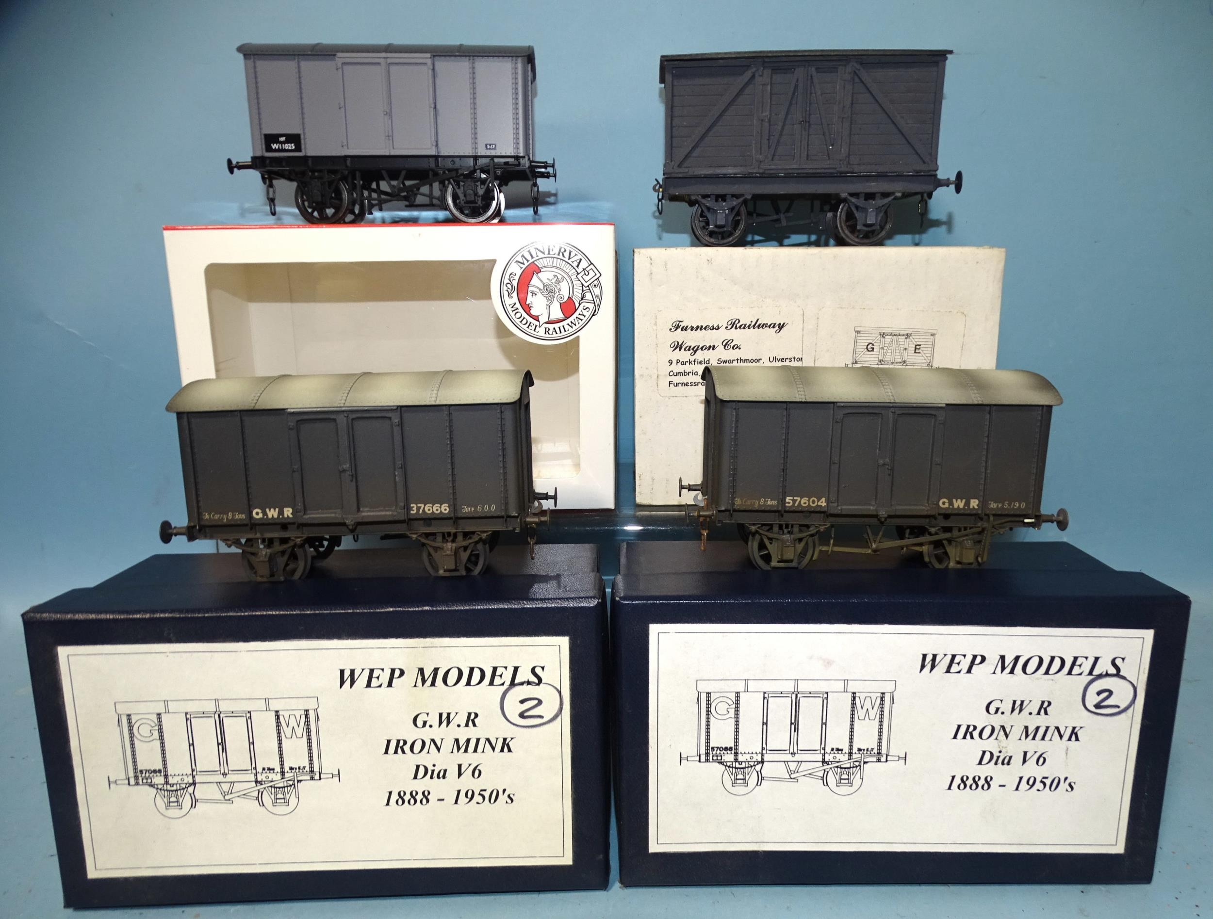 WEP Models, two GWR, Iron Mink, Dia V6 1888-1950's wagons, (boxed), a Furness Railway Wagon Co. 10T box van (a/f) and another boxed wagon by Minerva Model Railways Ltd, (4).
