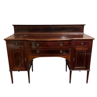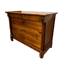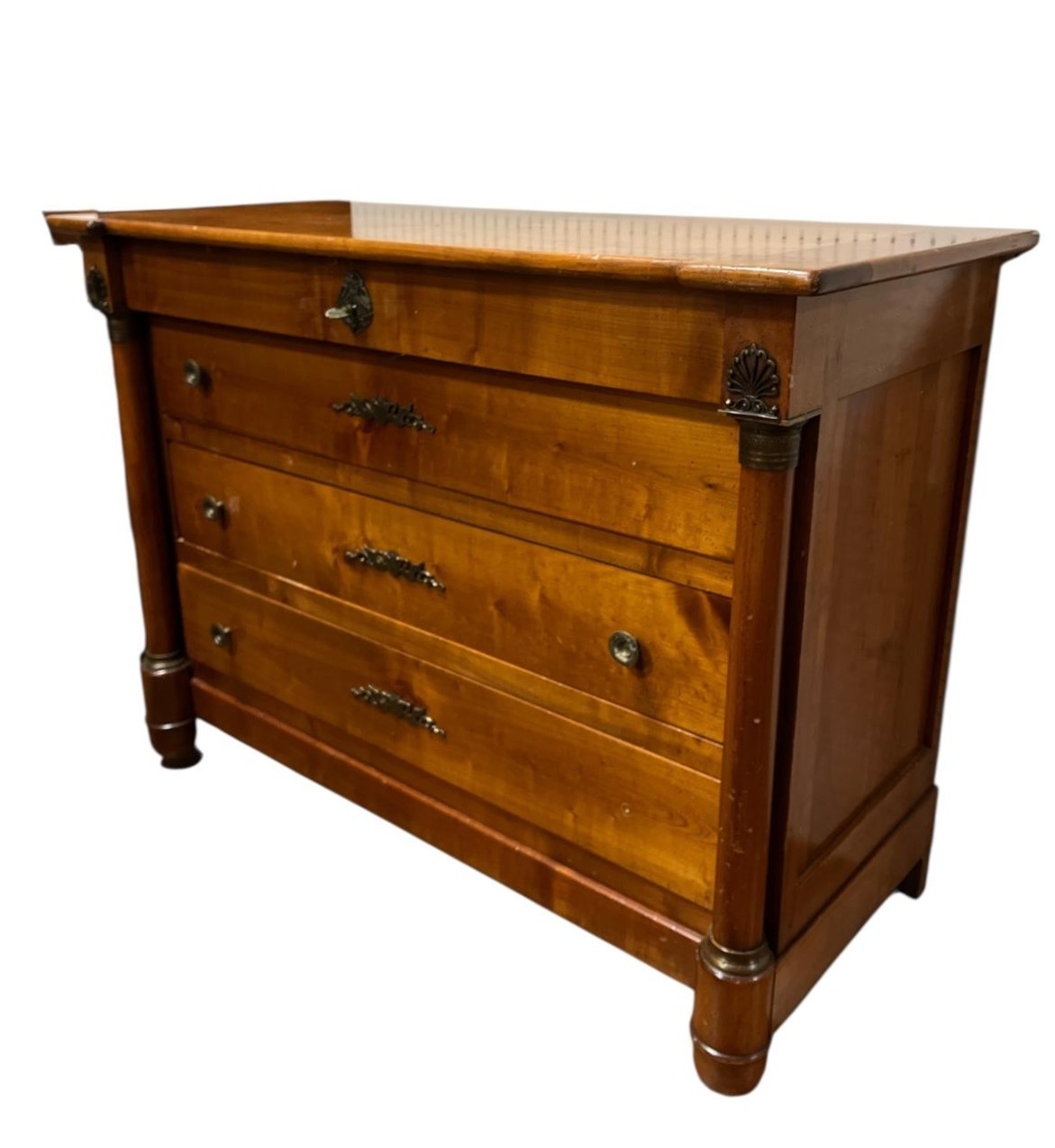 A BIEDERMEIER STYLE CHERRYWOOD CHEST of inverted breakfront outline the shaped top above four long graduated drawers between cylindrical columns with gilt brass mounts on bun feet 93cm (h) x 124cm (w) x 56cm (d)